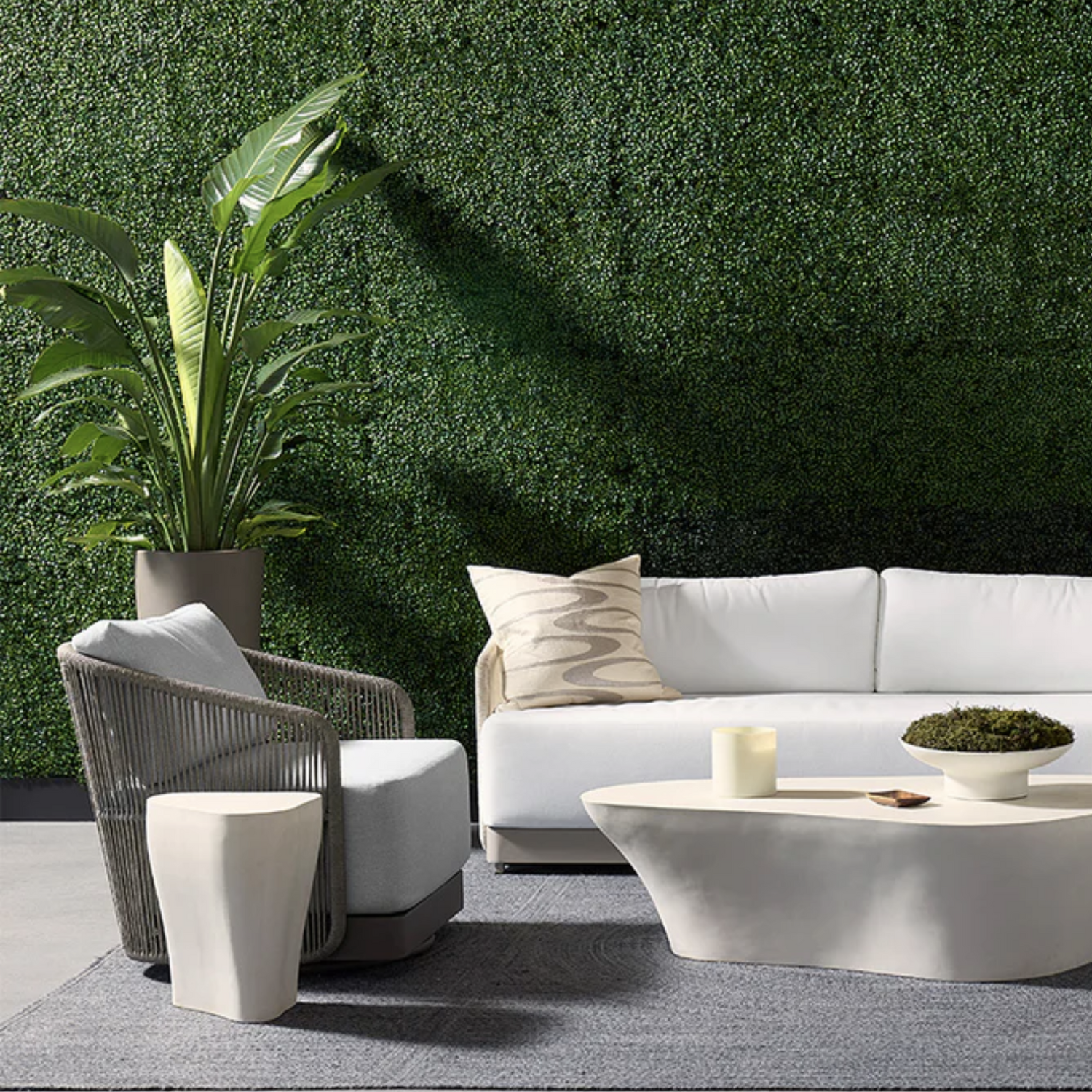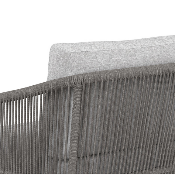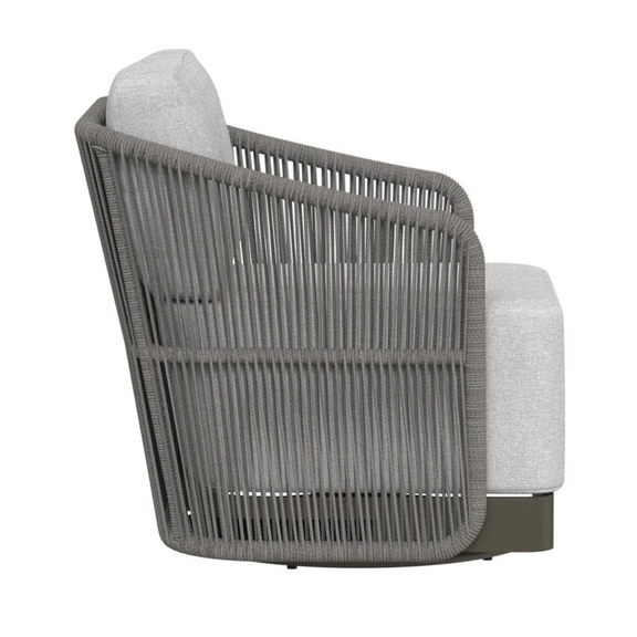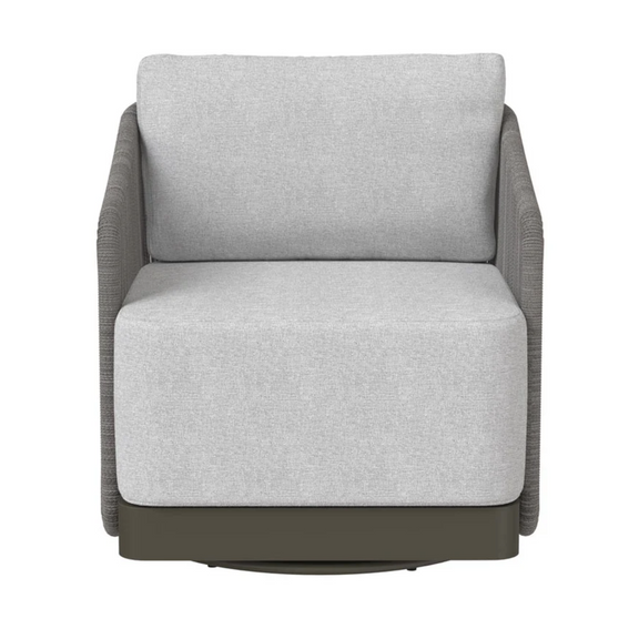 Introduce refined modern style outside with this impressive swivel armchair from the Outdoor by SUNPAN collection. Upholstered in gracebay light grey fabric with a powder-coated warm grey aluminum frame. Completed with grey rope weaving on the seat exterior.