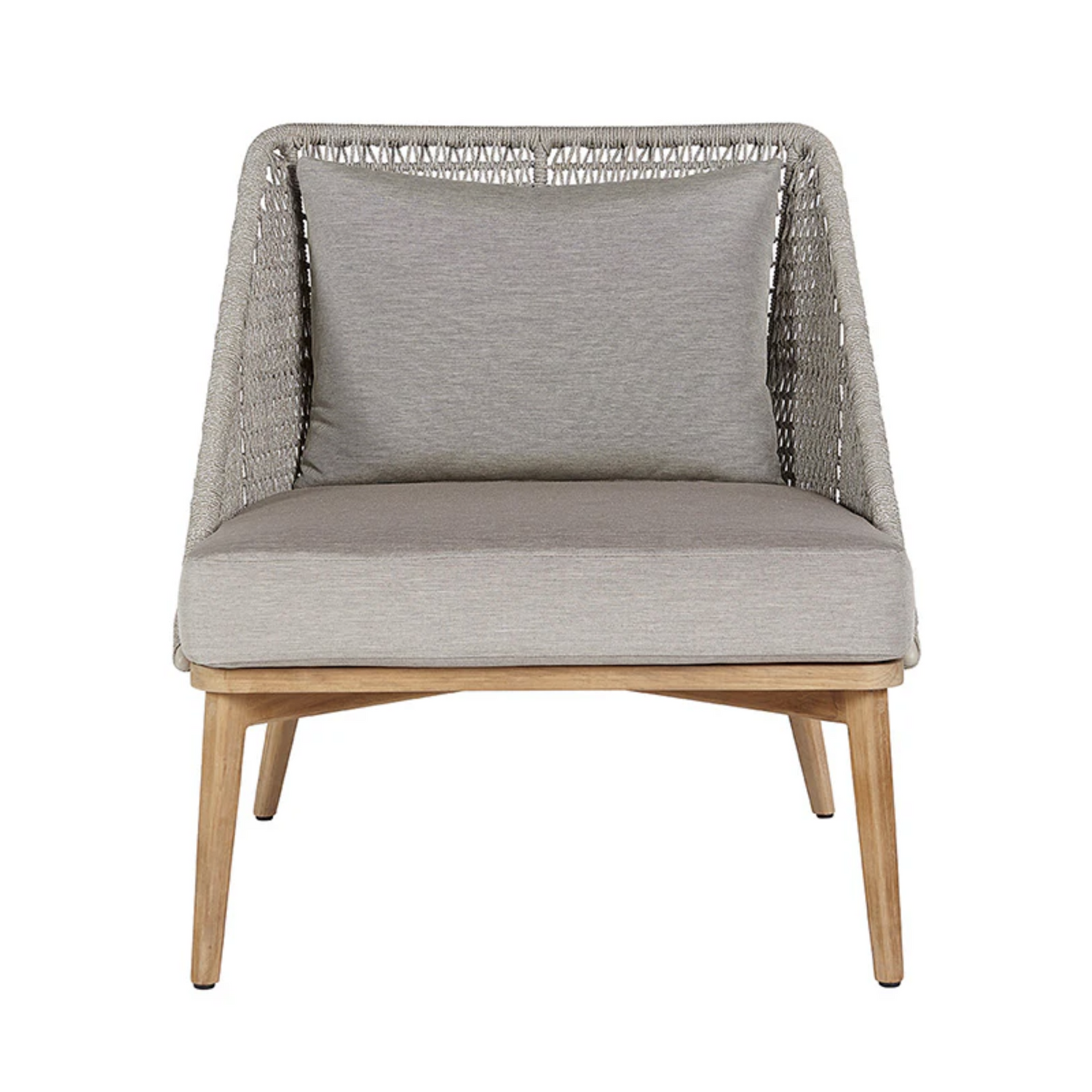 Lose track of time while relaxing in this outdoor lounge chair from the new Outdoor by SUNPAN collection. This modern design features a tapered seatback covered in greymix weave with a palazzo taupe seat and natural teak wood base. Suitable for indoor and covered outdoor spaces.