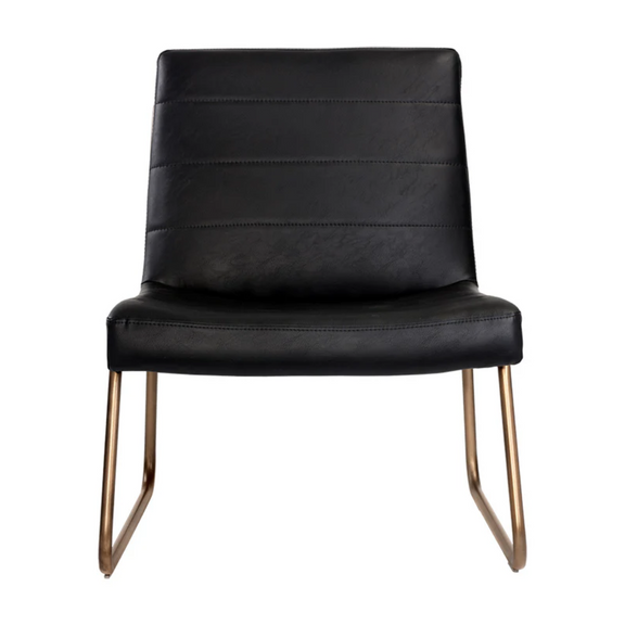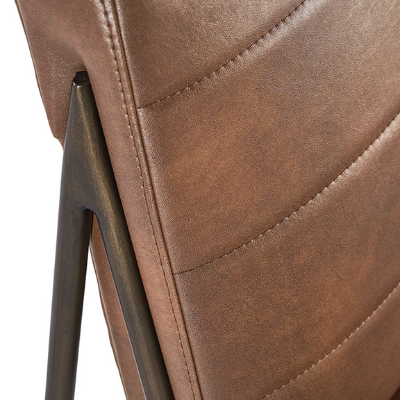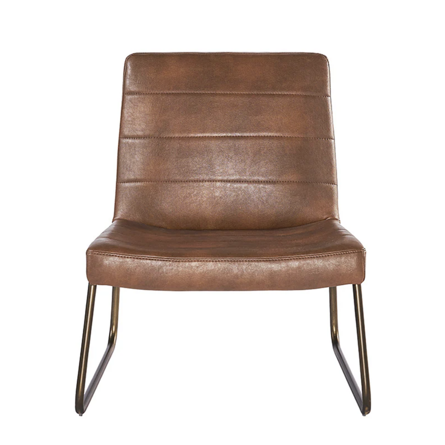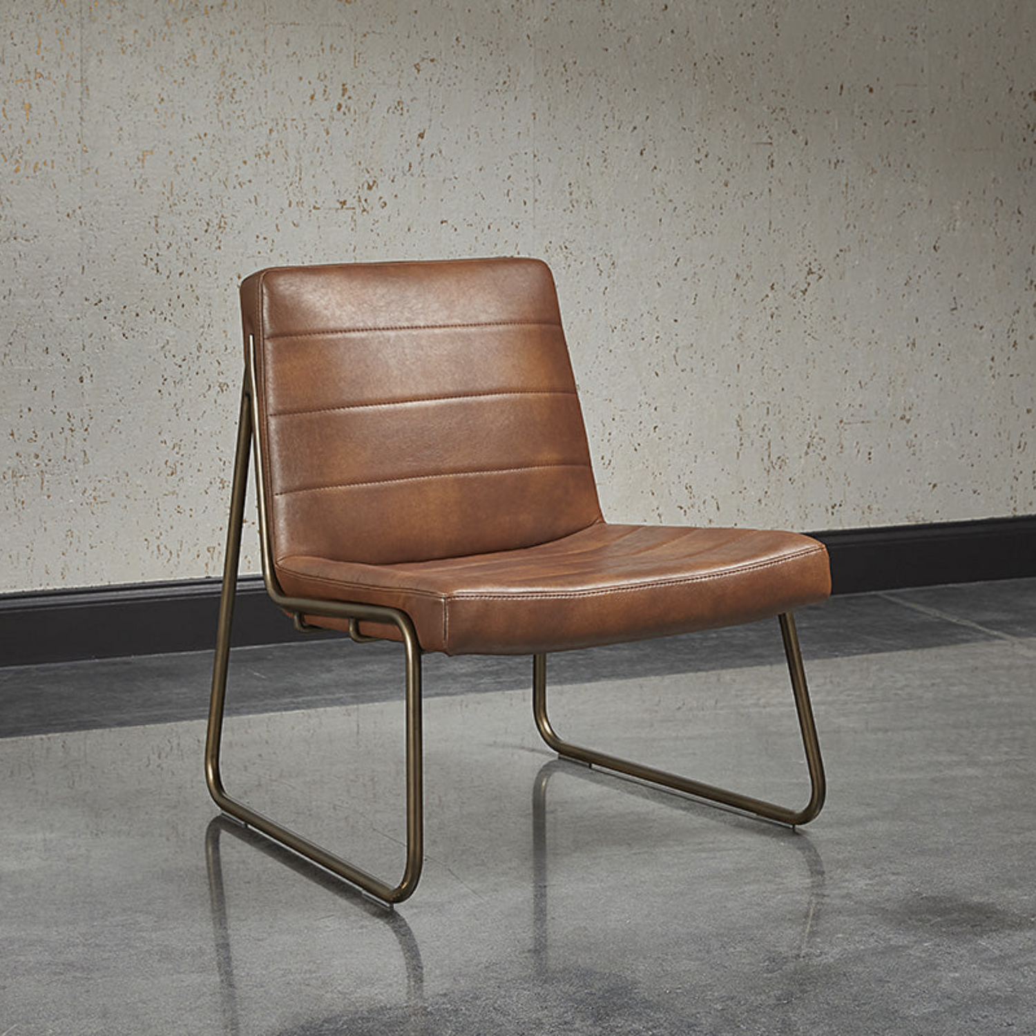 A handsomely designed lounge chair with a sculpted seat and seatback for comfort and style. Stocked in bravo cognac faux leather with an exposed rustic bronze steel cantilever frame. Can be placed in urban and contemporary dining and office spaces.