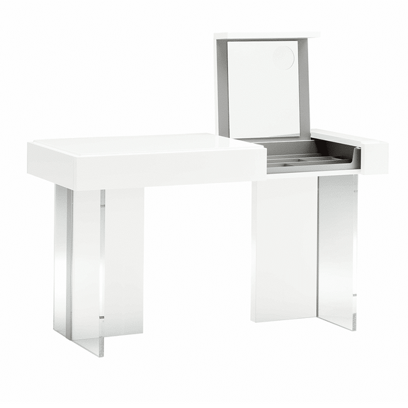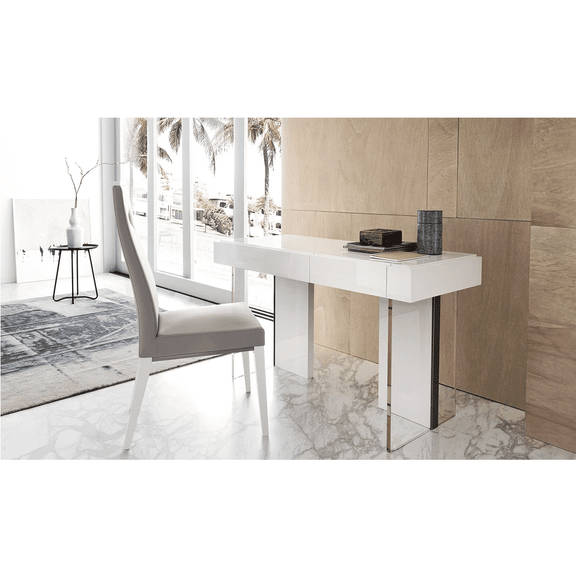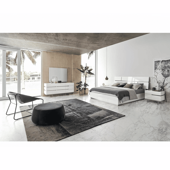 High gloss Bianco lacquer and metal profiles define this collection made up of bed, bedside tables, dresser, mirror, wardrobes and vanity unit.