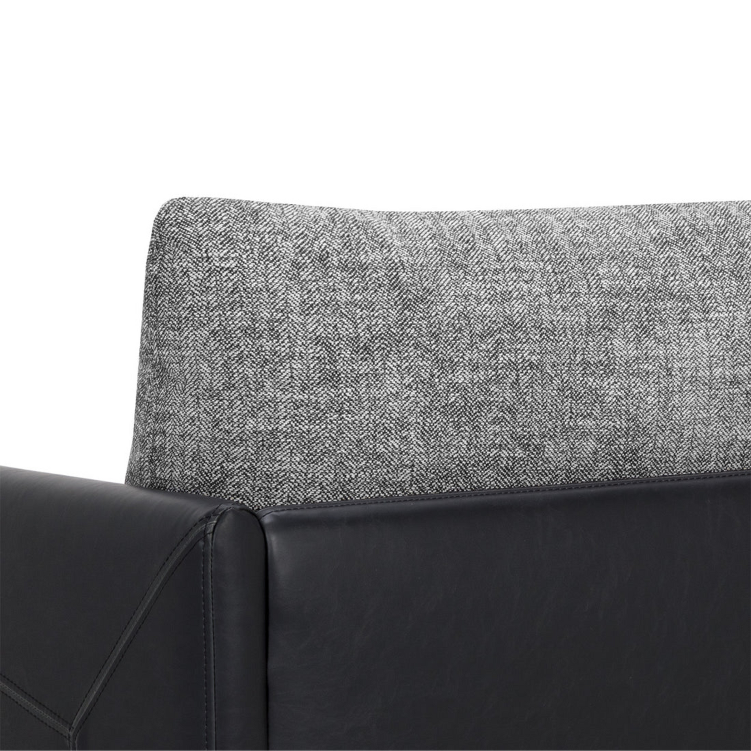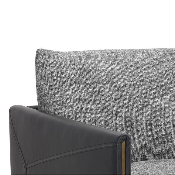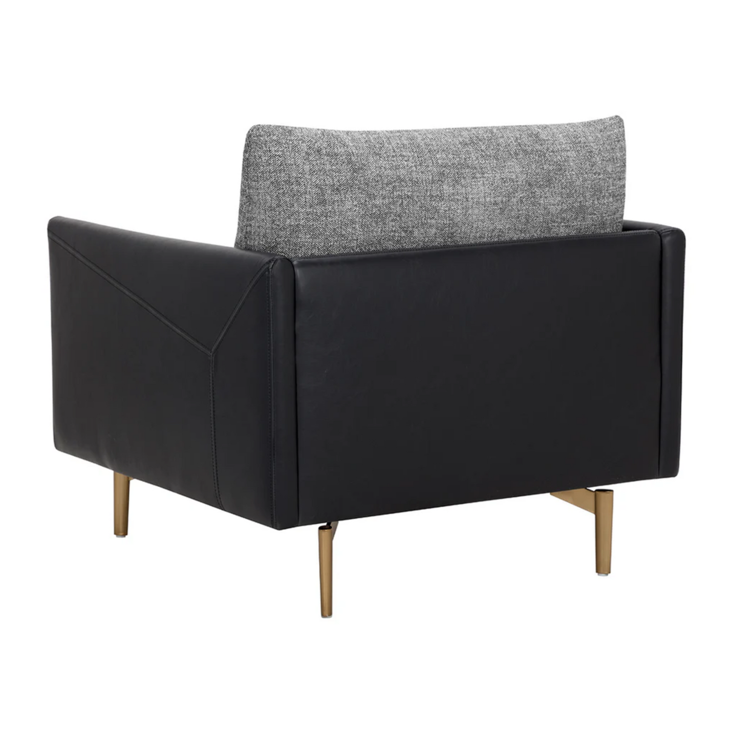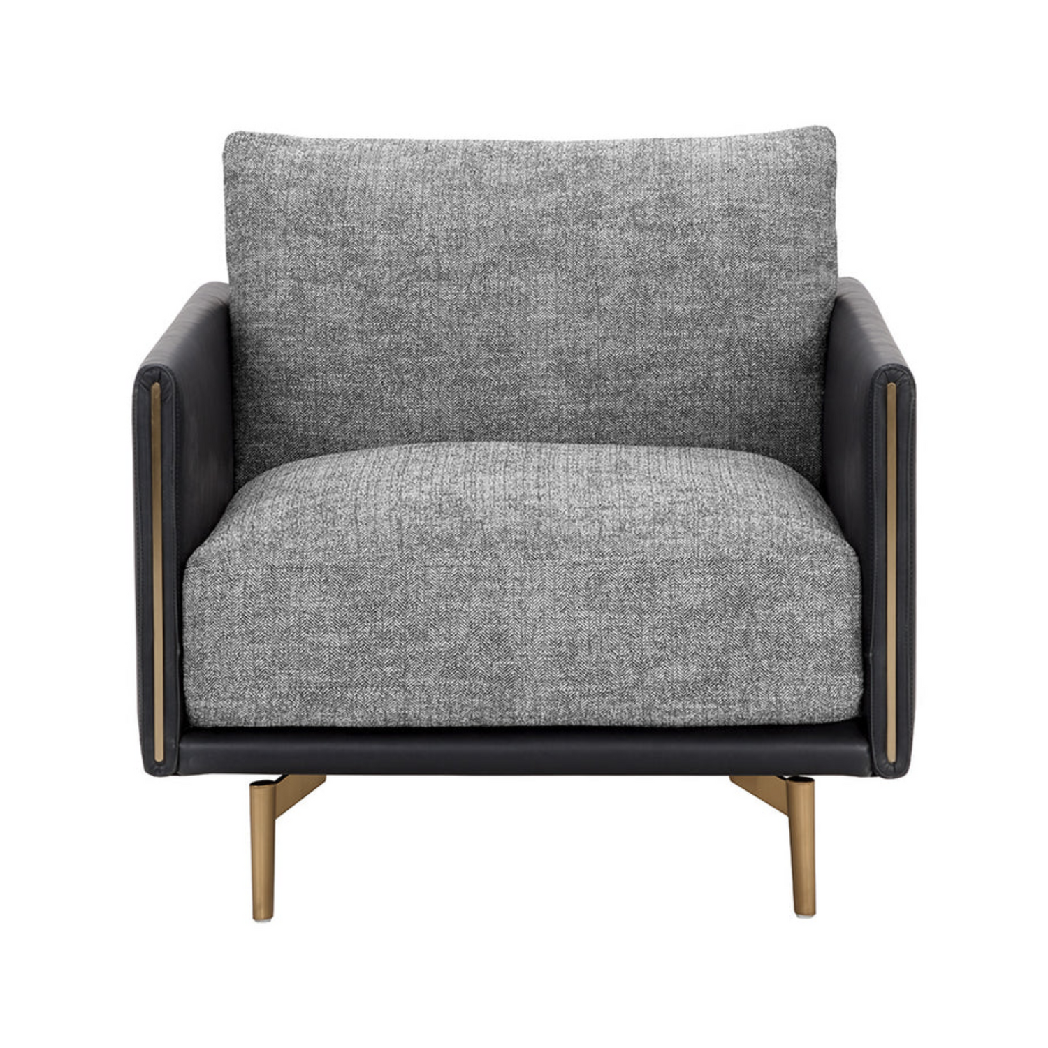 Mixed materials and contrasting colours give the Ashi Armchair an elevated design. Soft cushioning upholstered in nash zebra fabric provides ample comfort. Stitched detailing on the side of the arms gives a subtle geometric design that enhances the coal black faux leather frame. Satin brass aluminum on the legs and trim on the front of the arms ties the look together. Handle With Care: This design has been crafted with faux leather. Faux leather is manufactured to reflect the natural characteristics of leather; as such, colour variations, markings, wrinkles, grooves, and light scratches are appreciated characteristics. No two pieces will be alike.