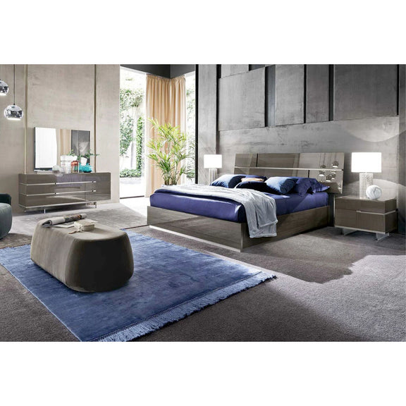 The Greige whitewood high gloss finish and metal profiles define this collection that includes bed, dresser, bedside tables, drawer unit, mirror, wardrobes and vanity unit. The clear methacrylate feet add lightness to the whole piece.