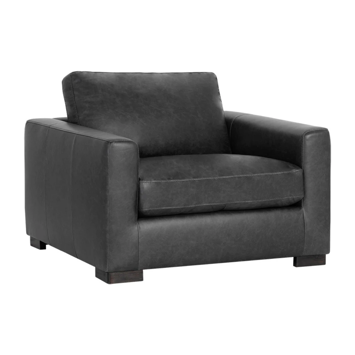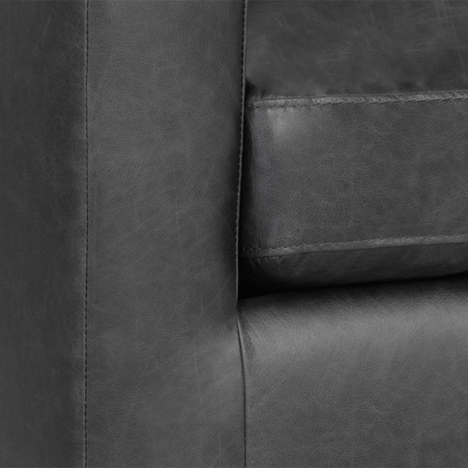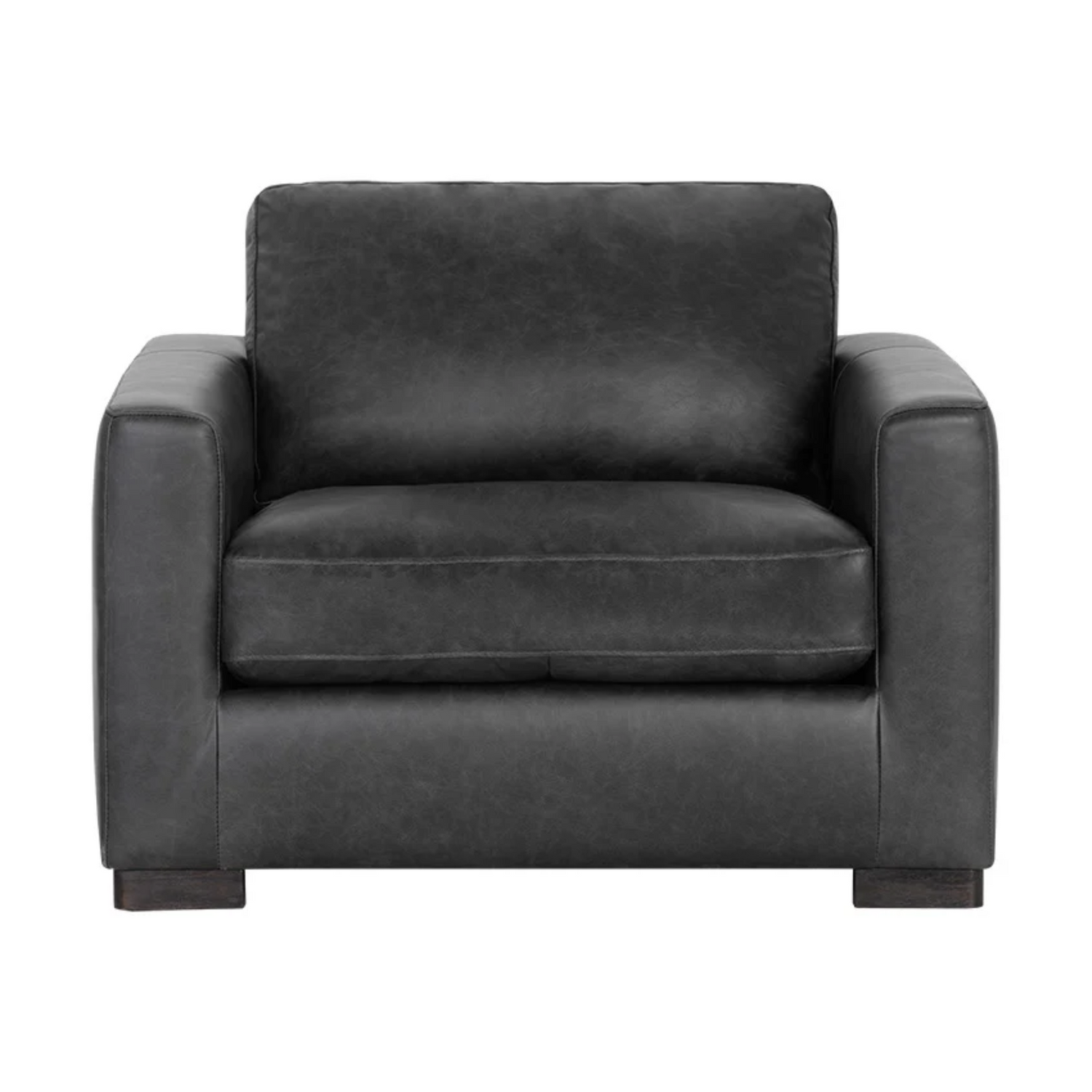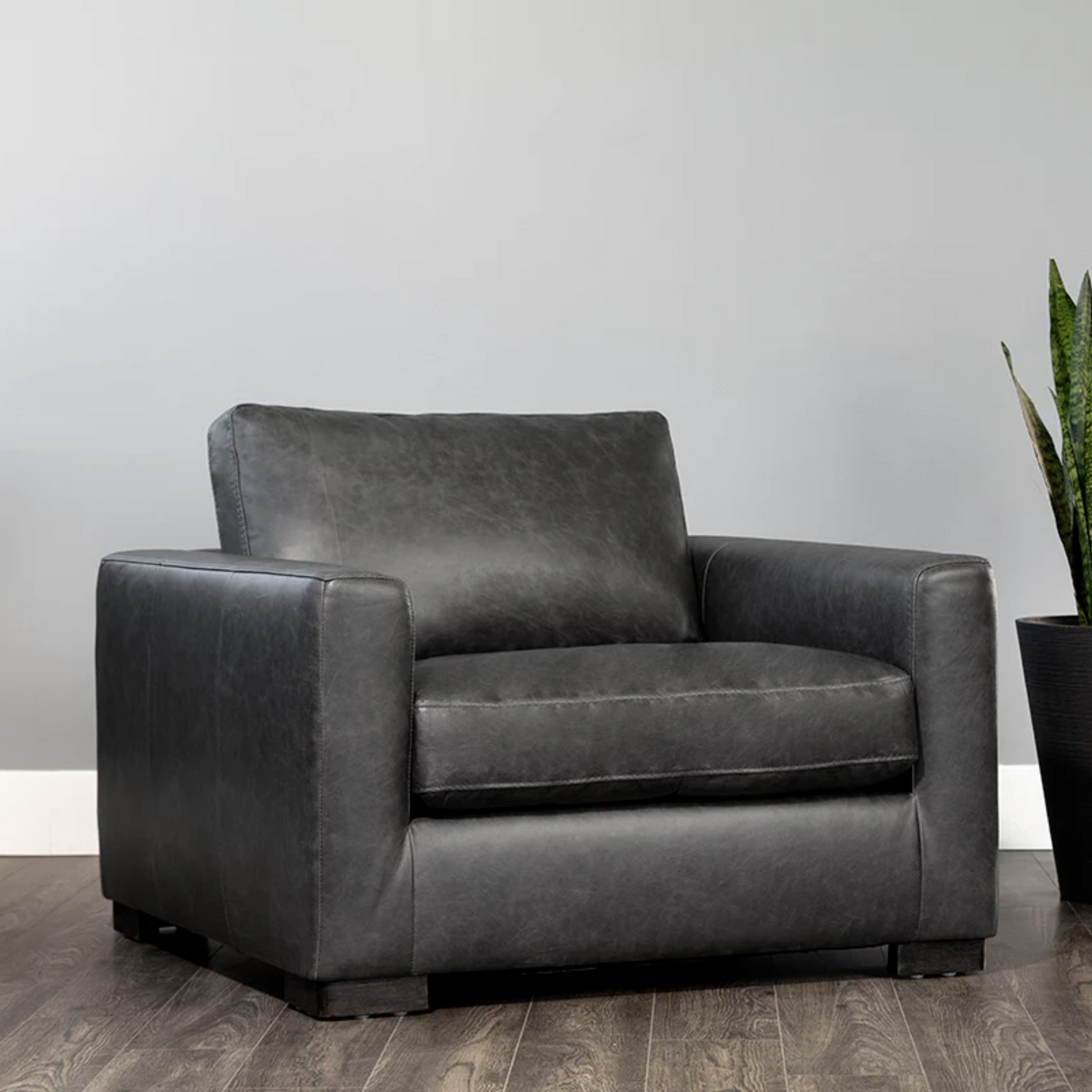 Bring an effortless sophistication to living and lounge environments with this beautiful armchair. Features a classic frame with a contemporary flair. Stock in marseille black and camel leather. Coordinating sofa also available. Handle with Care: This design has been crafted with 100% buffalo leather. Leather is a natural material; as such markings, wrinkles, grooves and light scratches are acceptable and appreciated characteristics. No two pieces are alike.