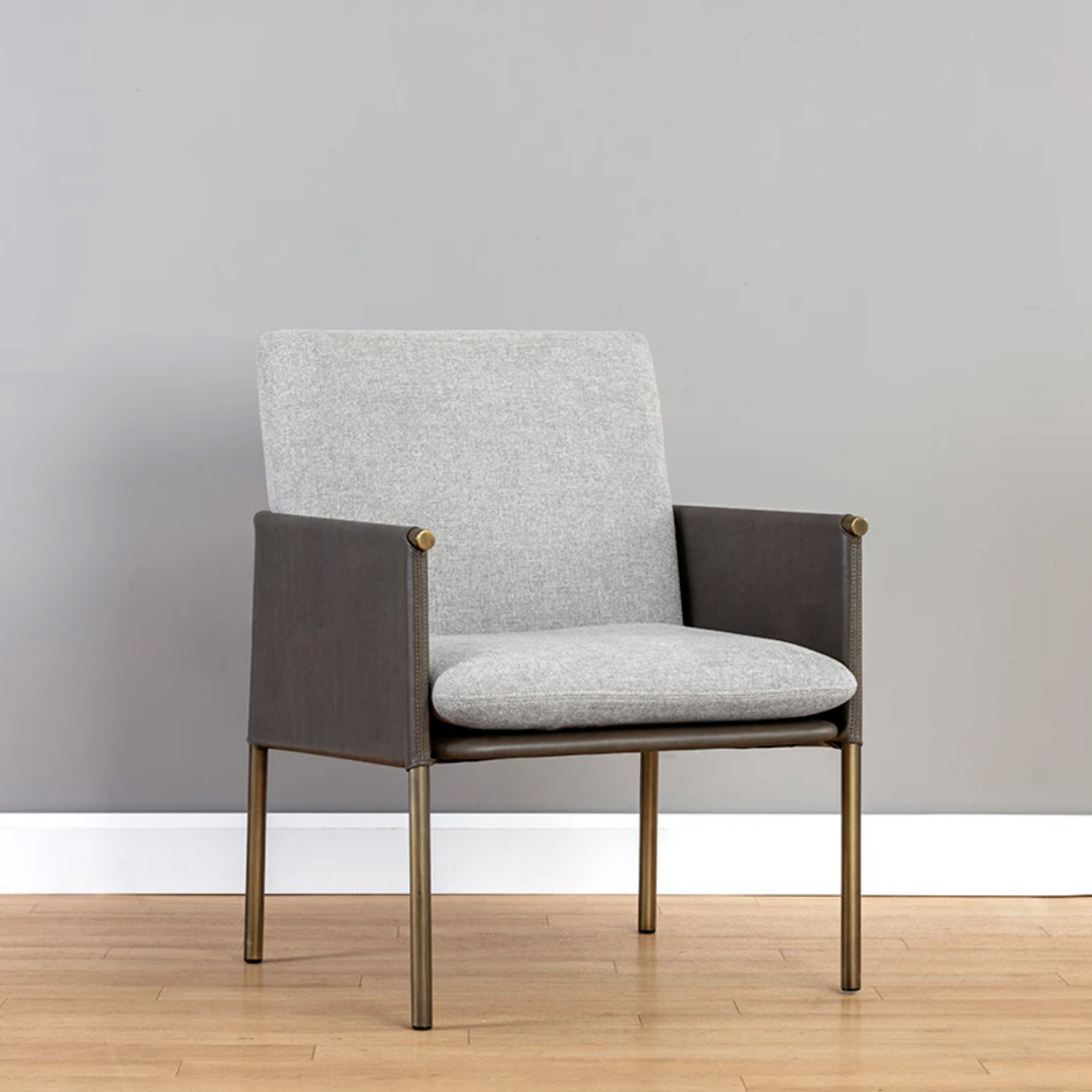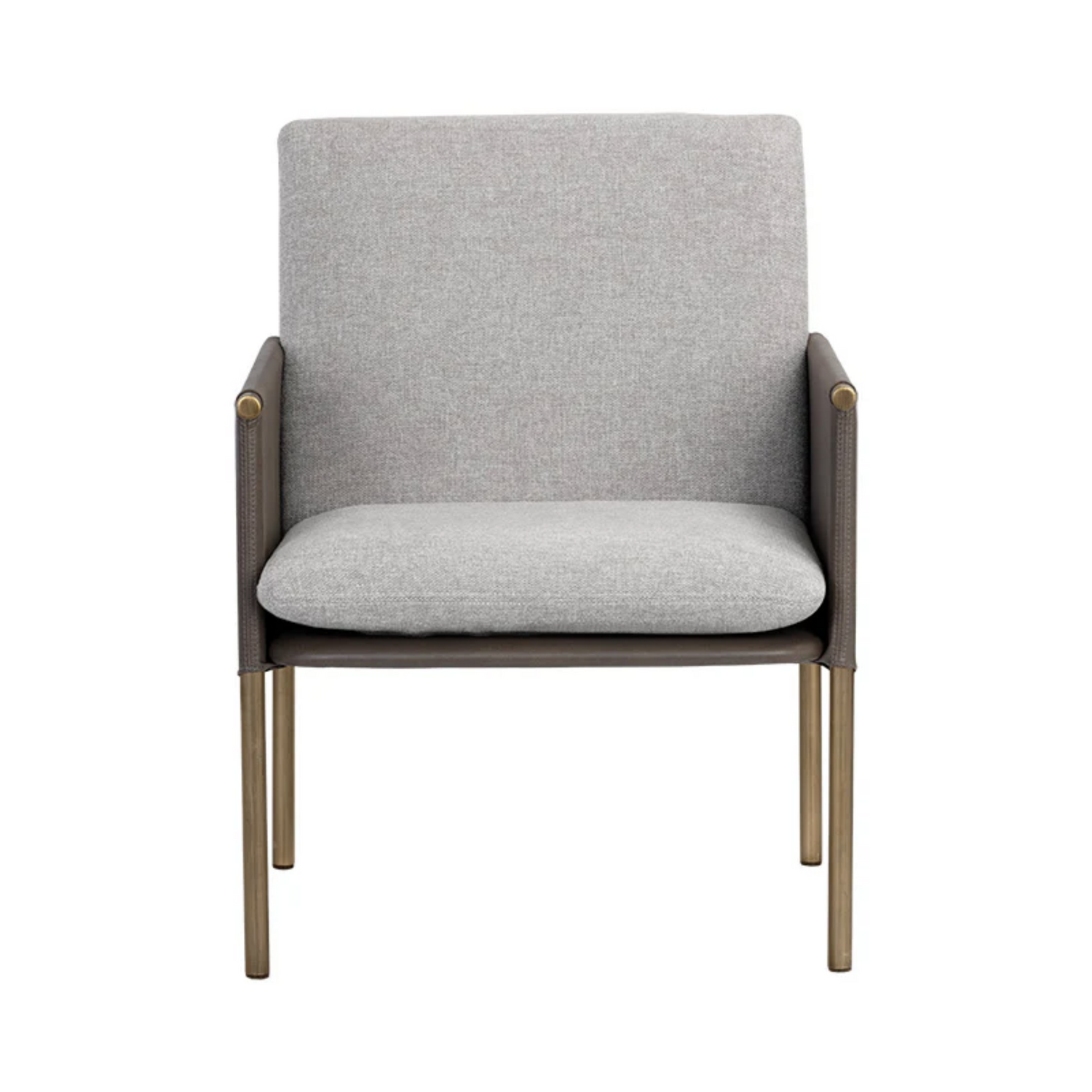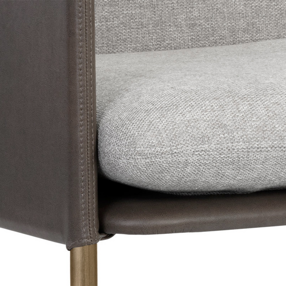A beautiful upholstered lounge chair crafted with an intriguing mixture of textures and materials. Features a belfast grey fabric seat with a contrasting bravo ash faux leather exterior and antique brass frame. Can be paired with coordinating bench. Handle With Care: This design has been crafted with faux leather. Faux leather is manufactured to reflect the natural characteristics of leather; as such, color variations, markings wrinkles, grooves, and light scratches are appreciated characteristics. No two pieces will be alike.