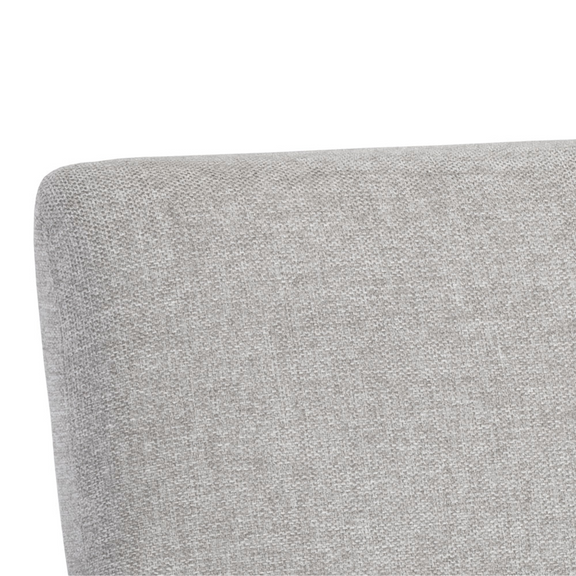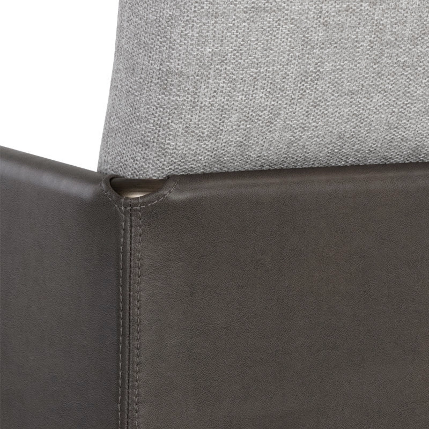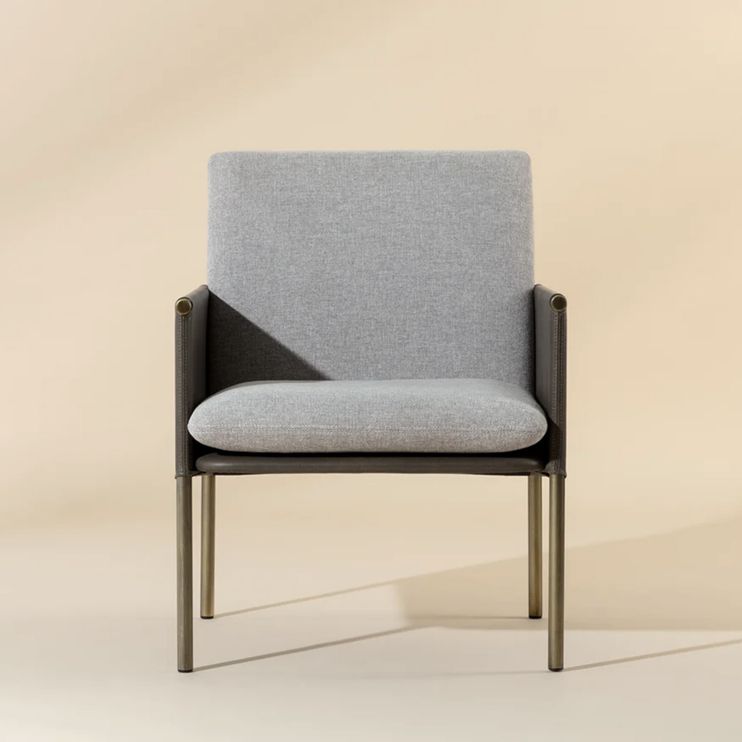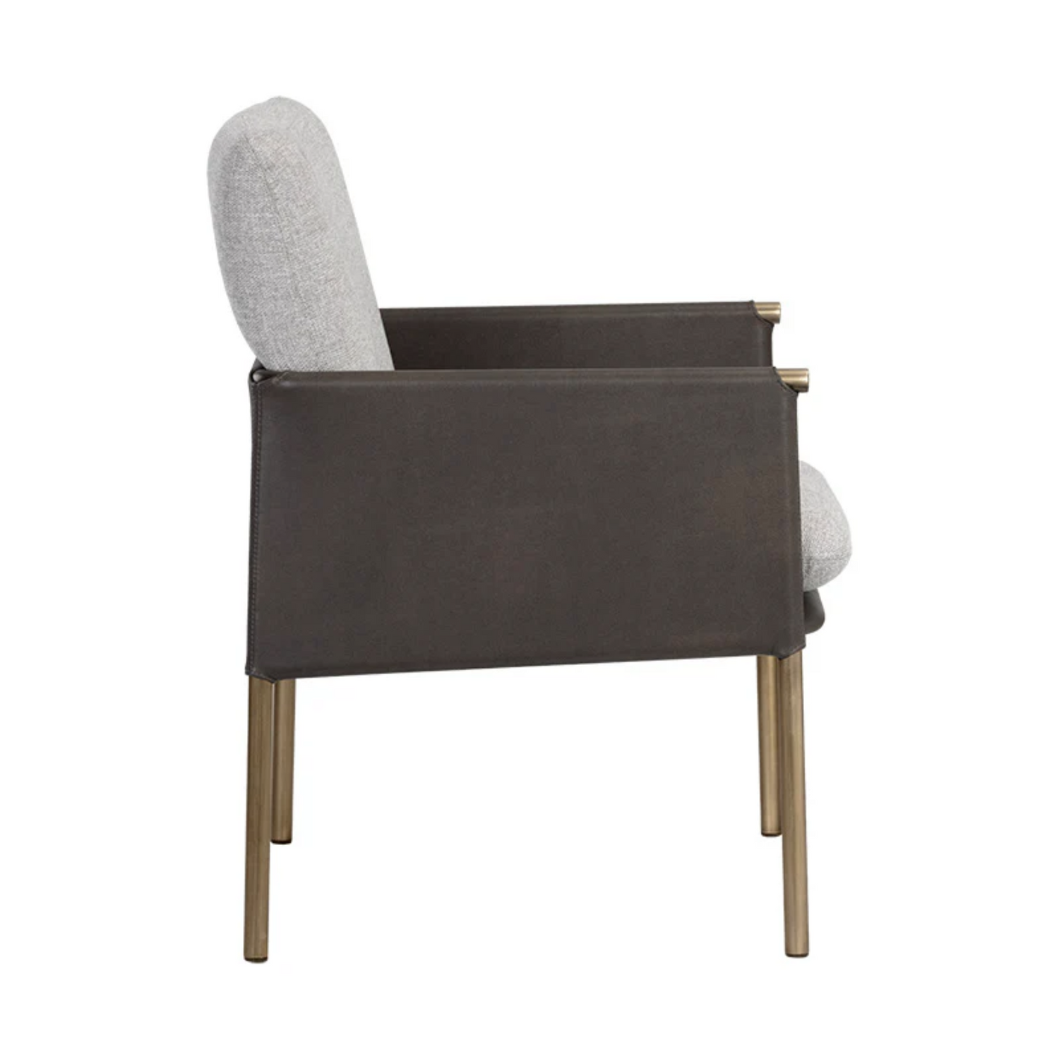 A beautiful upholstered lounge chair crafted with an intriguing mixture of textures and materials. Features a belfast grey fabric seat with a contrasting bravo ash faux leather exterior and antique brass frame. Can be paired with coordinating bench. Handle With Care: This design has been crafted with faux leather. Faux leather is manufactured to reflect the natural characteristics of leather; as such, color variations, markings wrinkles, grooves, and light scratches are appreciated characteristics. No two pieces will be alike.