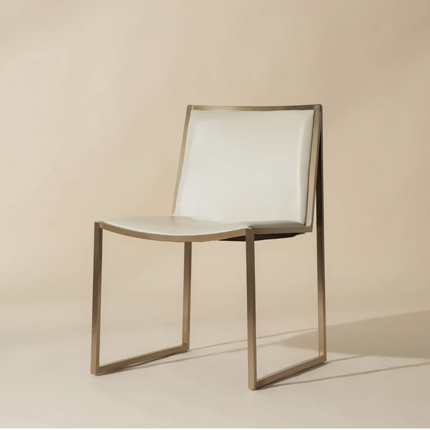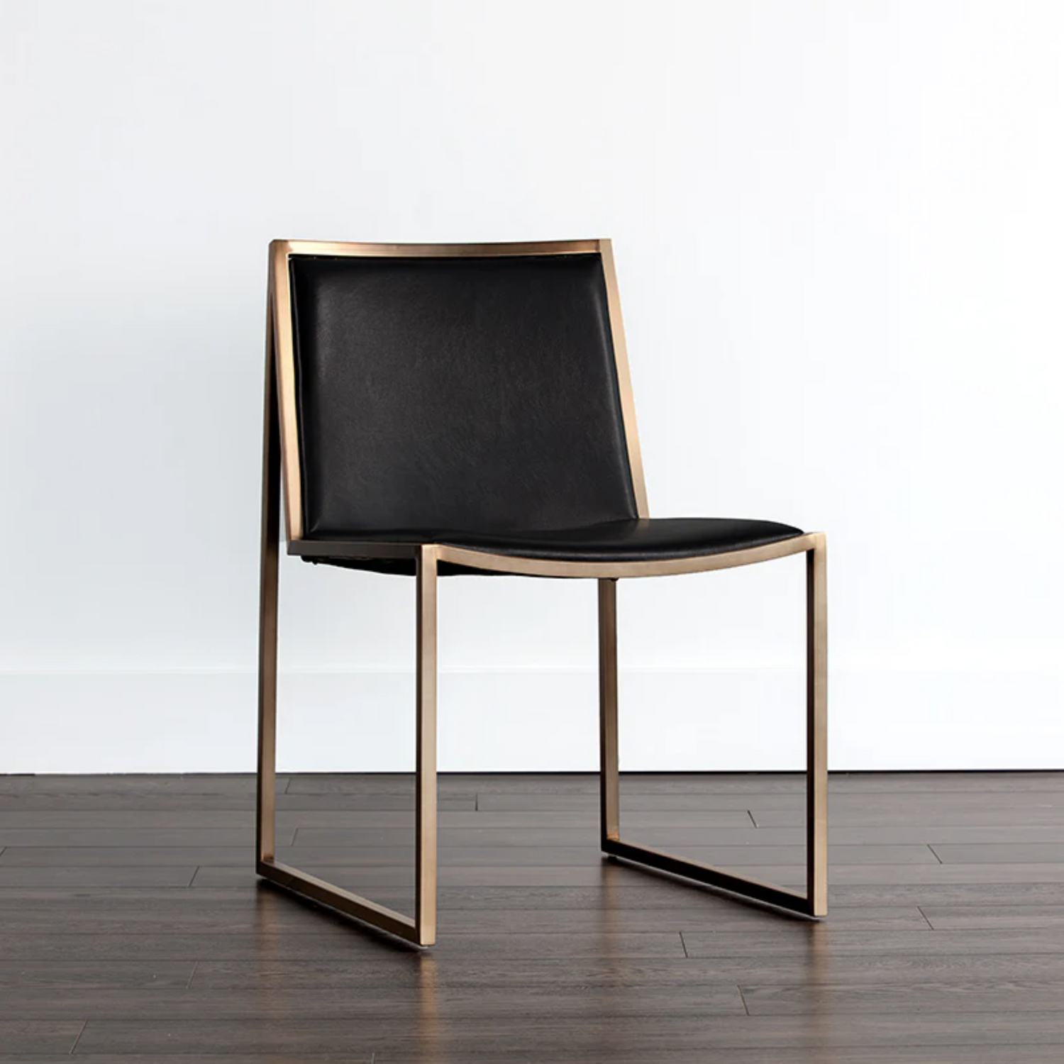The modern styling of this dining chair will add both glamour and edge to dining spaces. Features a sleek and streamlined antique brass frame with a smooth cantina black bonded leather seat. Handle with Care: This design has been crafted with leather. Bonded leather is a blend of reconstituted leather and synthetic materials crafted to reflect the natural characteristics of leather; as such, colour variations, markings, wrinkles, grooves and light scratches are acceptable and appreciated characteristics. No two pieces are alike.
