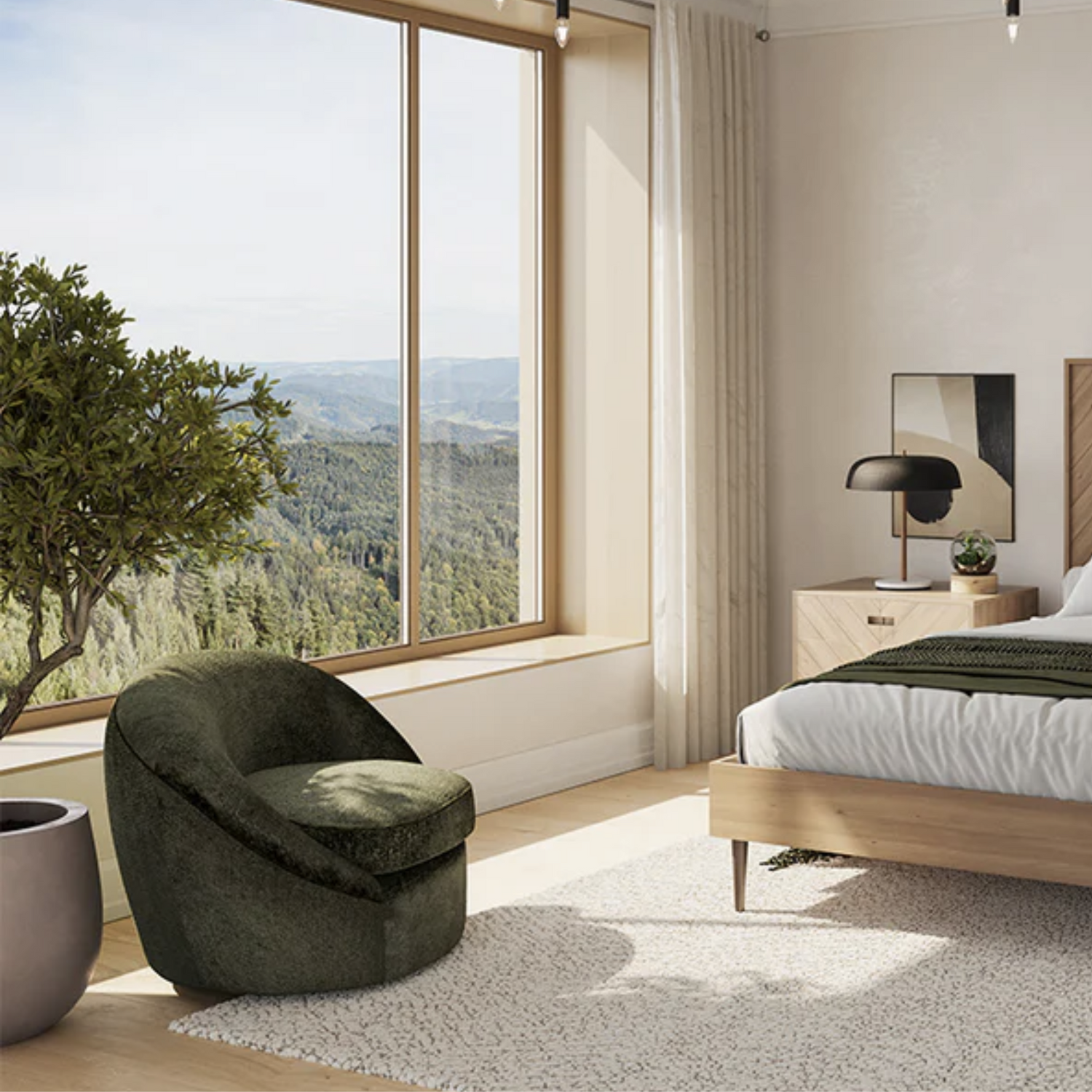 Designed with an irresistibly curvy shape, this contemporary swivel lounge chair is the perfect accent piece to make a statement in any room. Upholstered in abbington hunter green fabric with a black powder coated stainless steel base.