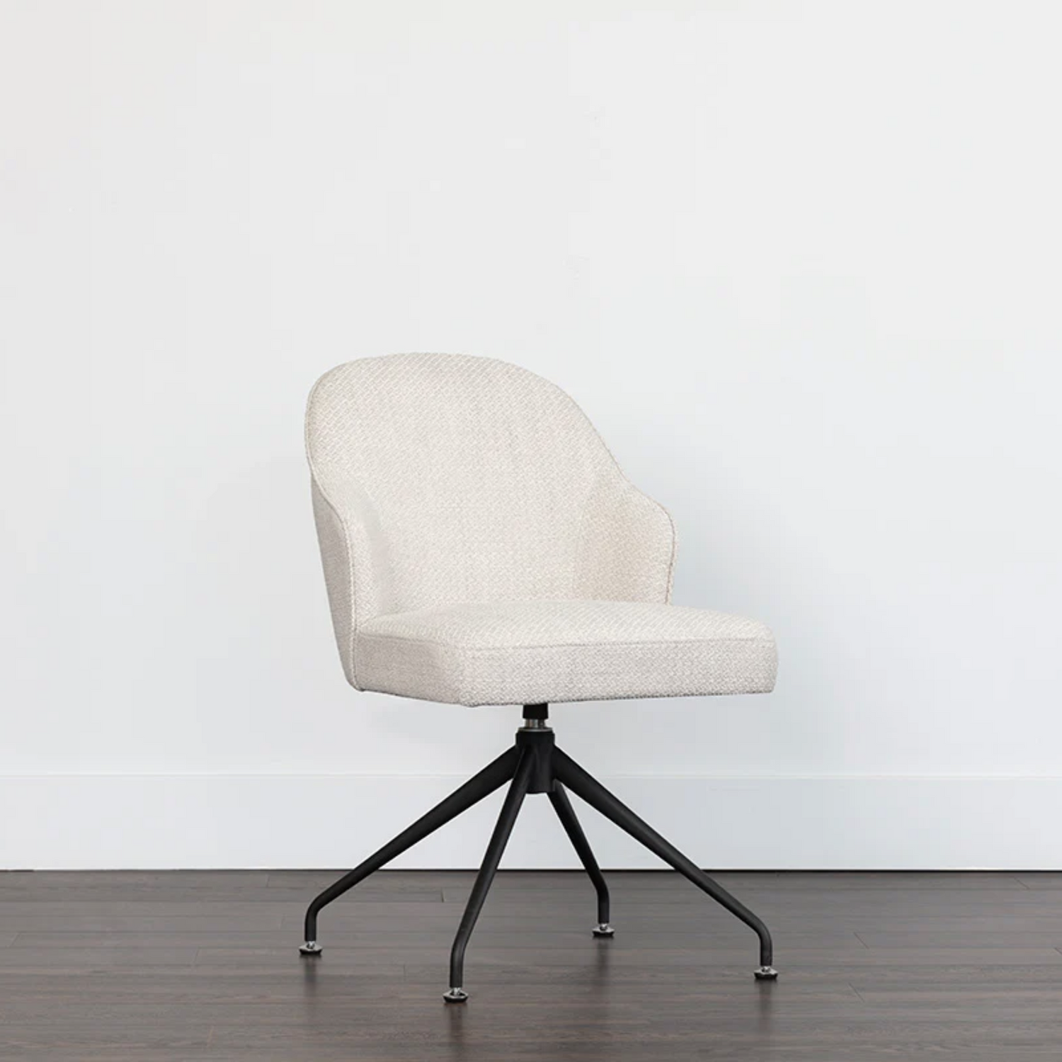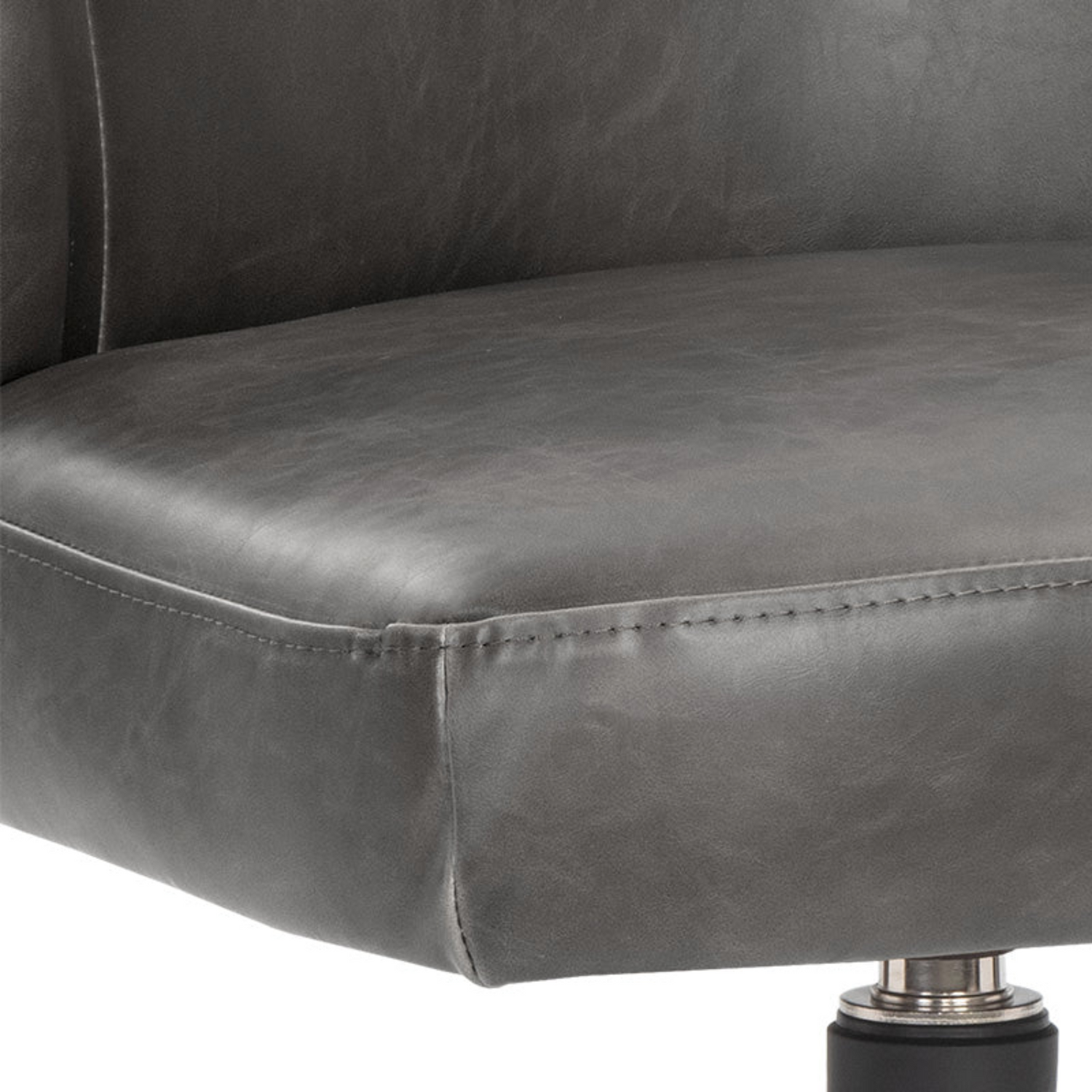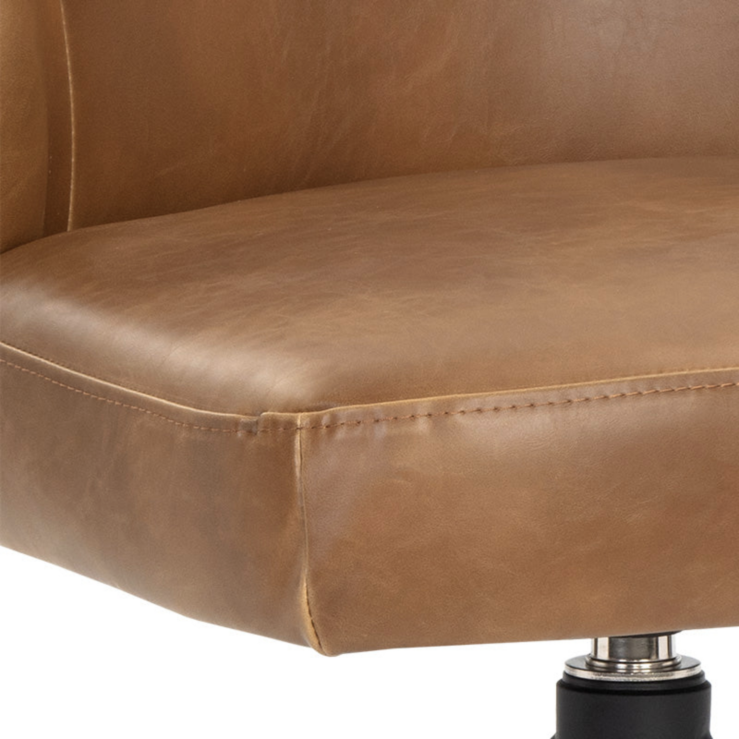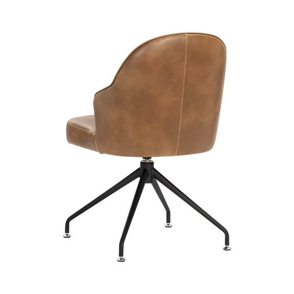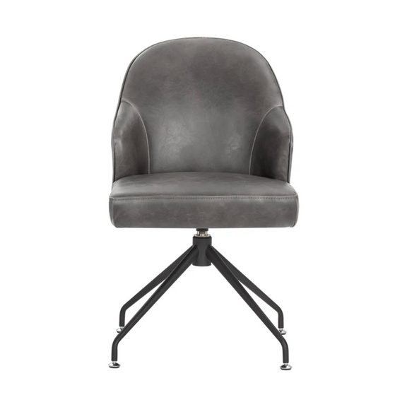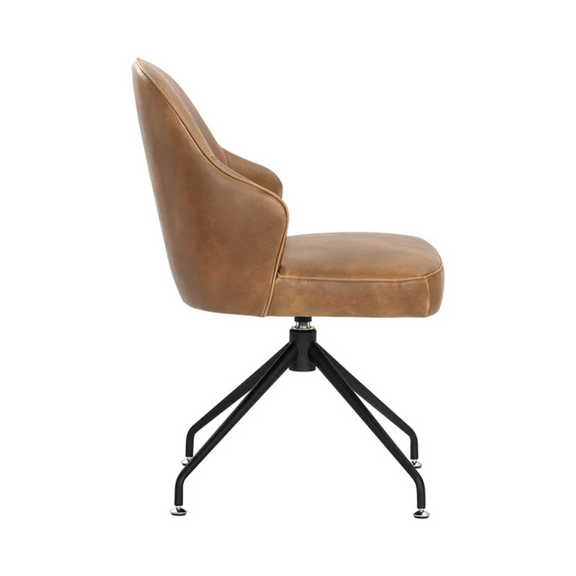 A handsome swivel dining chair designed for transitional and modern spaces. Features a curved seatback in tobacco tan and overcast grey faux leather with a black iron base. Handle With Care: This design has been crafted with faux leather. Faux leather is manufactured to reflect the natural characteristics of leather; as such, colour variations, markings wrinkles, grooves, and light scratches are appreciated characteristics. No two pieces will be alike.