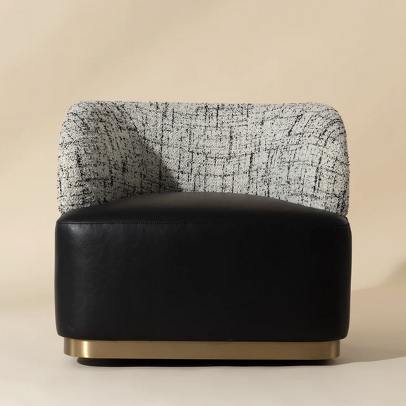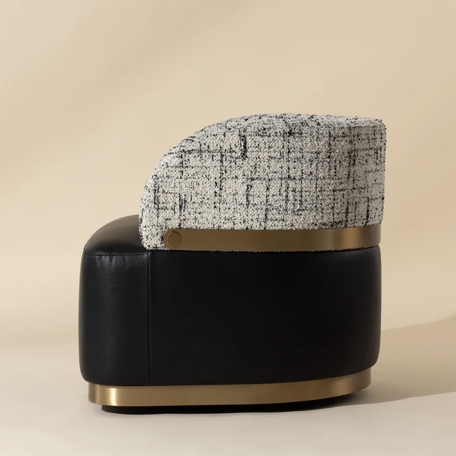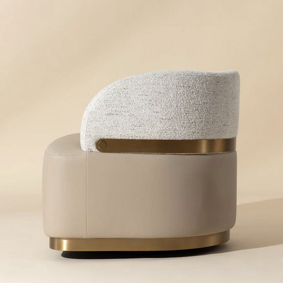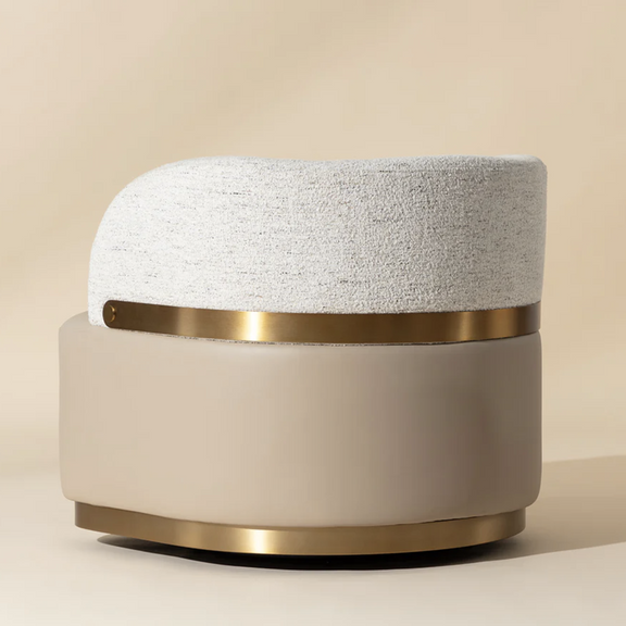 The Brinda Swivel Lounge Chair is a mid-century delight that showcases a mastery of craft and dazzling style. Upholstered in smooth napa beige faux leather and hailey moon fabric, this gorgeous lounge chair features a gold stainless steel accent on the backrest and a matching plinth base.