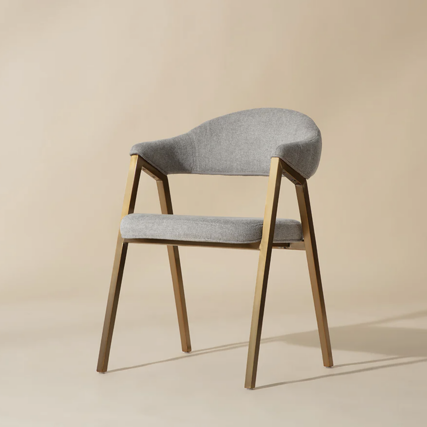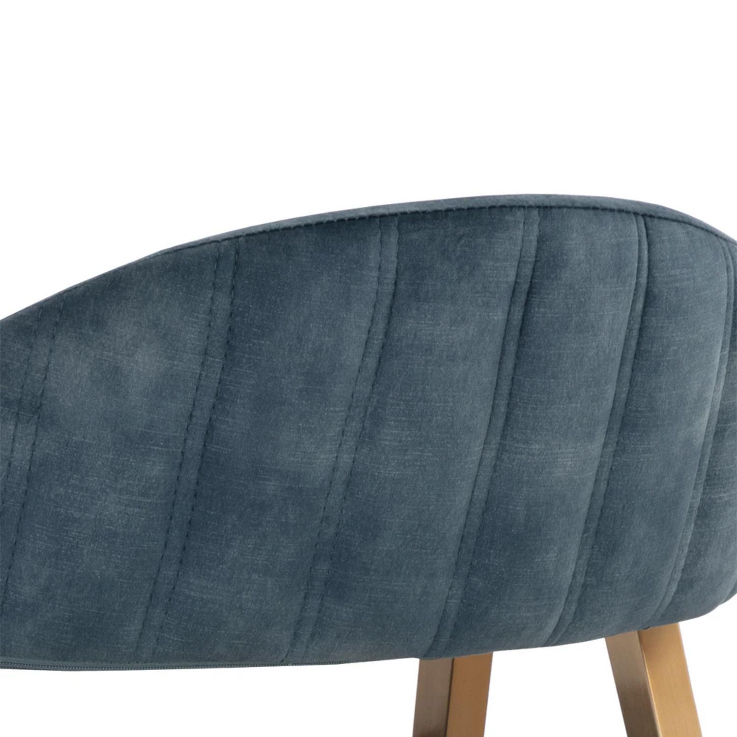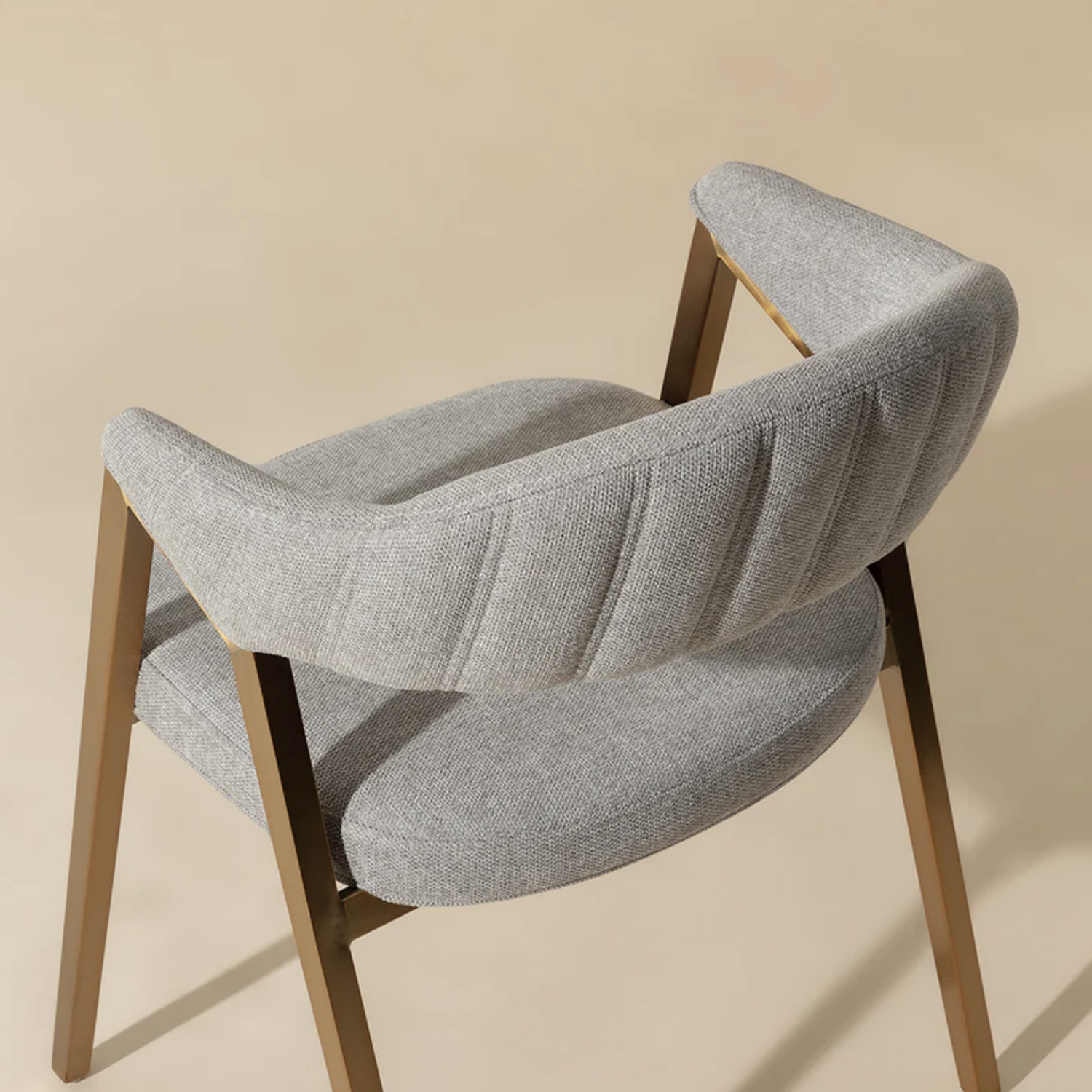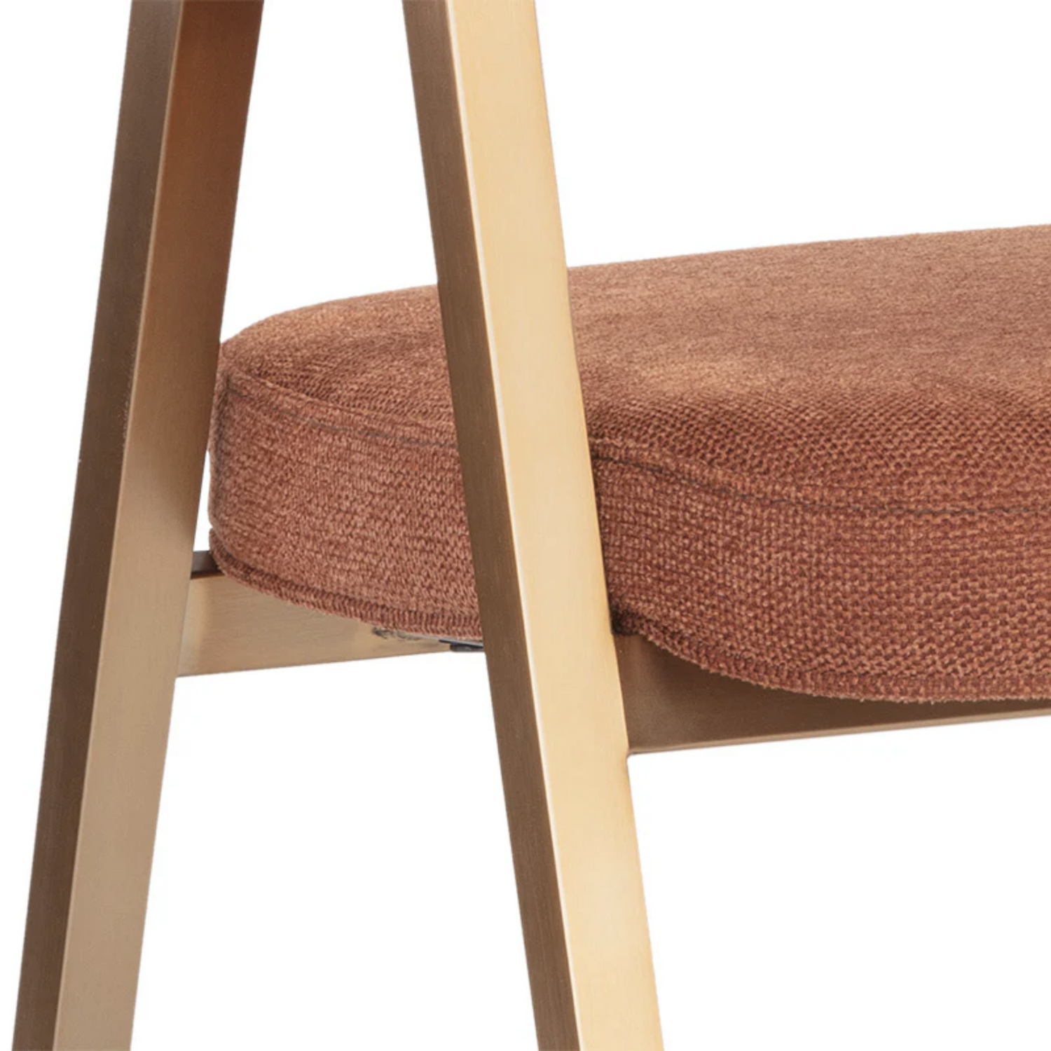 This modern chair will charm guests. Features a curved seatback with channel tufting on the exterior in belfast rust fabric, complemented with a brushed gold stainless steel frame.