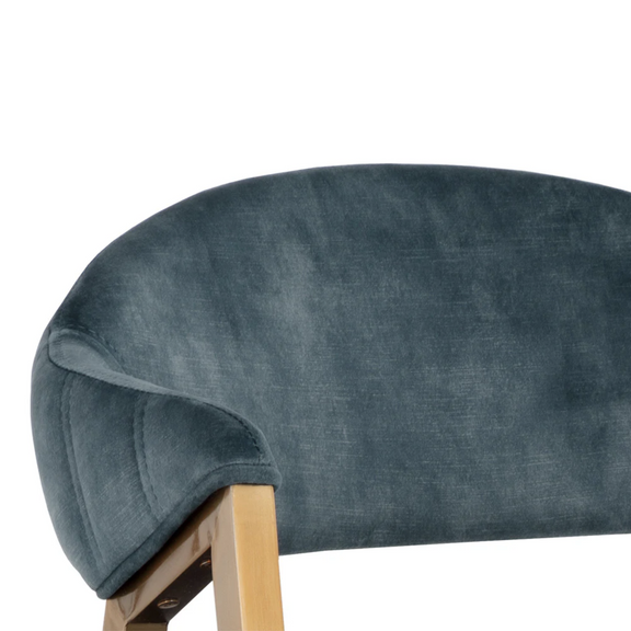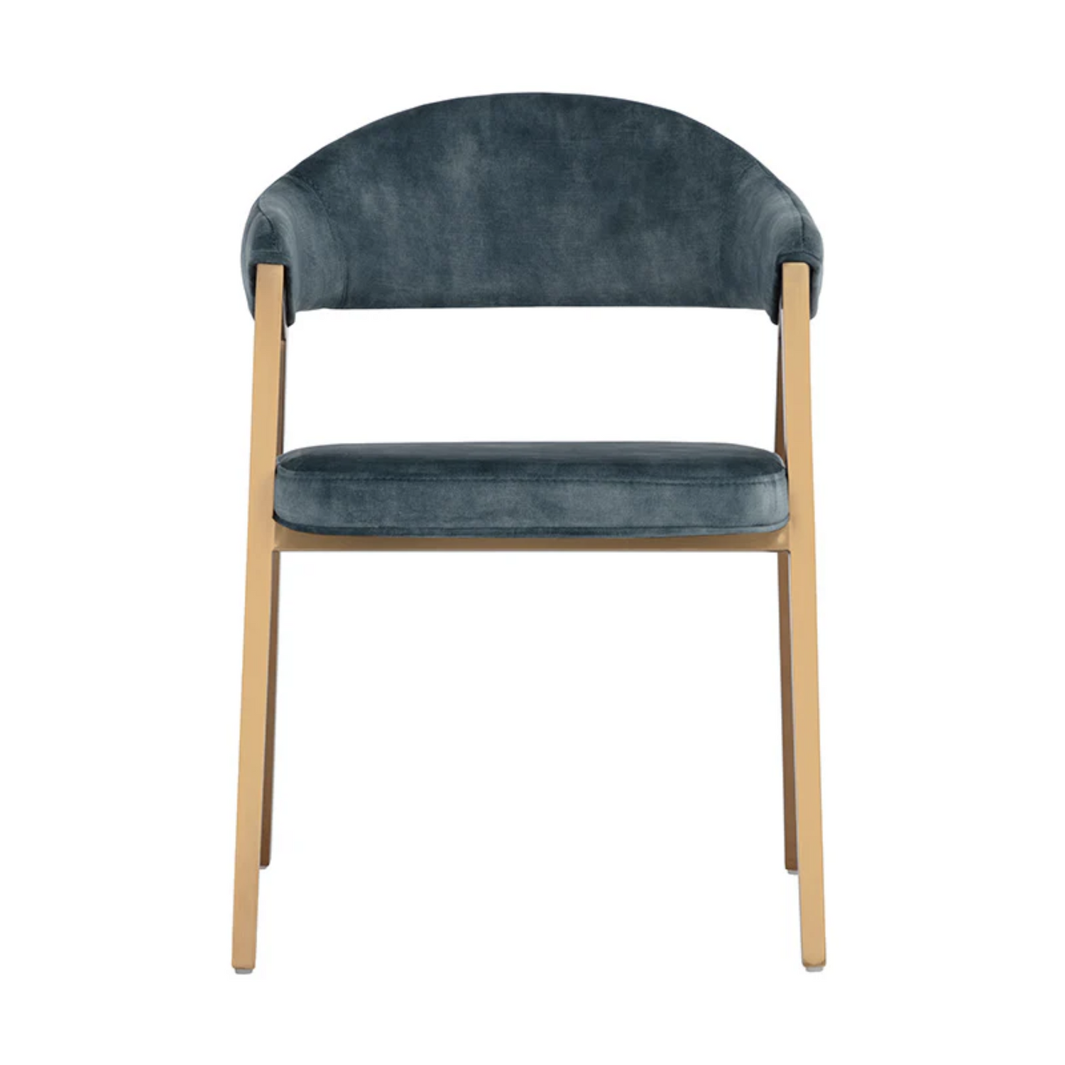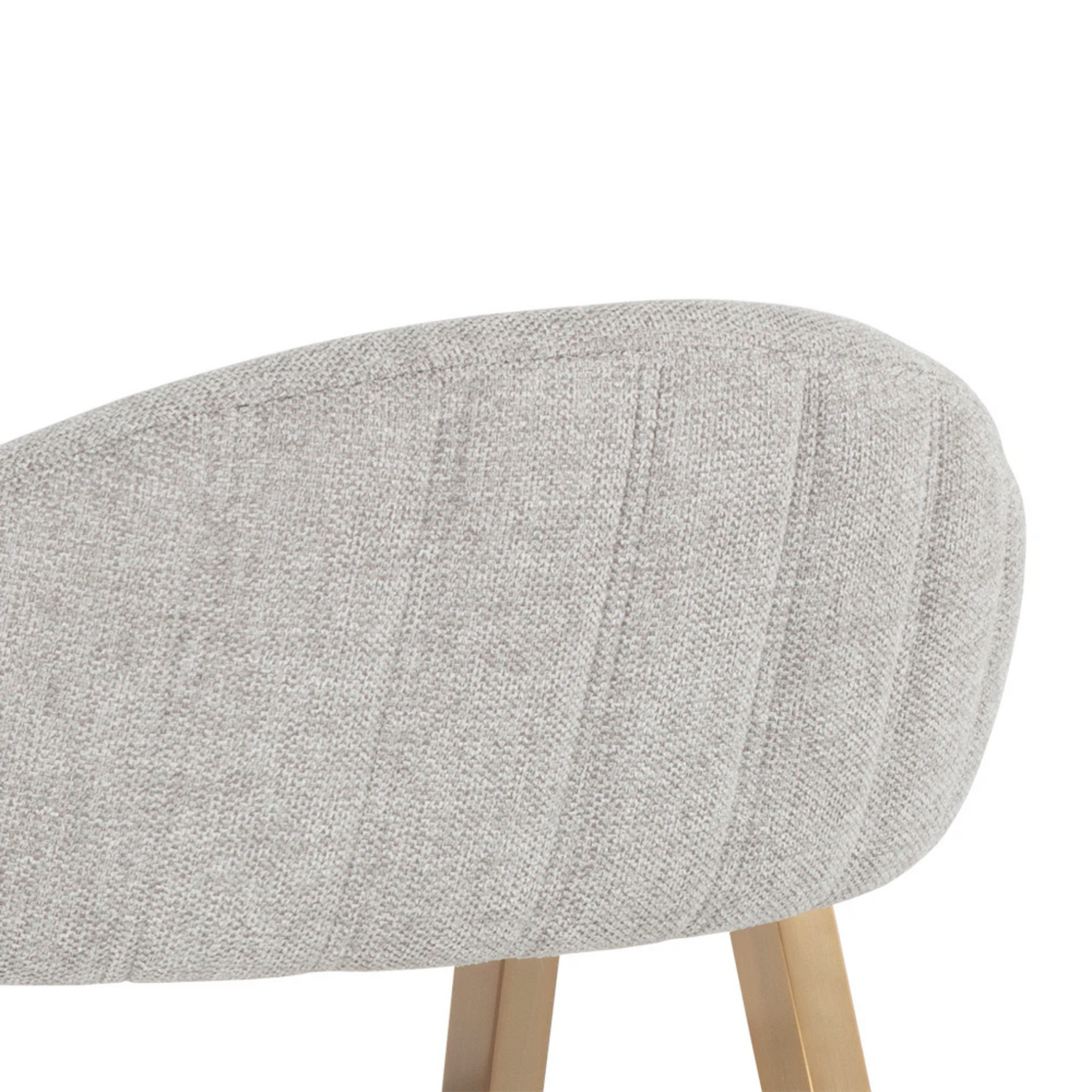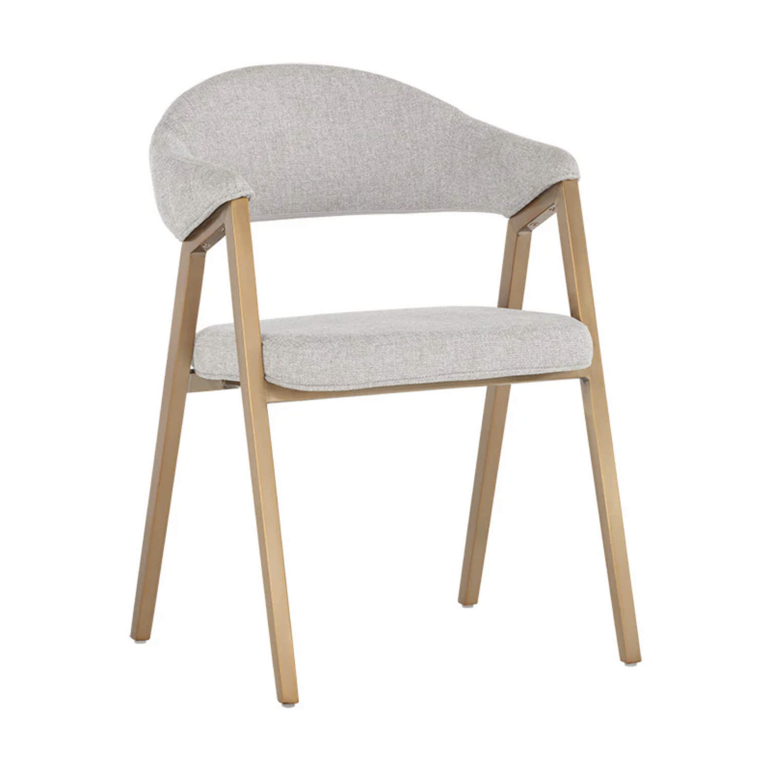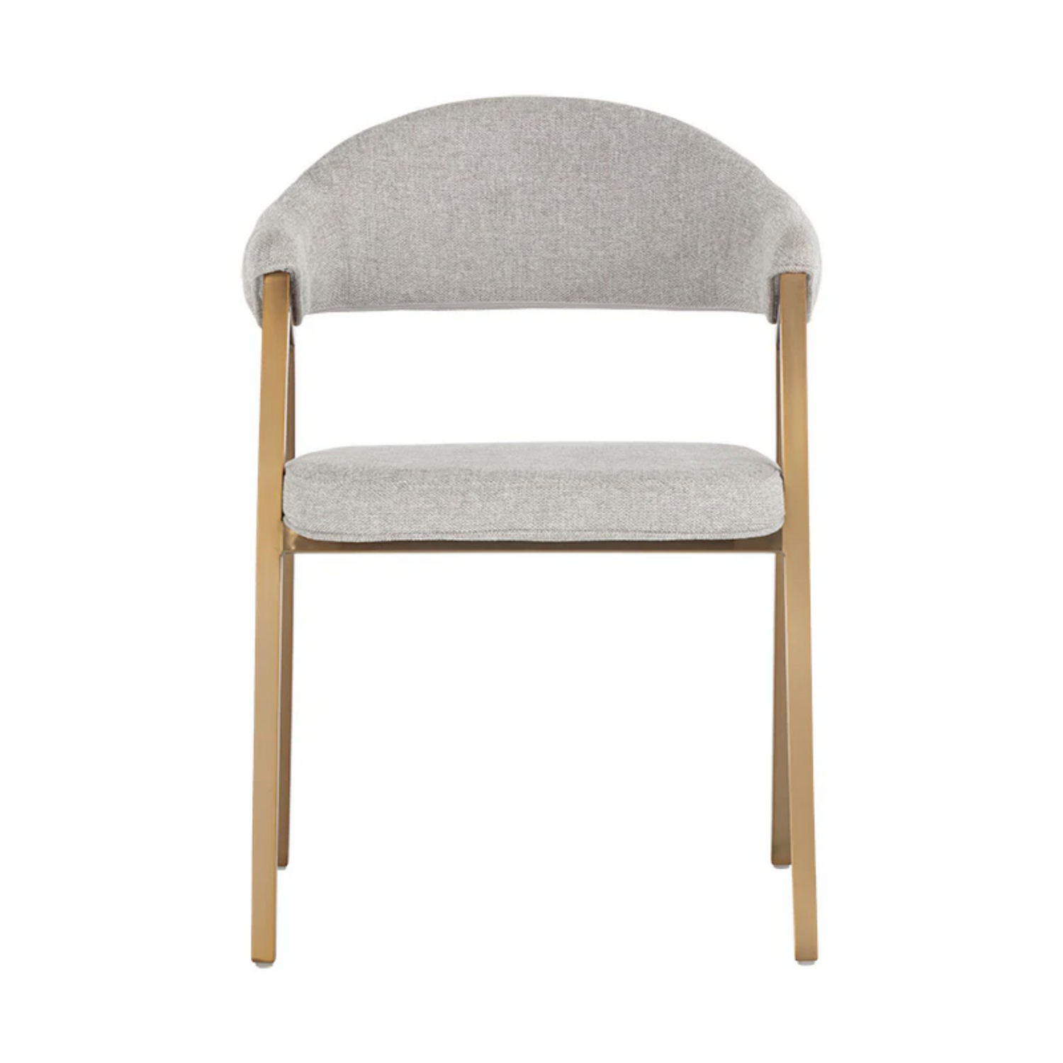 This modern chair will charm guests. Features a curved seatback with channel tufting on the exterior in belfast rust fabric, complemented with a brushed gold stainless steel frame.