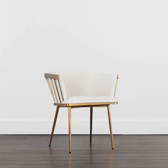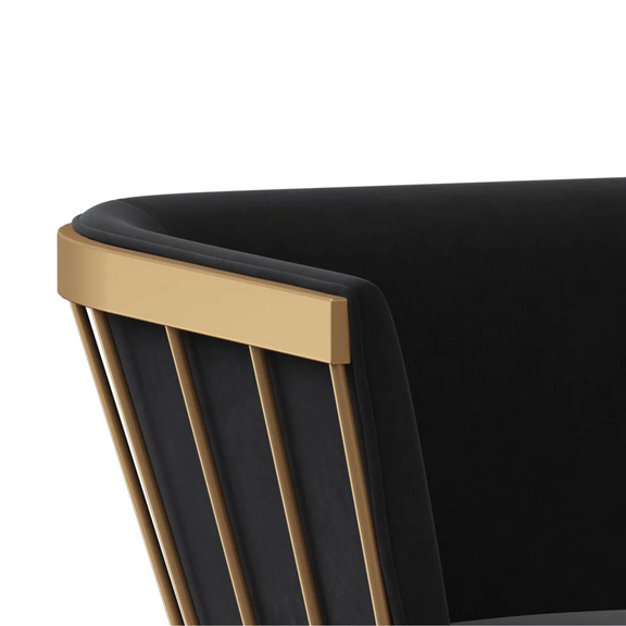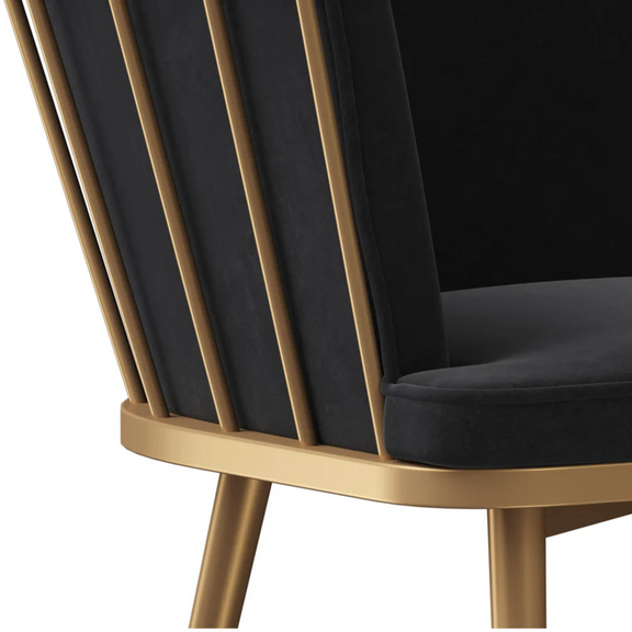 Elegant and modern style unite in this beautiful dining armchair. Stocked in abbington black fabric with a brushed gold stainless steel cage-like frame.