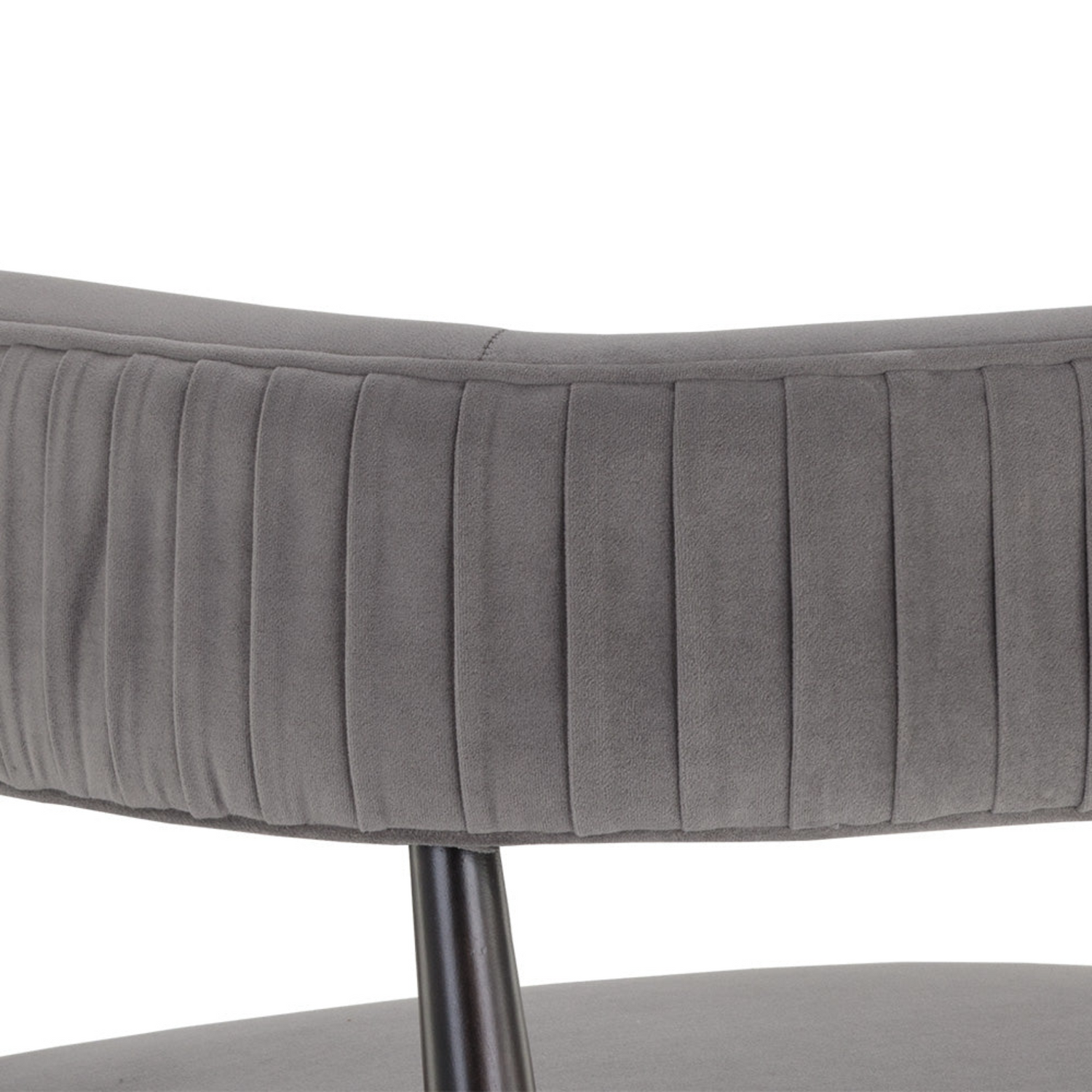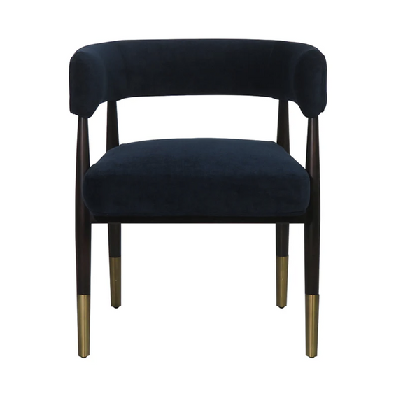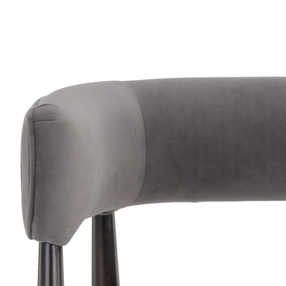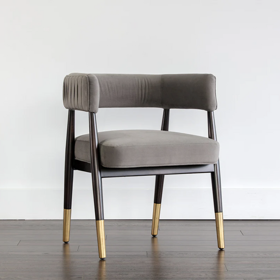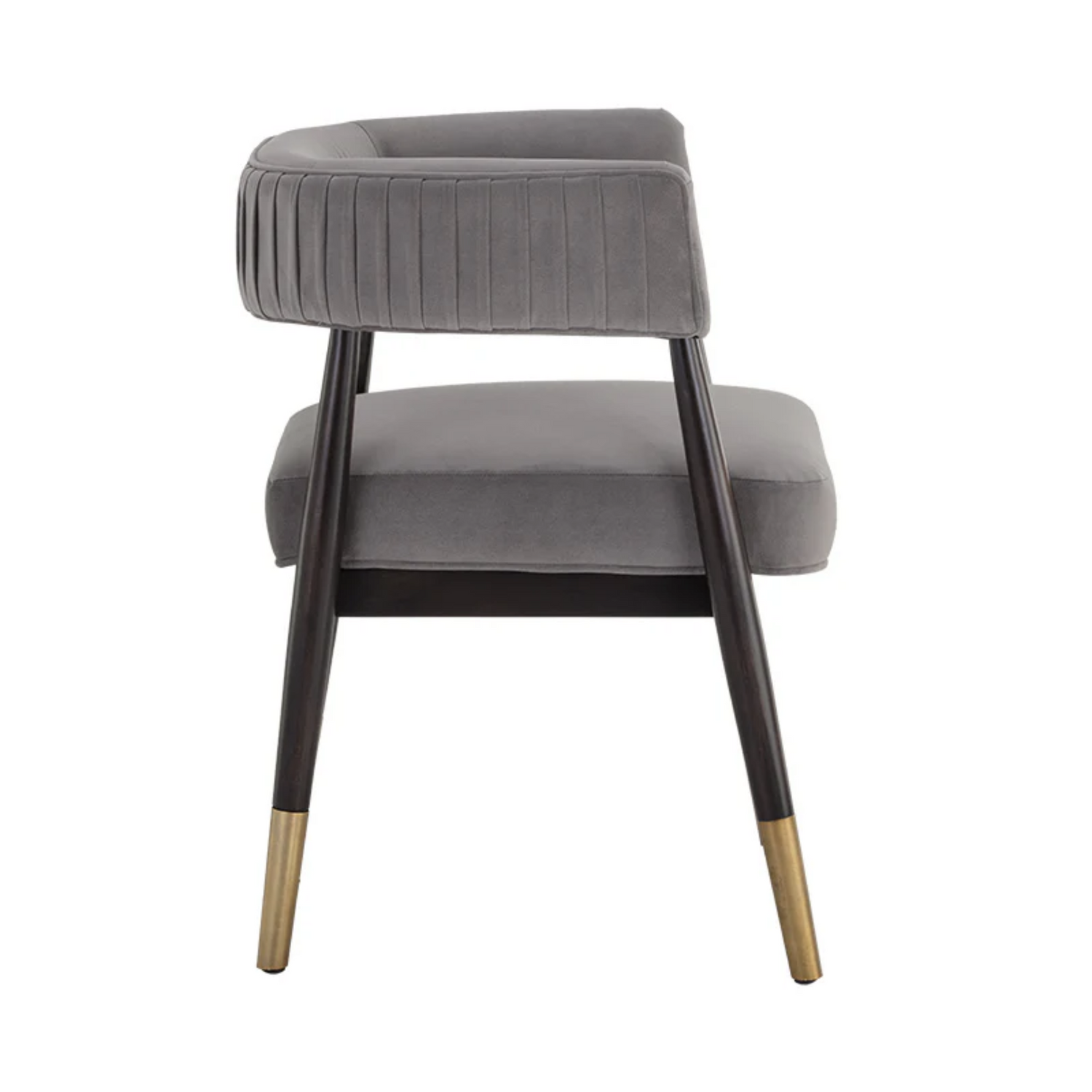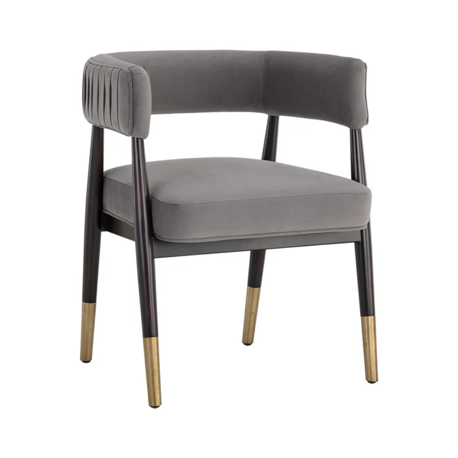 Invite guests to relax in this elegant open back armchair. Features a modern barrelback seat in antonio charcoal performance fabric with ruching on the exterior. An exposed brown birchwood frame with gold metal caps completes the look. Perfect for living, lounge and office spaces. Performance fabric is moisture repellent, durable and easy to clean.