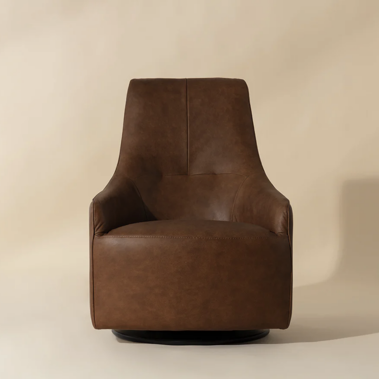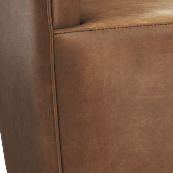 Characterized by its stunning shape, this Italian-made swivel lounge chair boasts luxurious and charming appeal. Subtle tufting adds a sophisticated design detail. Crafted from 100% Italian bovine leather in a rich cognac for a vintage look that will enhance with age. This fine material is a natural grain, aniline leather that is dyed using traditional methods, resulting in consistent and even coloring throughout the piece.