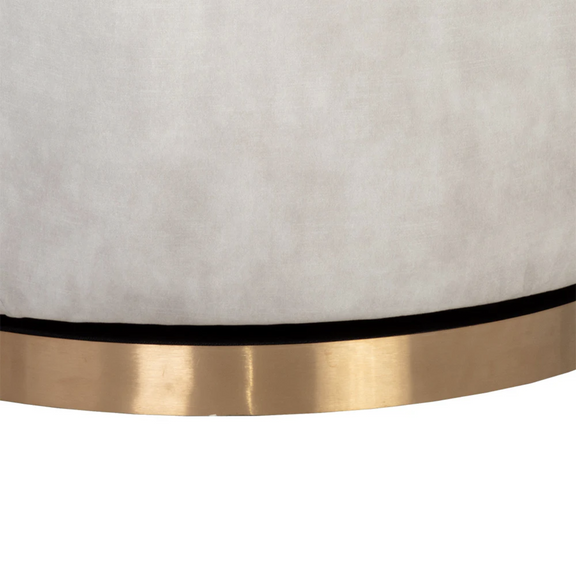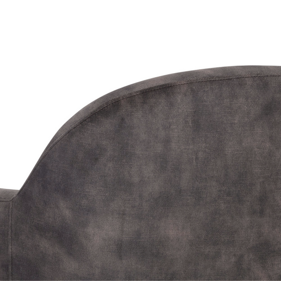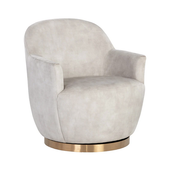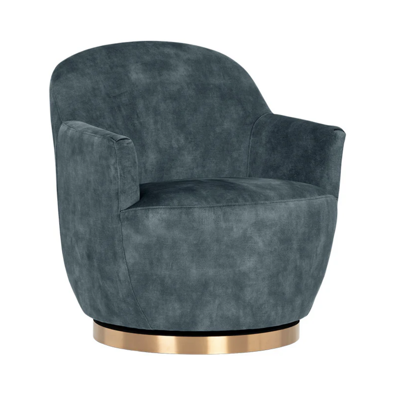 An elegant swivel chair perfect for living, lounge and office spaces. Features a modern barrelback design upholstered in nono shitake fabric. A gold stainless steel base with 360 degree swivel completes the design..
