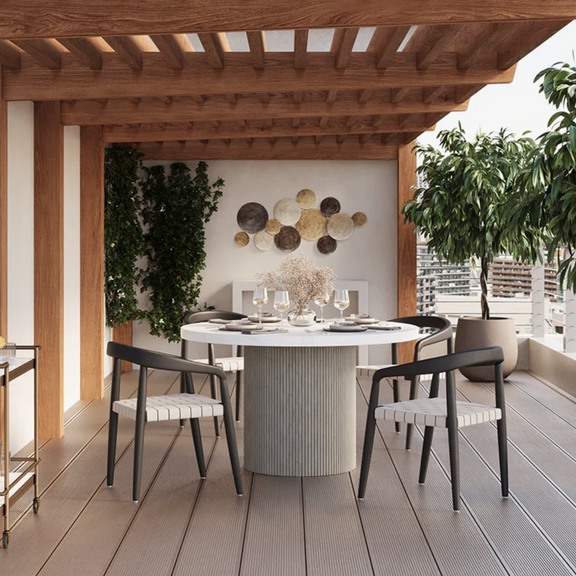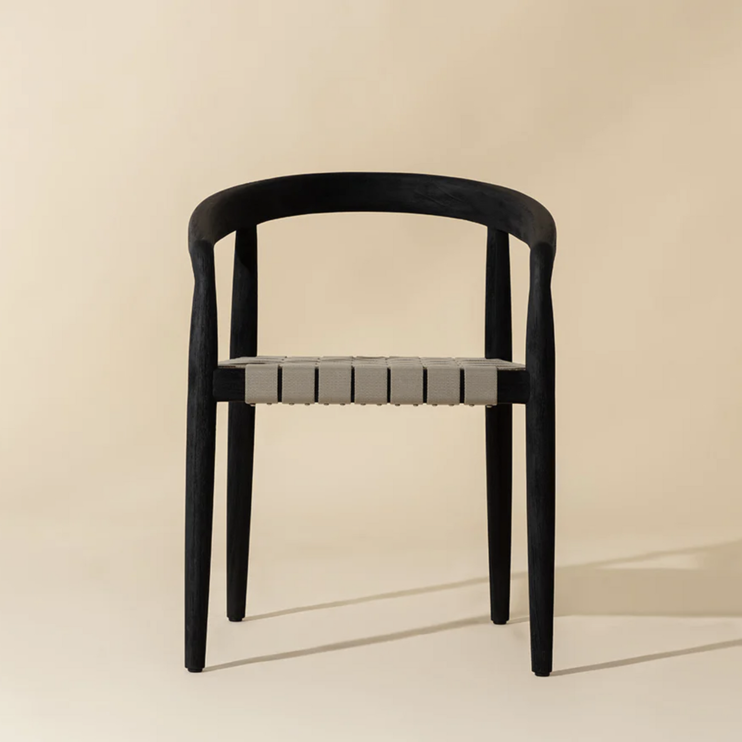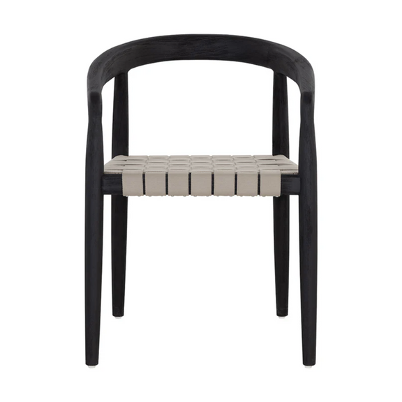 Contrasting textures with impressive details elevate this stylish dining armchair from the Outdoor by SUNPAN collection. The seat is made with Italian all-weather strap which is constructed from 100% recyclable polypropylene fiber for long lasting durability and comfort. Completed with a solid, charcoal-coloured teak wood frame. Suitable for indoor and covered outdoor spaces.
