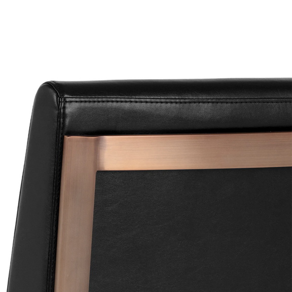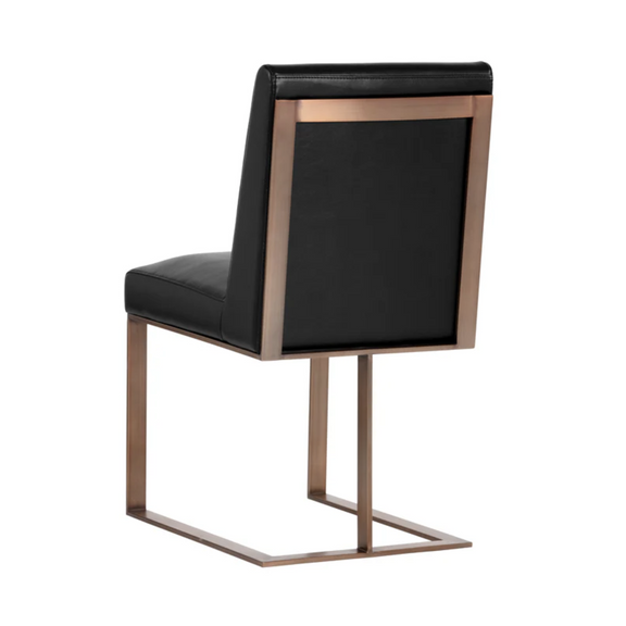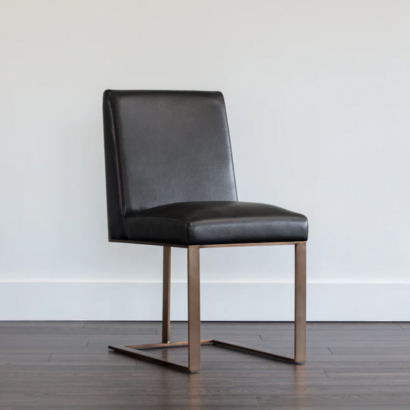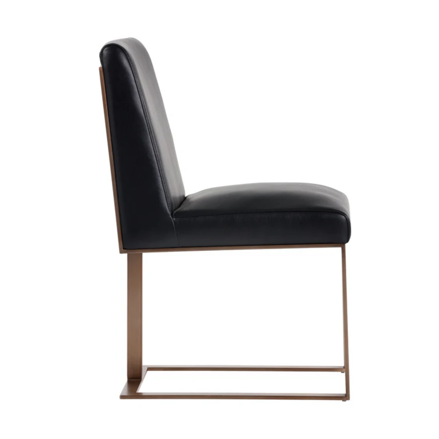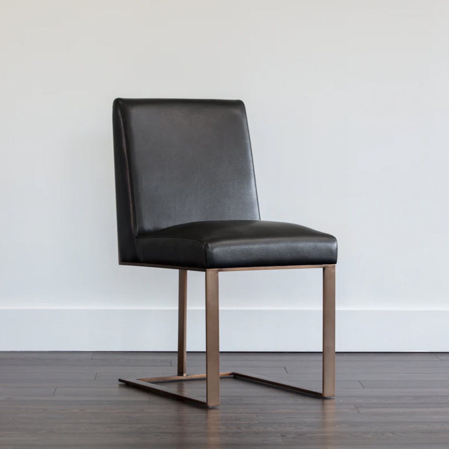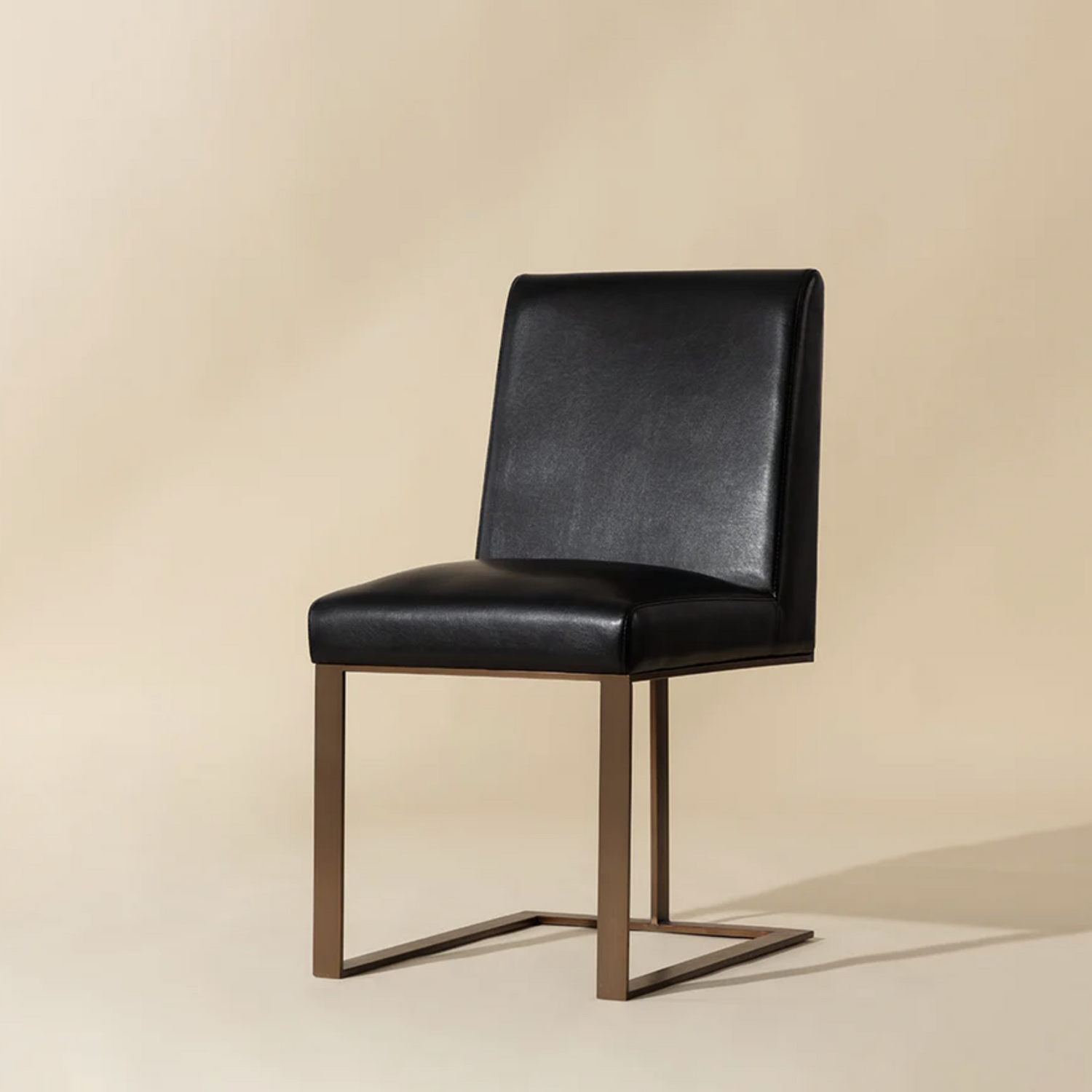 Stunning from all angles, this dining chai features an exposed brushed antique brass steel frame. A streamlined seat in cantina black bonded leather completes the look. Perfect for restaurants, bars and residential spaces. Handle with Care: This design has been crafted with bonded leather. Bonded leather is a blend of reconstituted leather and synthetic materials crafted to reflect the natural characteristics of leather; as such, colour variations, markings, wrinkles, grooves and light scratches are acceptable and appreciated characteristics. No two pieces are alike.