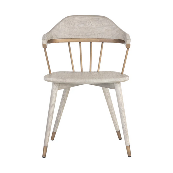 The classic elegance of this dining chair is guaranteed to make a statement in any dining room. The stylish antique brass spindles complement the matching metal caps of the chair legs. Completed with a grey solid oak wood base. As wood is an organic, porous material, these pieces will contain natural variation of texture and may also exhibit fine indentations and cracks. Wood pieces will also display a disparity of color and grain, and visible knots and burls that add to the character of each piece.