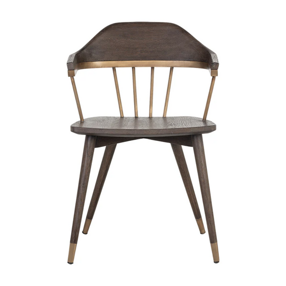 The classic elegance of this dining chair is guaranteed to make a statement in any dining room. The stylish antique brass spindles complement the matching metal caps of the chair legs. Completed with a distressed brown solid oak wood base. As wood is an organic, porous material, these pieces will contain natural variation of texture and may also exhibit fine indentations and cracks. Wood pieces will also display a disparity of color and grain, and visible knots and burls that add to the character of each piece.