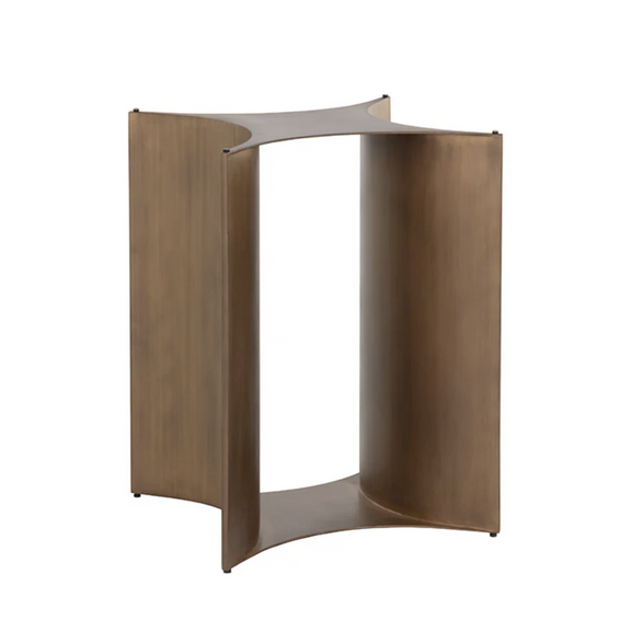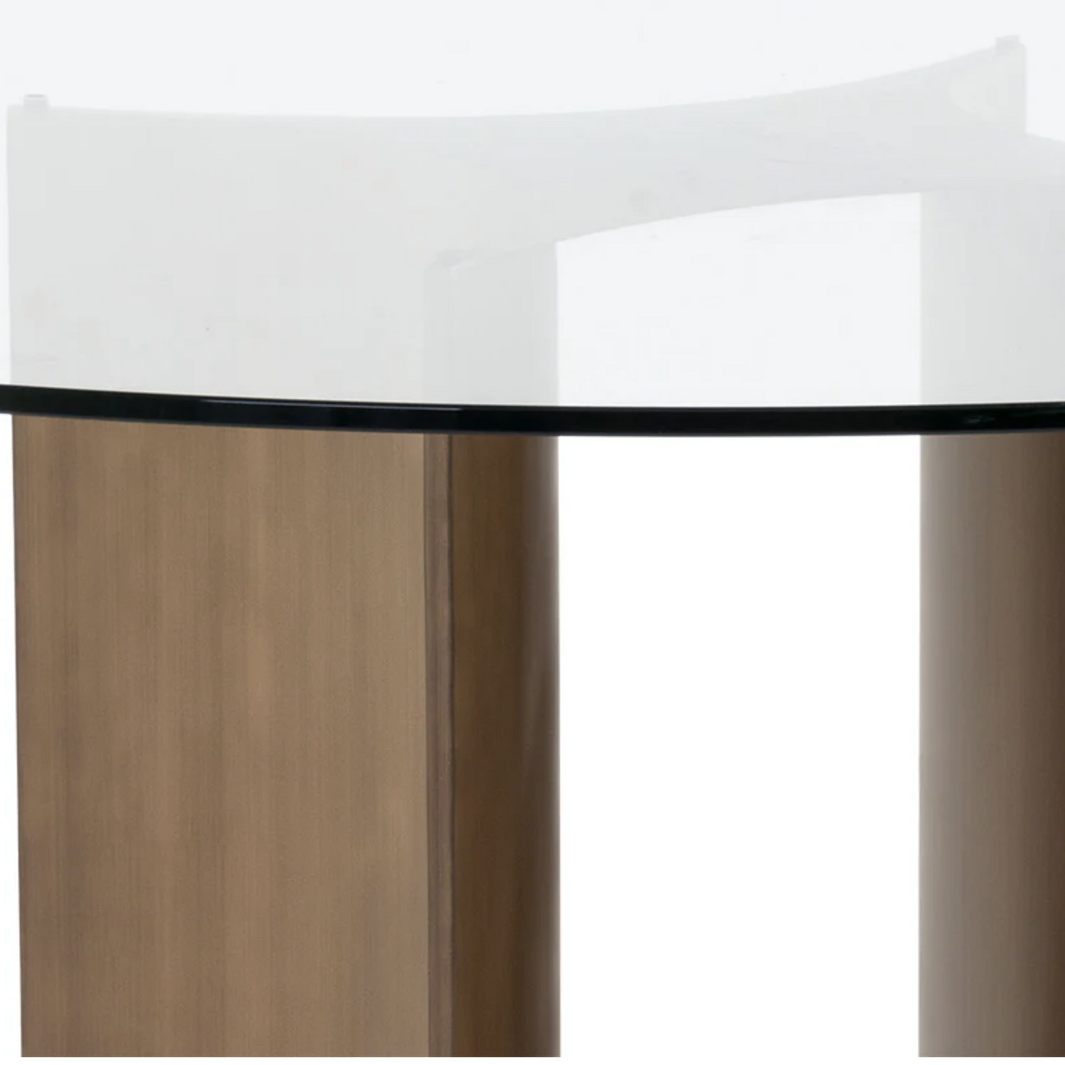 A fabulous dining table base featuring a metal composition with a brushed antique brass finish. Intended for use with a 59" round glass dining table top, or use two bases with an 86.5" glass top for a rectangular dining table combination. Table tops sold separately. Designed for use with glass table tops only. Made in India. With refined craftsmanship, this design was brought to life by skilled local artisans. Due to the nature of handcraftsmanship, unique imperfections such as fissures, markings and variations in color and shape are welcomed and appreciated characteristics for a truly one-of-a-kind piece.