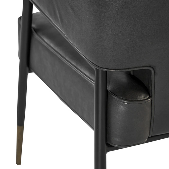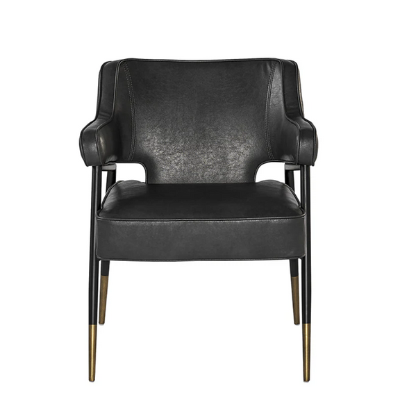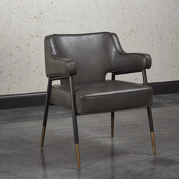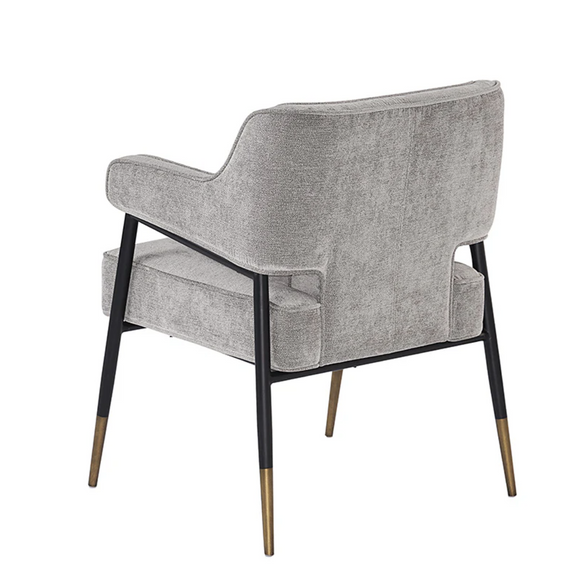 A mid-century dining armchair that sits comfortably. Features a sculpted silhouette upholstered in polo club stone performance fabric. Piping, black steel legs, and gold foot caps complete the look. Performance fabric is moisture repellent, durable and easy to clean.