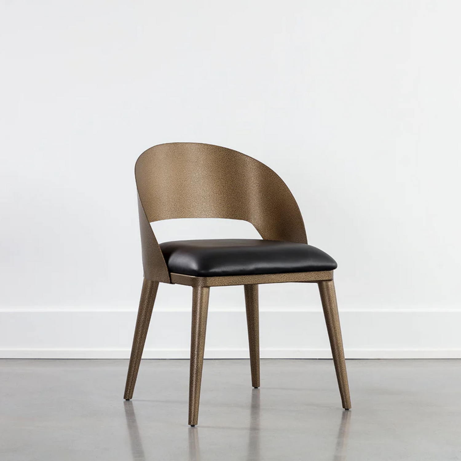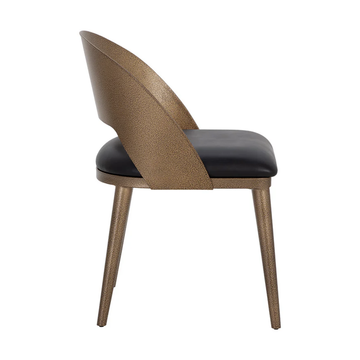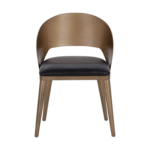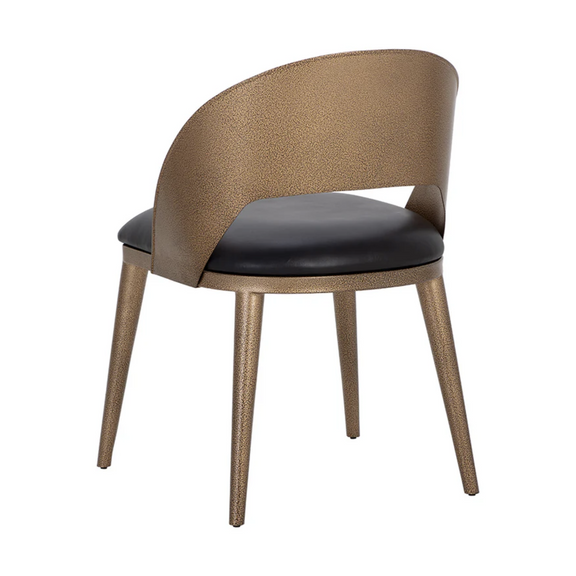 The Dezirae Dining Chair features a sleek profile with a strong curved back for a stylish design that will fit into any dining space. The legs and headrest are beautifully crafted from antique brass textured powder-coated iron. A charcoal leather seat adds an alluring contrast to round out the look. Handle with Care: This design has been crafted with 100% top grain leather. Leather is a natural material; as such, colour variations, markings, wrinkles, grooves and light scratches are acceptable and appreciated characteristics. No two pieces are alike. Made in India. With refined craftsmanship, this design was brought to life by skilled local artisans. Due to the nature of handcraftsmanship, unique imperfections such as fissures, markings and variations in color and shape are welcomed and appreciated characteristics for a truly one-of-a-kind piece.