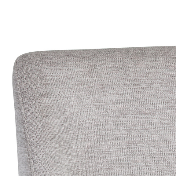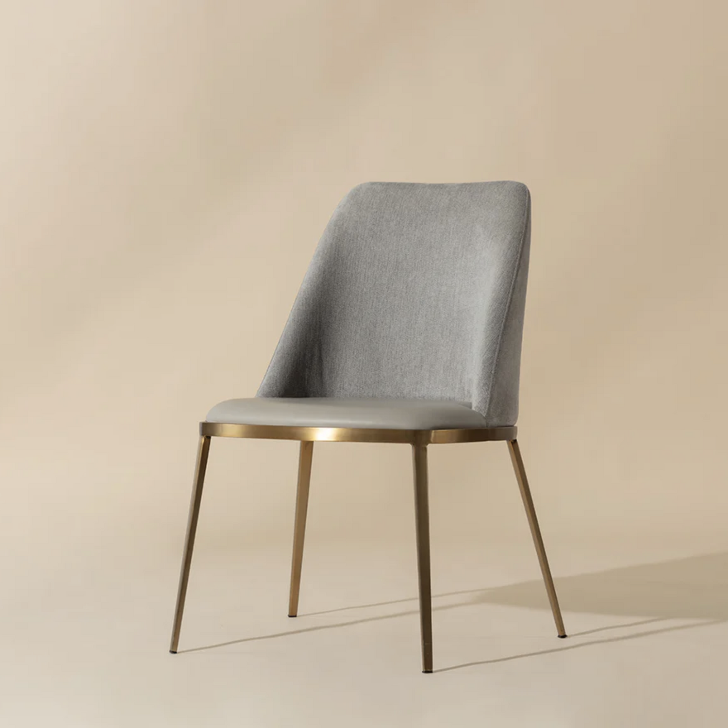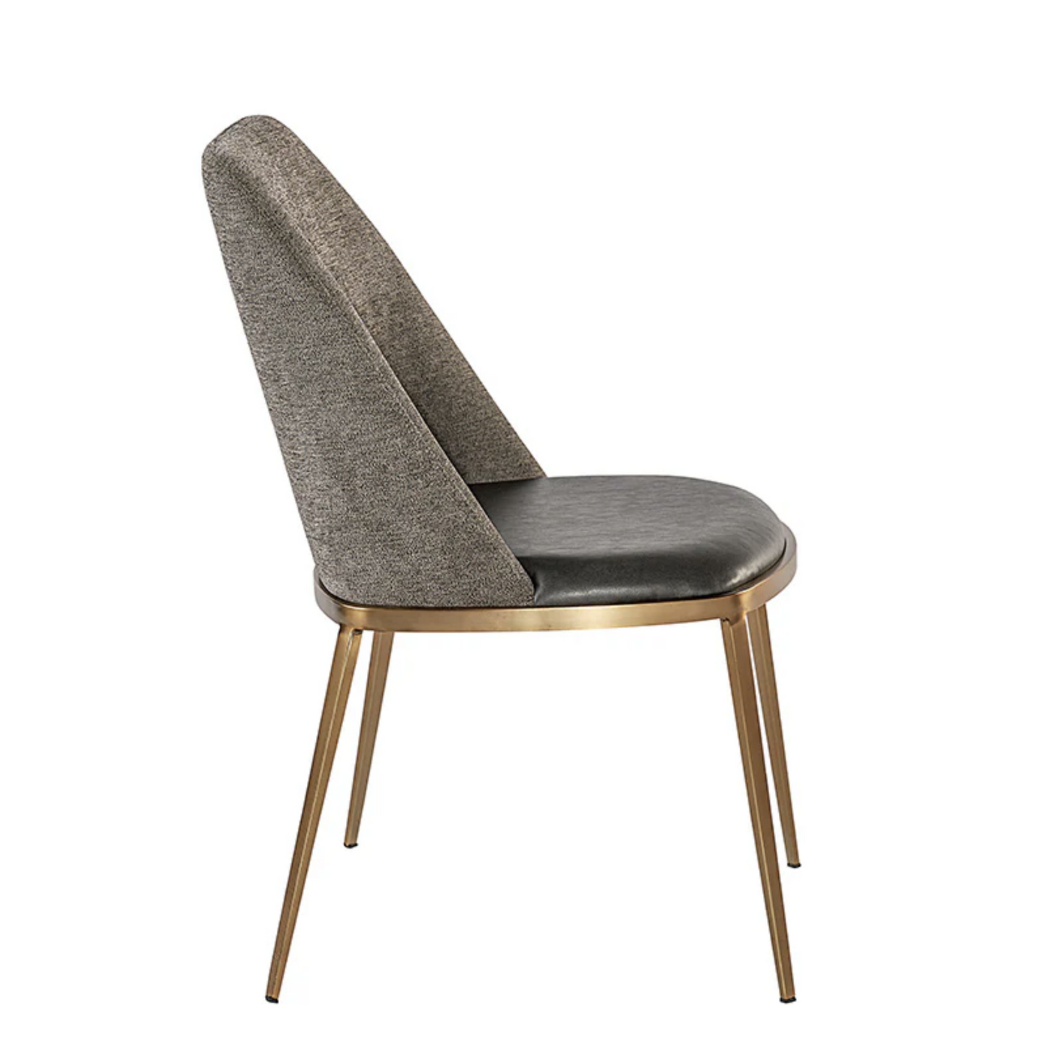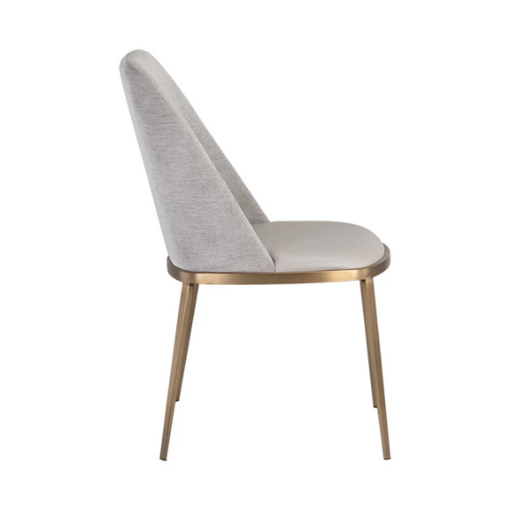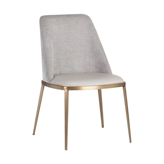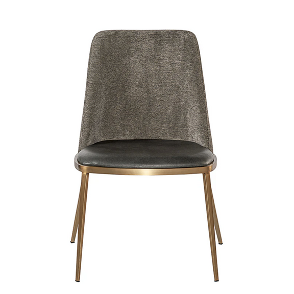 A combination of mixed materials creates a truly luxurious dining chair. The contemporary silhouette is finished with a bravo portabella faux leather seat, sparrow grey fabric seatback and sleek brushed gold steel legs. An eye-catching piece from all angles.