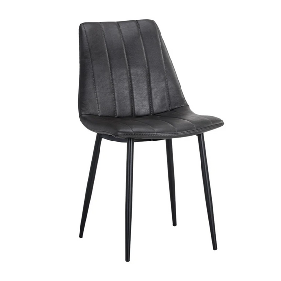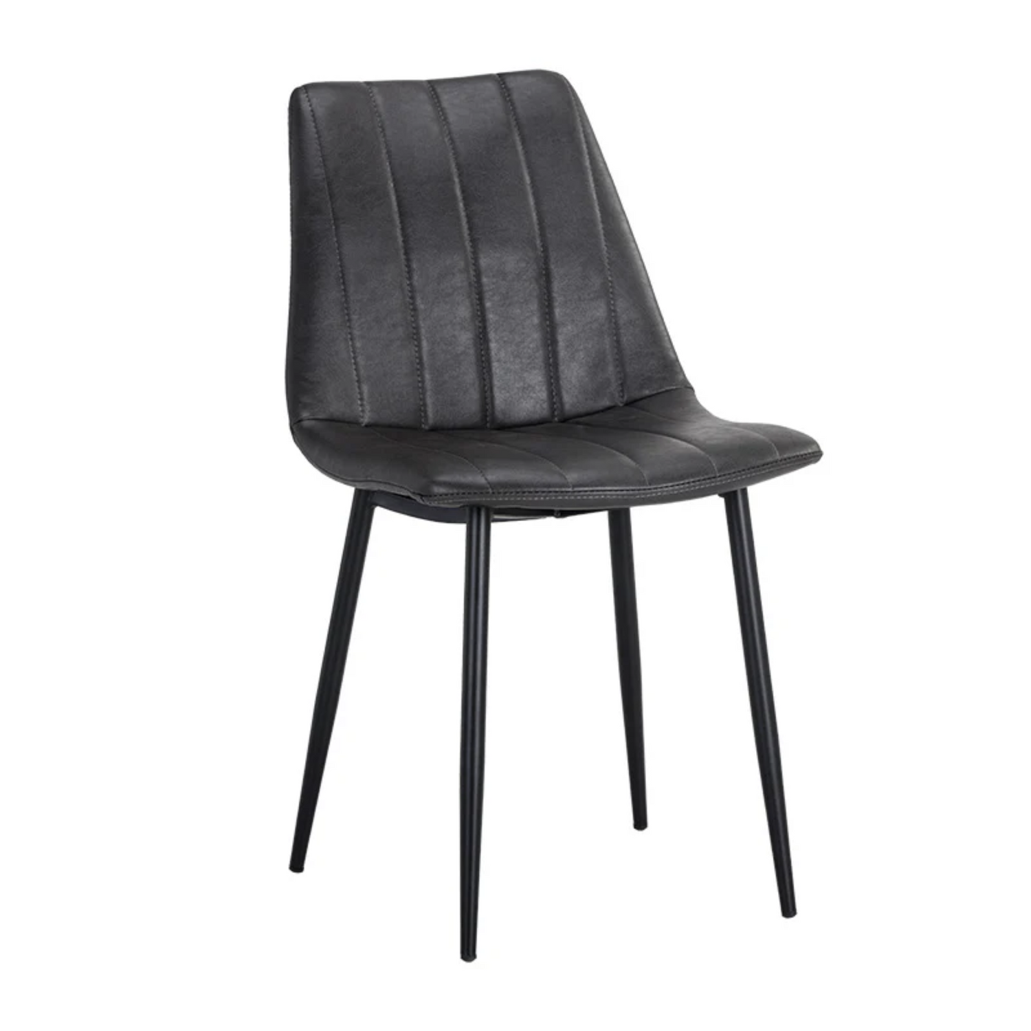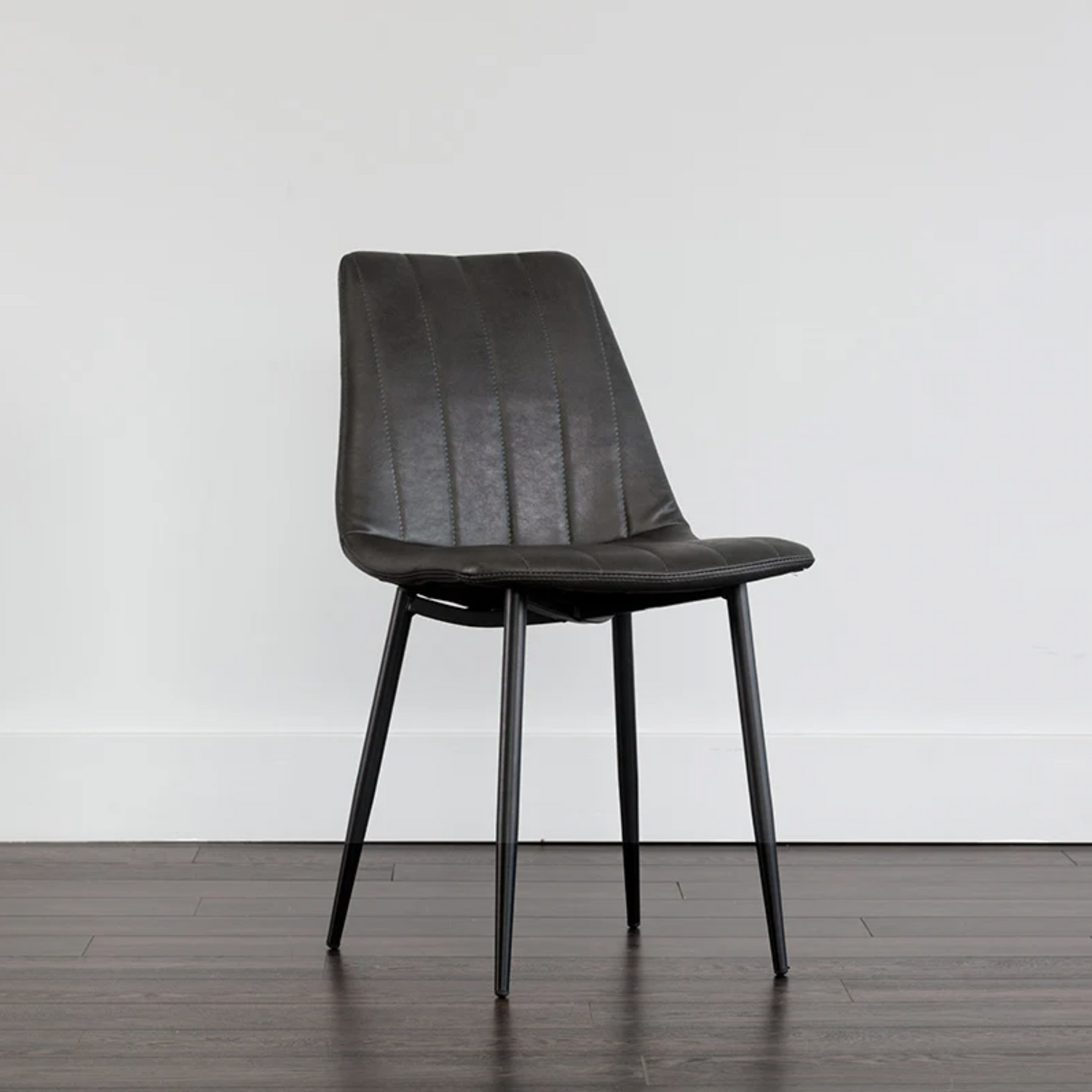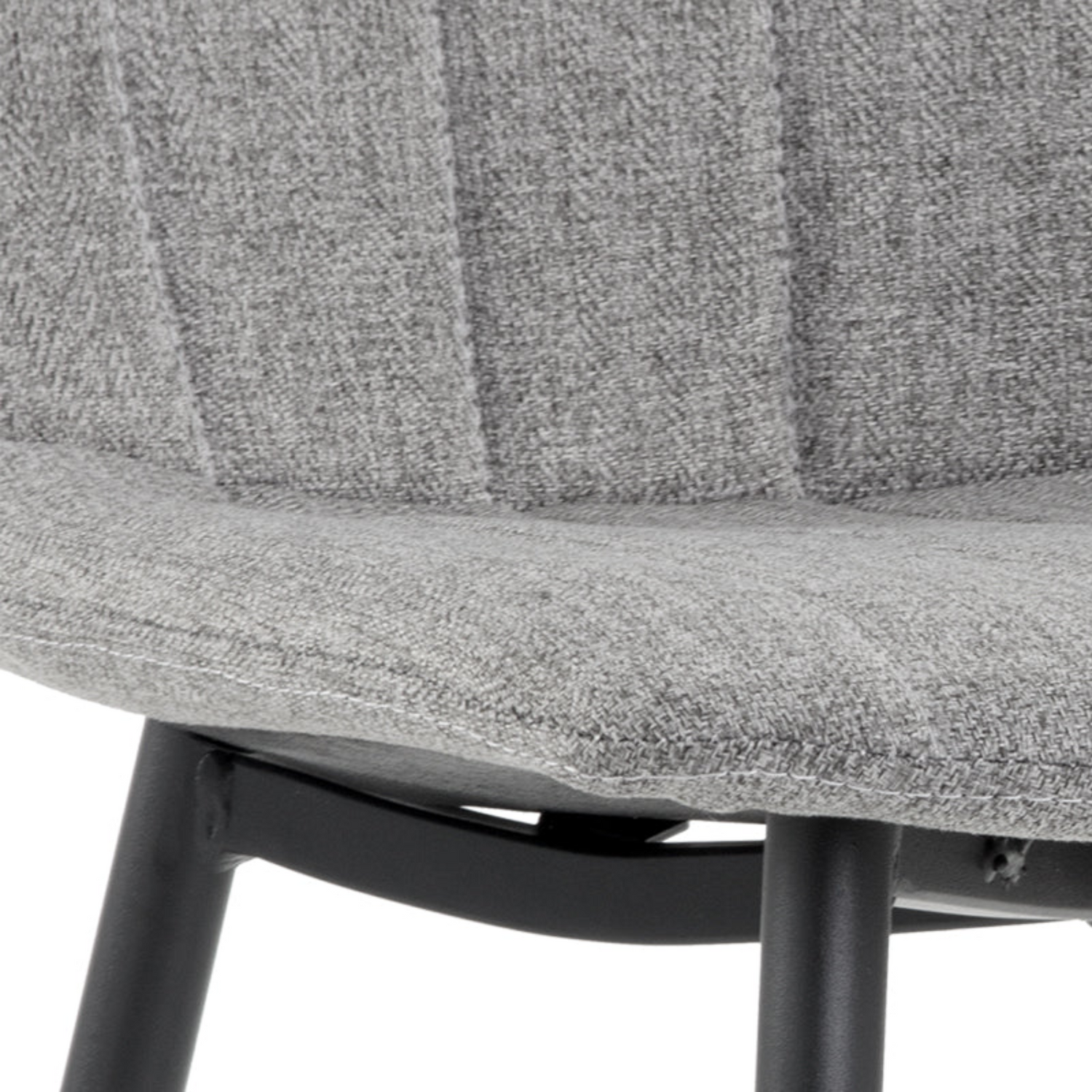 This compact dining chair creates a cool and casual mood. Features channel tufting on the seat and seatback. Stocked in light grey fabric with a black powder-coated steel frame.