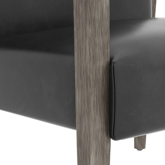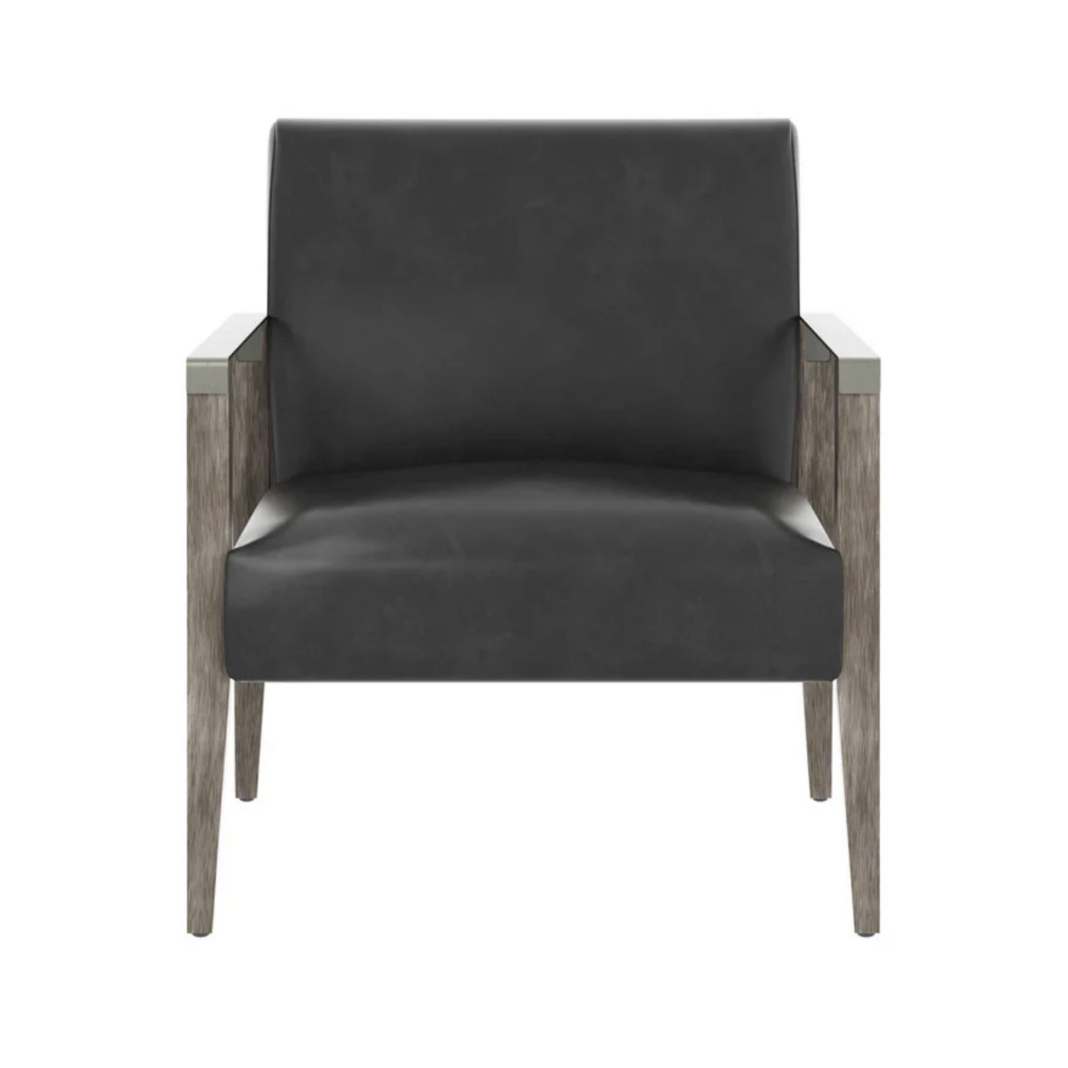 Modern with a refined edge, this lounge chair will bring comfort to any space without compromising style. Stocked in brentwood charcoal leather with a solid ash grey oak wood frame. Completed with accenting pewter metal armests. Dining armchair version also available. As wood is an organic, porous material, these pieces will contain natural variations of texture and may also exhibit fine indentations and cracks. Wood pieces will also display a disparity of color and grain, and visible knots and burls that add to the character of each piece. Handle with Care: This design has been crafted with 100% leather. Leather is a natural material; as such, color variations, markings, wrinkles, grooves and light scratches are acceptable and appreciated characteristics. No two pieces are alike.