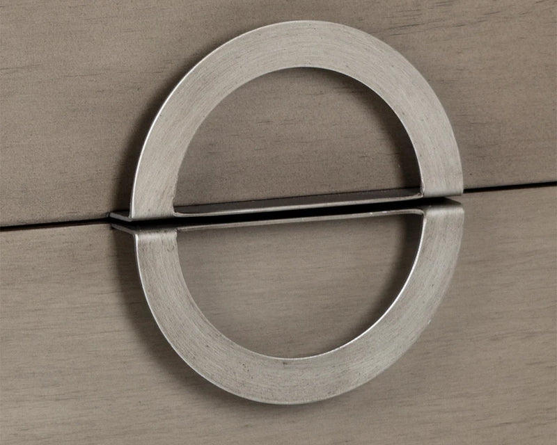 This handcrafted nightstand will add a unique design to any bedroom. Made from ash grey wood veneer with two soft closing drawers. Antique silver hardware completes the look. As wood is an organic, porous material, these pieces will contain natural variation of texture and may also exhibit fine indentations and cracks. Wood pieces will also display a disparity of color and grain, and visible knots and burls that add to the character of each piece.