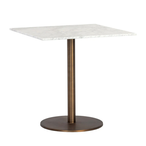 An Art Deco inspired 30" square bistro table, featuring a solid Carrara marble top with an antique gold steel base. Perfect for restaurants and smaller dining spaces. As marble is a natural material, unique veining, pitting, fissures, micro-cracks and color variations are all characteristics that add to the uniqueness and beauty of each piece.