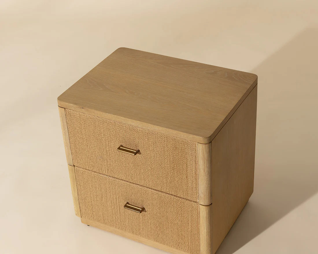 The Etienne Nightstand boasts a linear profile with a warm design. Constructed from a rustic oak veneer with solid oak wood legs and a matching rope covering on the doors. Antique brass handles complement the piece. As wood is an organic, porous material, these pieces will contain natural variation of texture and may also exhibit fine indentations and cracks. Wood pieces will also display a disparity of color and grain, and visible knots and burls that add to the character of each piece.