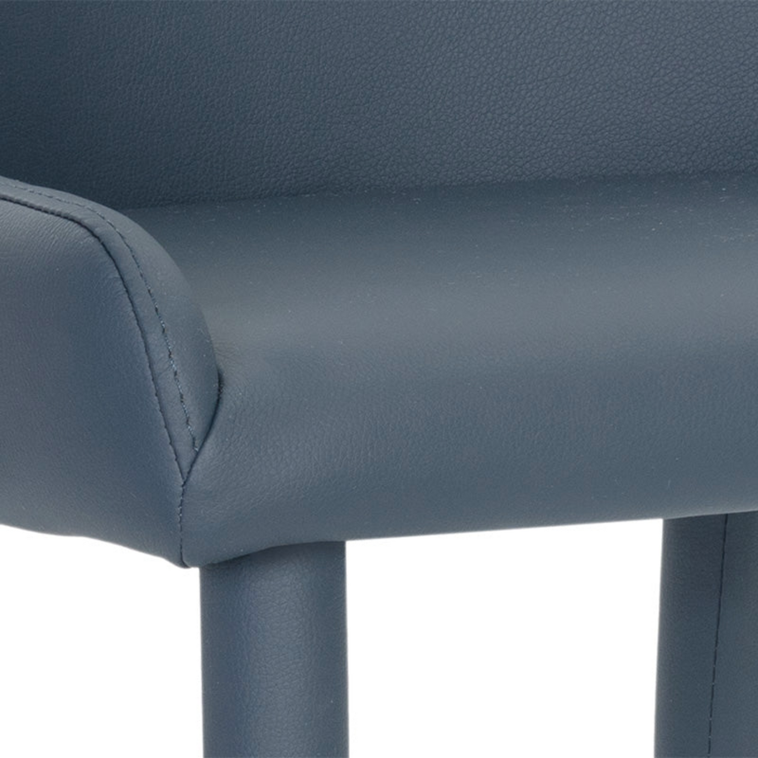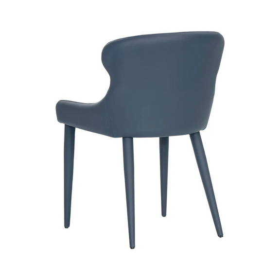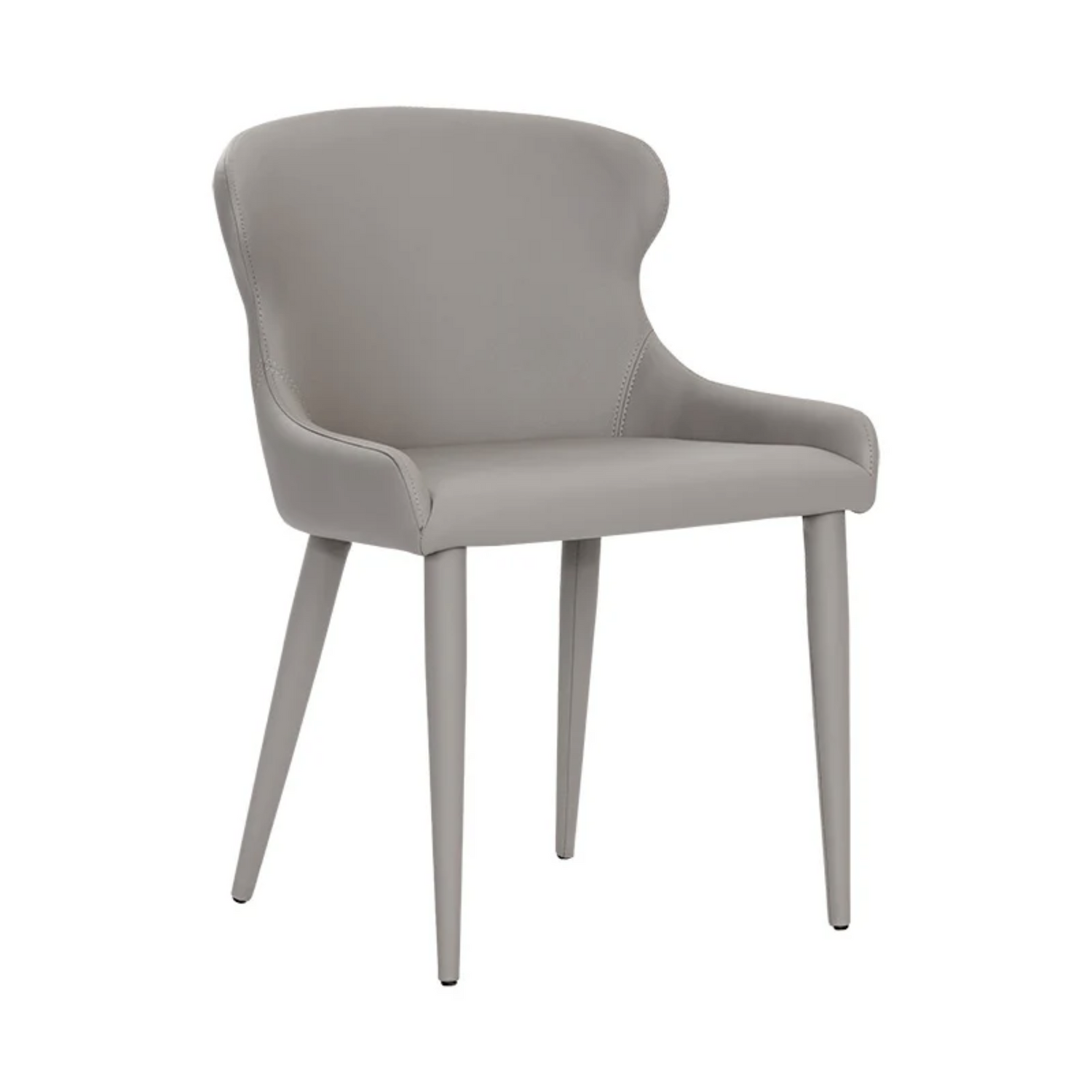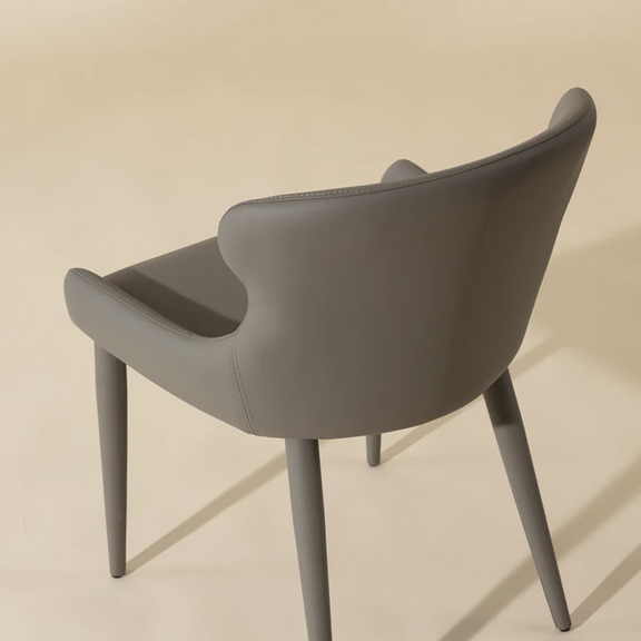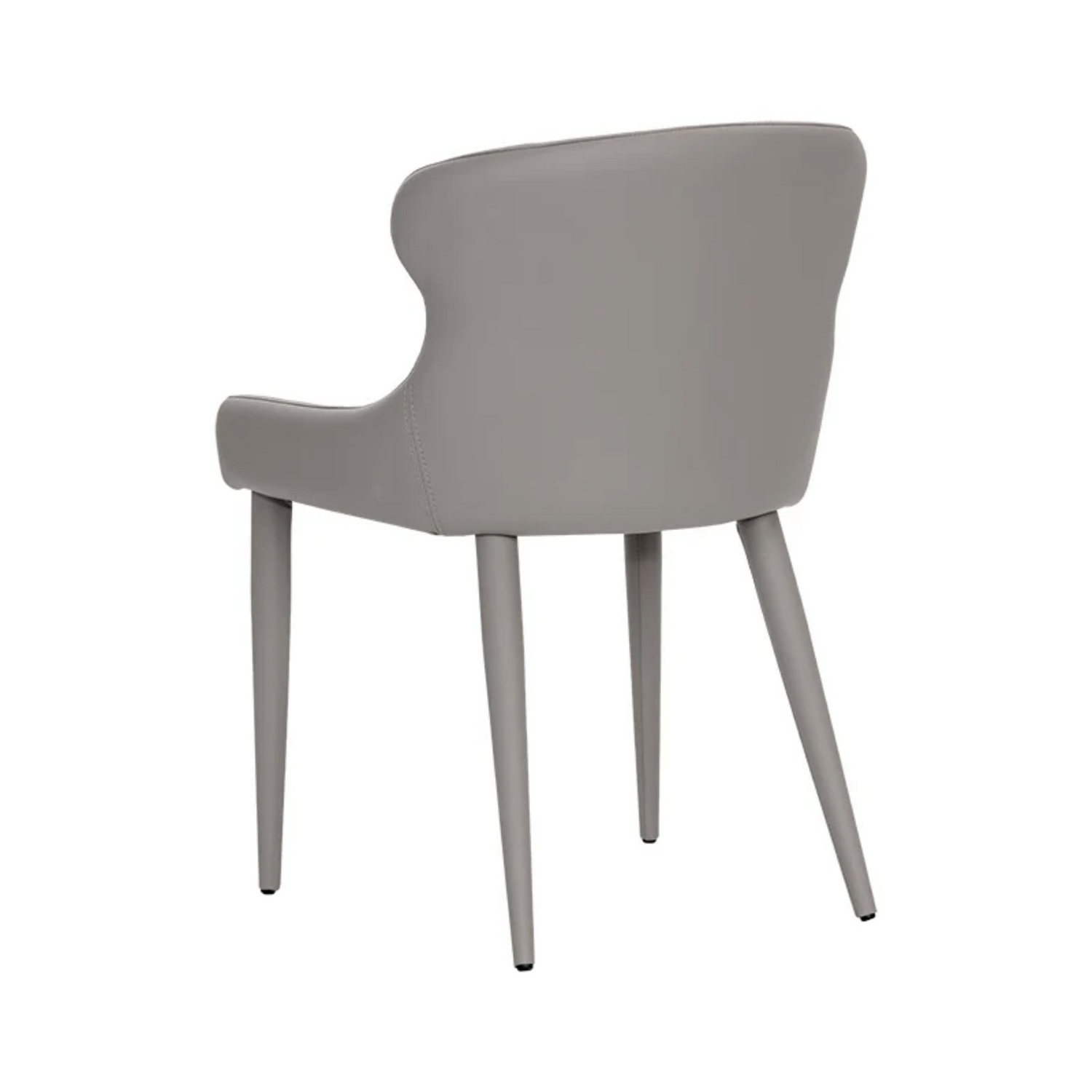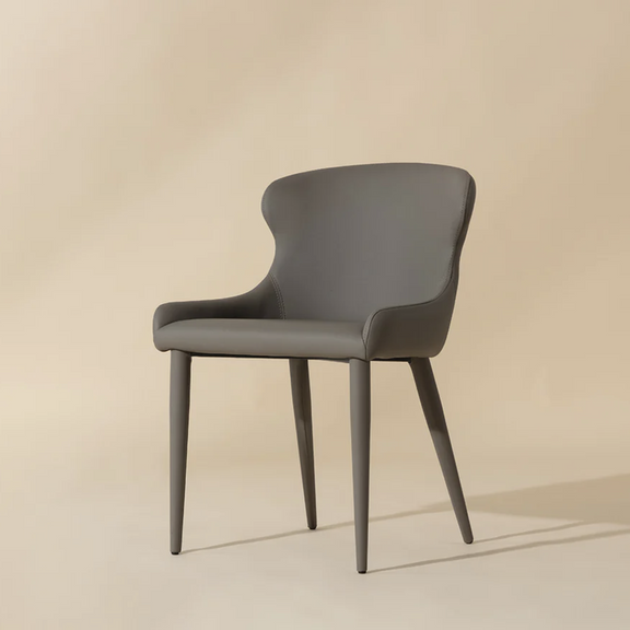A gorgeous dining chair that features a sleek and minimal profile. Stylishly designed with tone-on-tone colors, this chair is stocked in dillon thunder faux leather and completed with metal upholstered legs.
