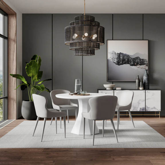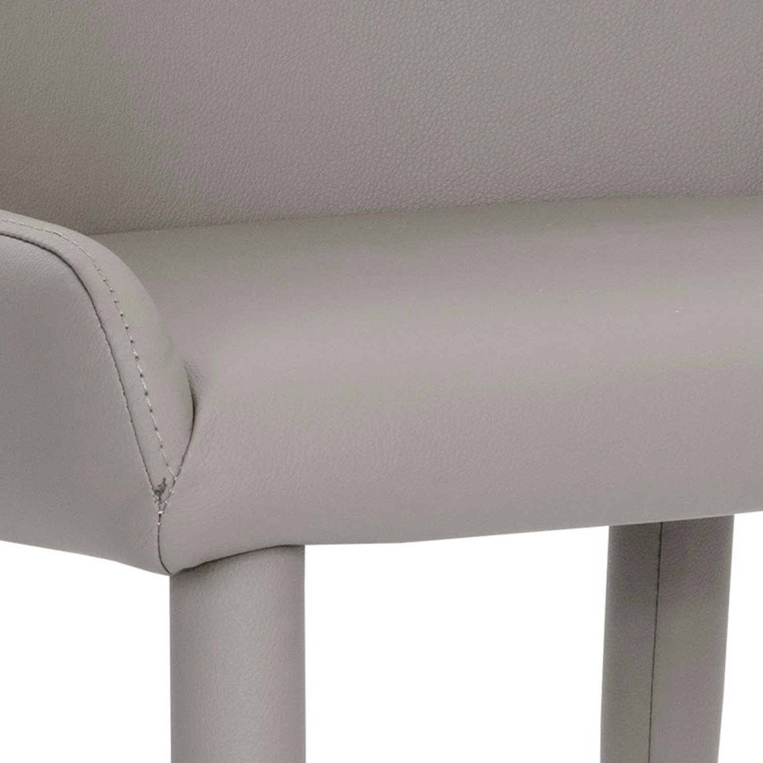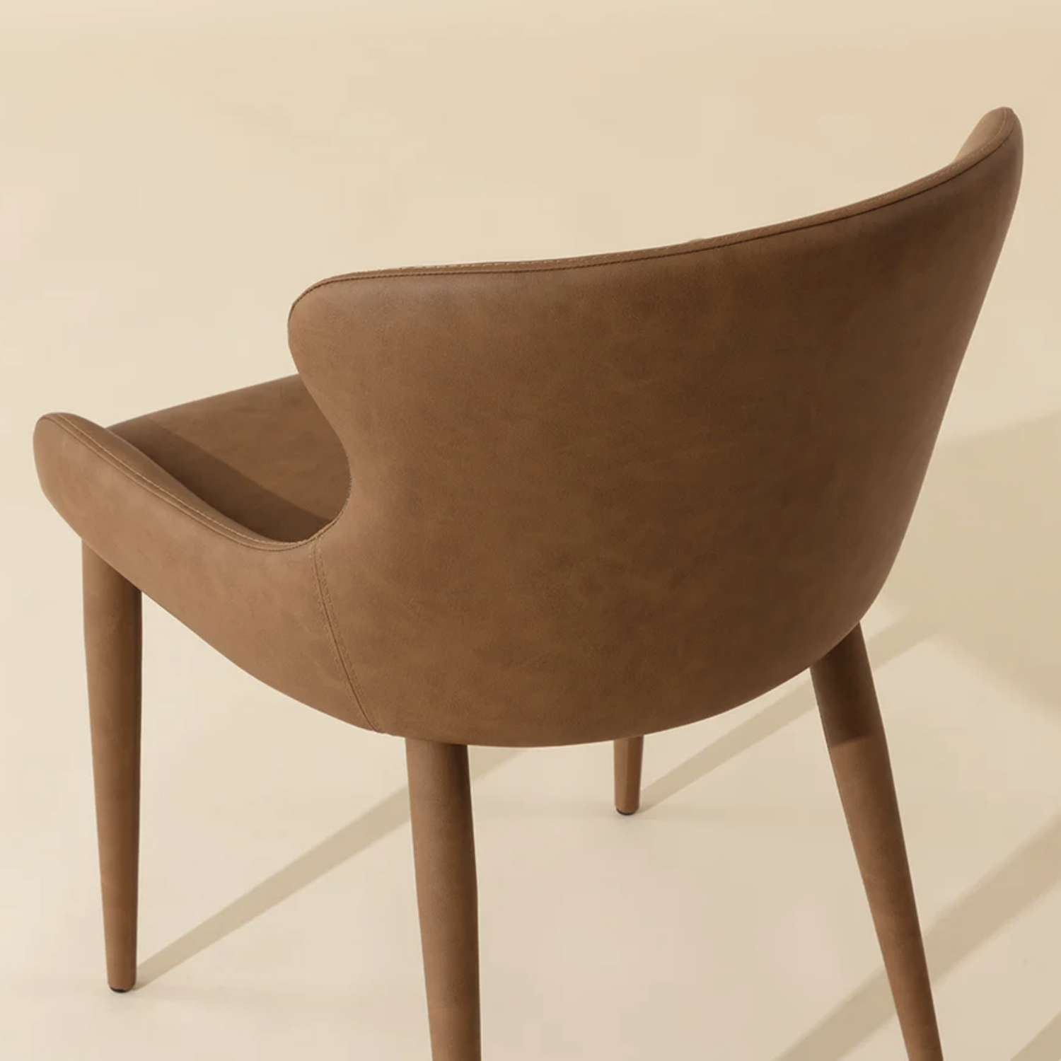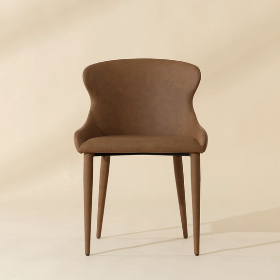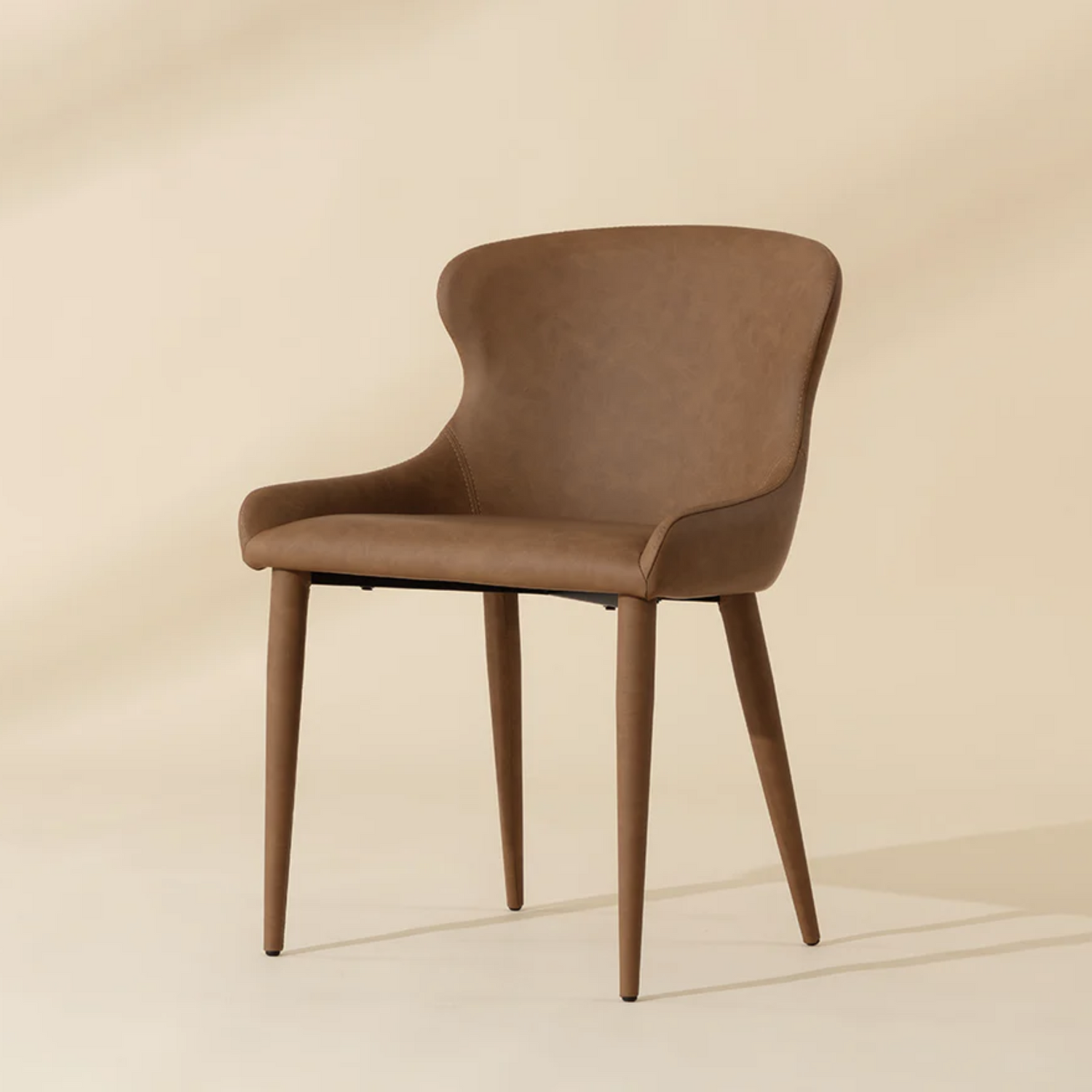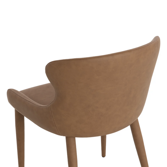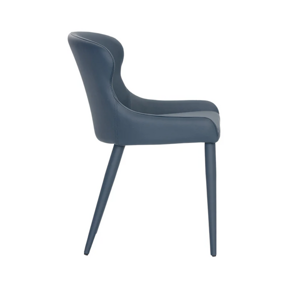 A gorgeous dining chair that features a sleek and minimal profile. Stylishly designed with tone-on-tone colors, this chair is stocked in dillon thunder faux leather and completed with metal upholstered legs.