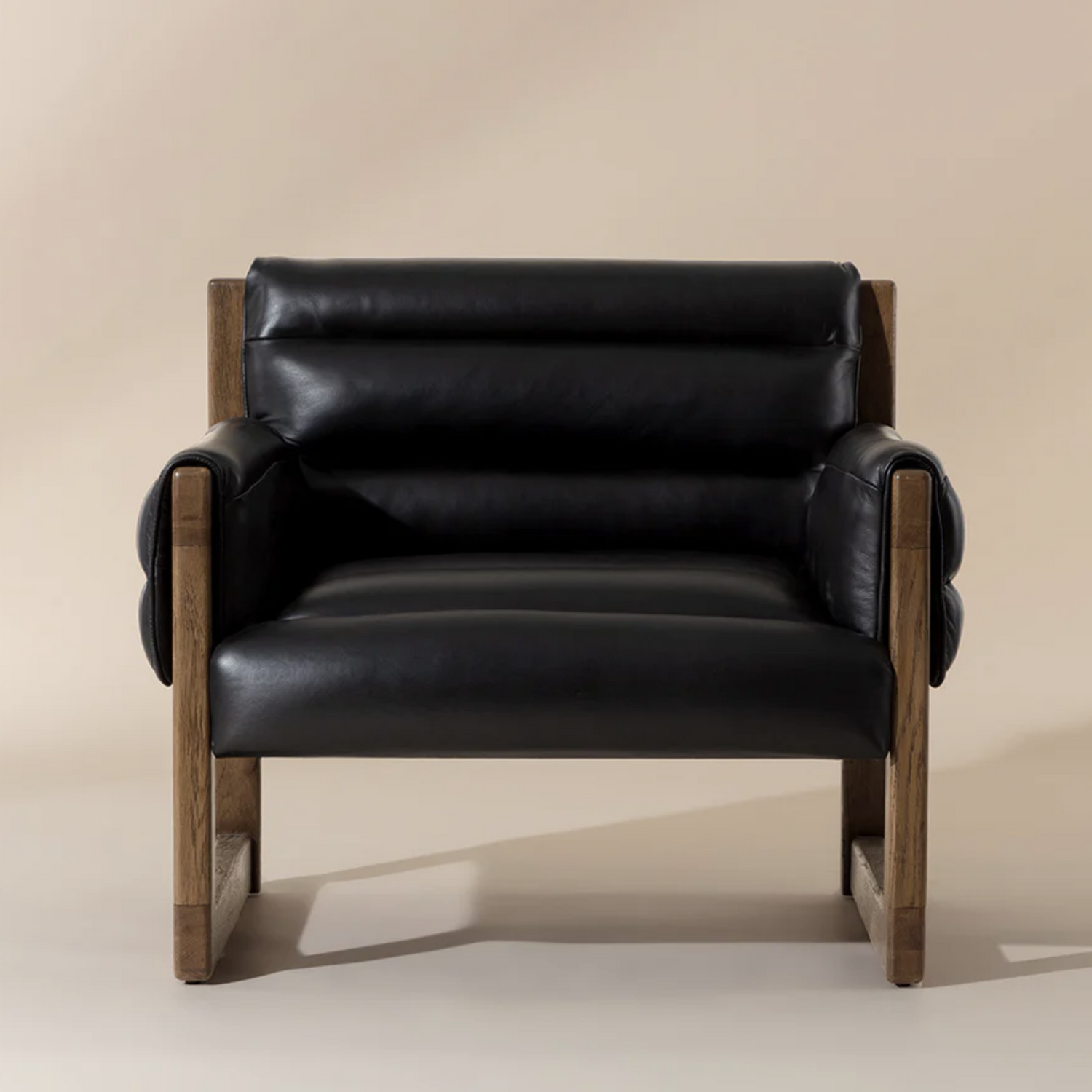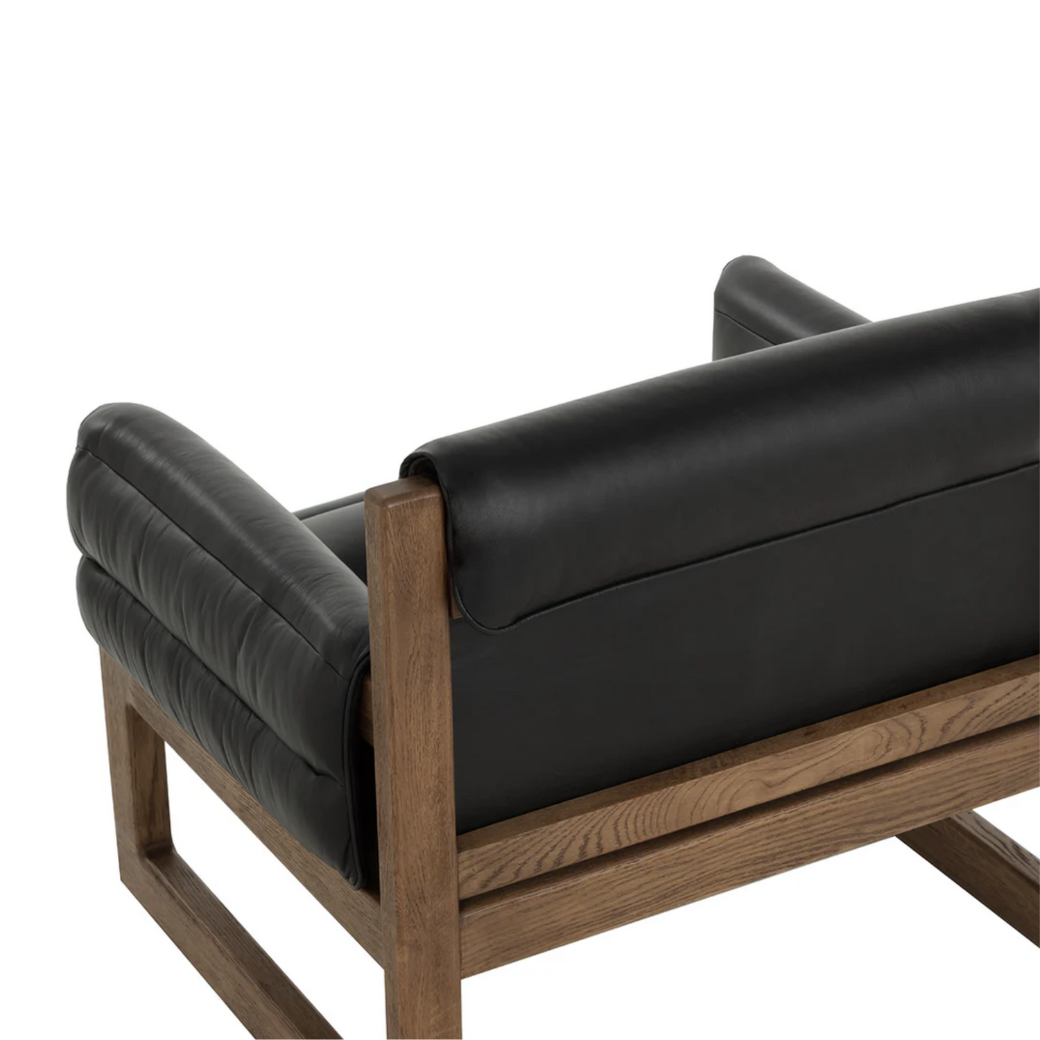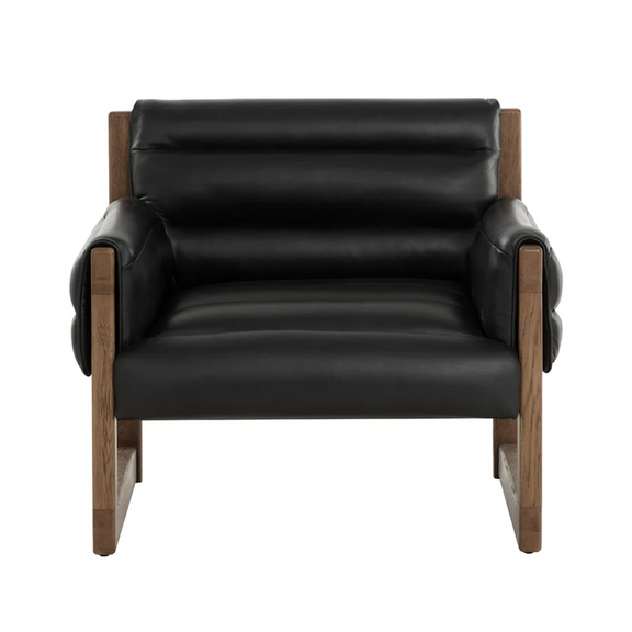 Beautiful and stylish, the Ferguson Lounge Chair is sure to impress. Nestled within a warm brown oak wood frame are channel tufted cushions upholstered in vintage black night leather, making the most of its lavish yet cozy appearance. Matching channel tufted padding wraps over the armrests to embrace guests in a beacon of luxurious comfort.