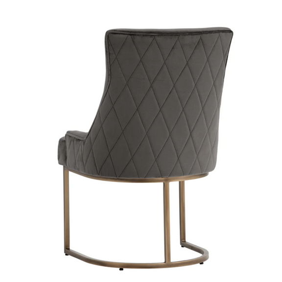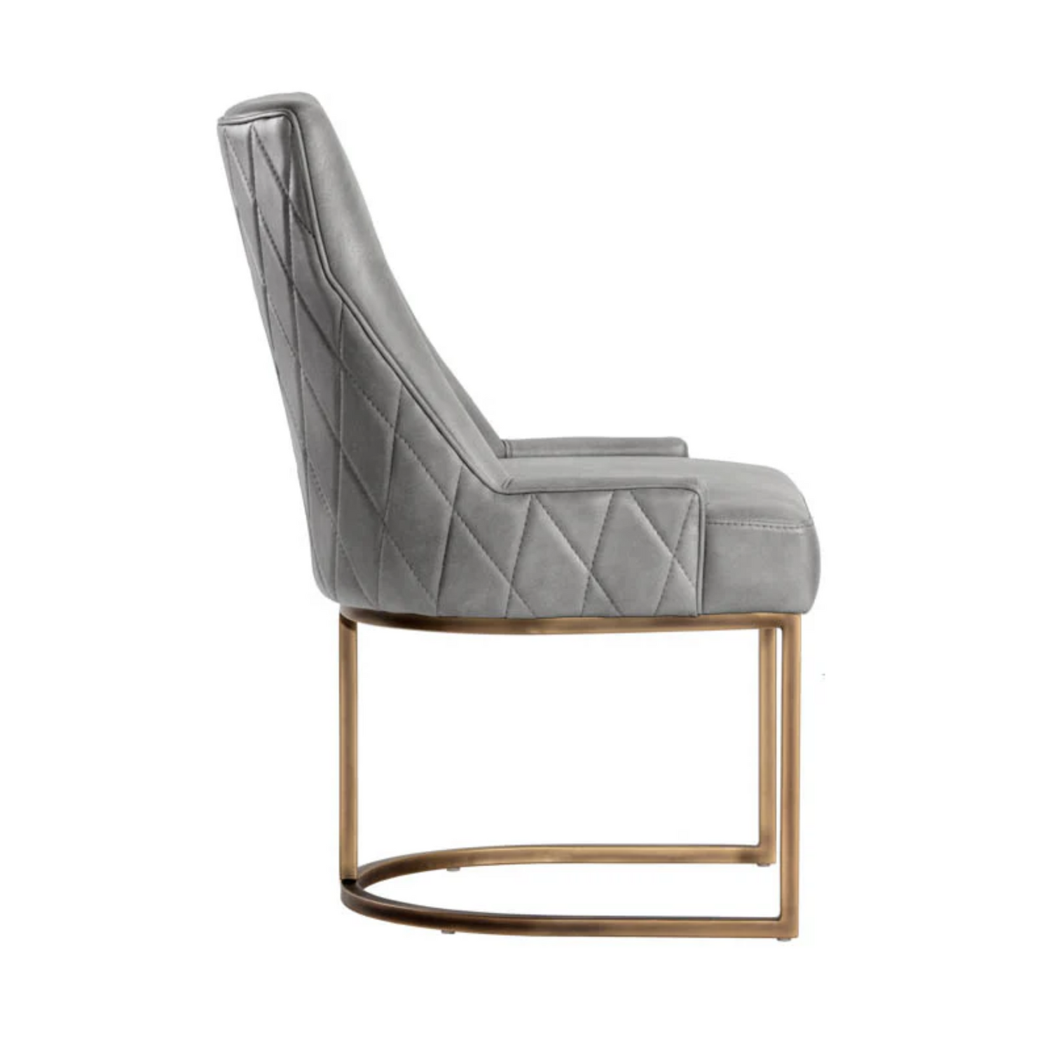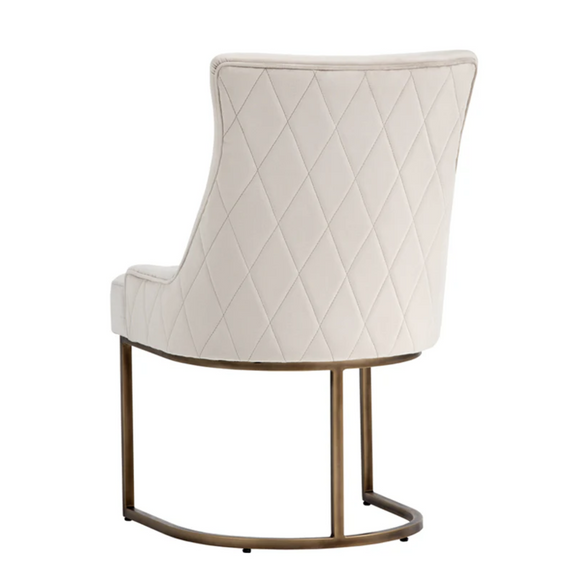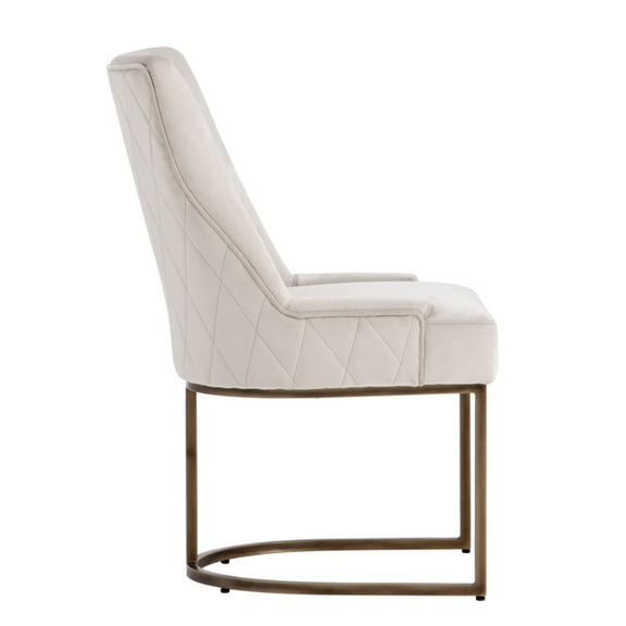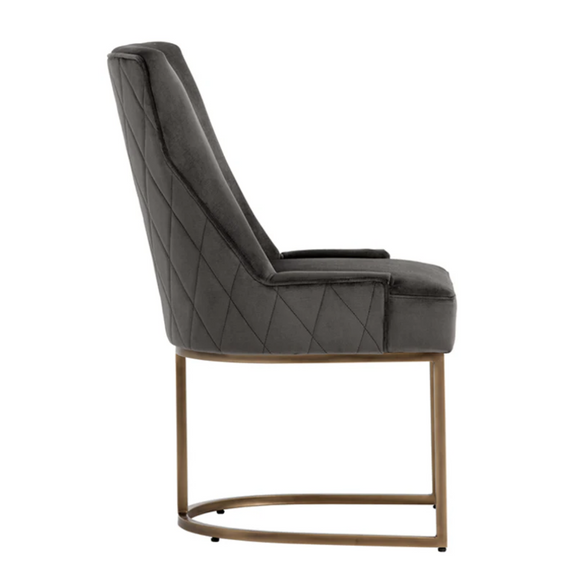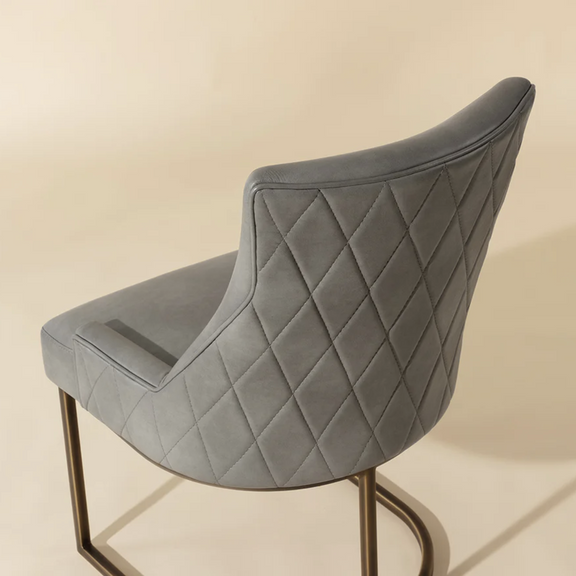 This dining chair offers transitional elegance. Features a beautifully sculpted seat in our soft piccolo prosecco performance fabric with a rustic bronze cantilever frame. A diamond stitched pattern on the exterior seatback adds a touch of beauty to complete the look. Performance fabric is moisture repellant, durable and easy to clean.