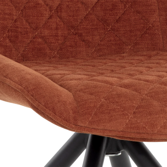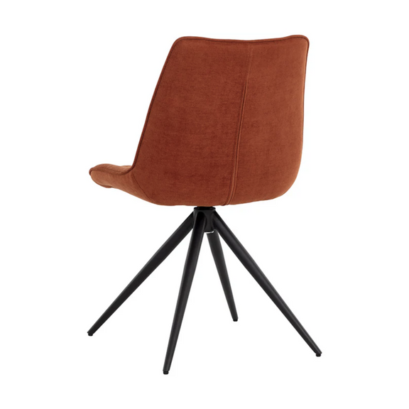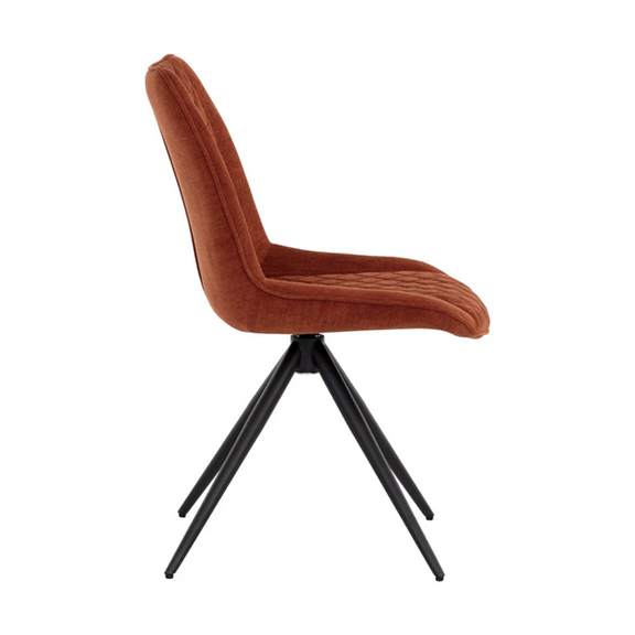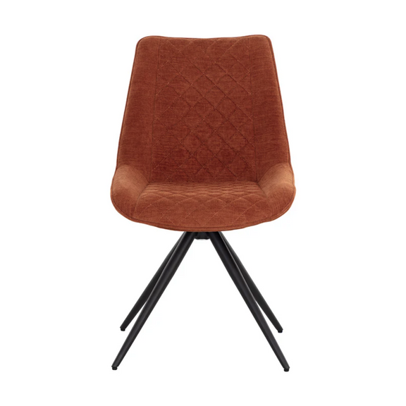 Distinguished by its beautiful form, this swivel dining chair takes inspiration from mid-century designs. Diamond stitching on the seat and seatback add character. Stocked in danny rust fabric and completed with powder-coated iron legs in a matte black finish.