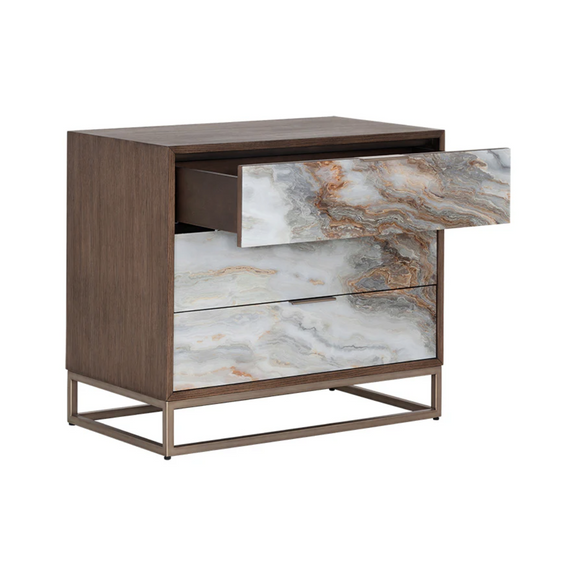 Incorporate a touch of extravagance to any bedroom space with this brilliant nightstand that is full of rich detail. Features a brown oak veener body with printed acrylic doors that share a likeness to mother of pearl. Ample storage is available inside the three cabinets which includes soft close doors. Completed with a steel base in a brass finish.