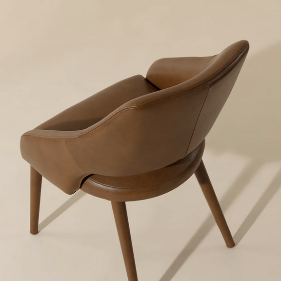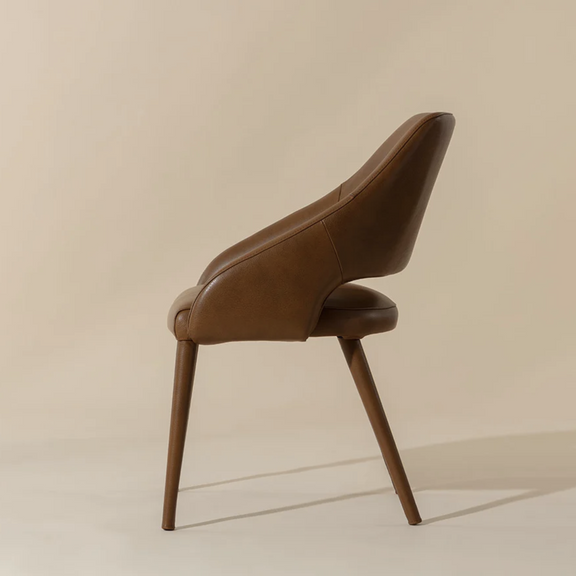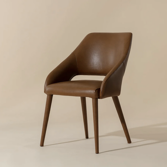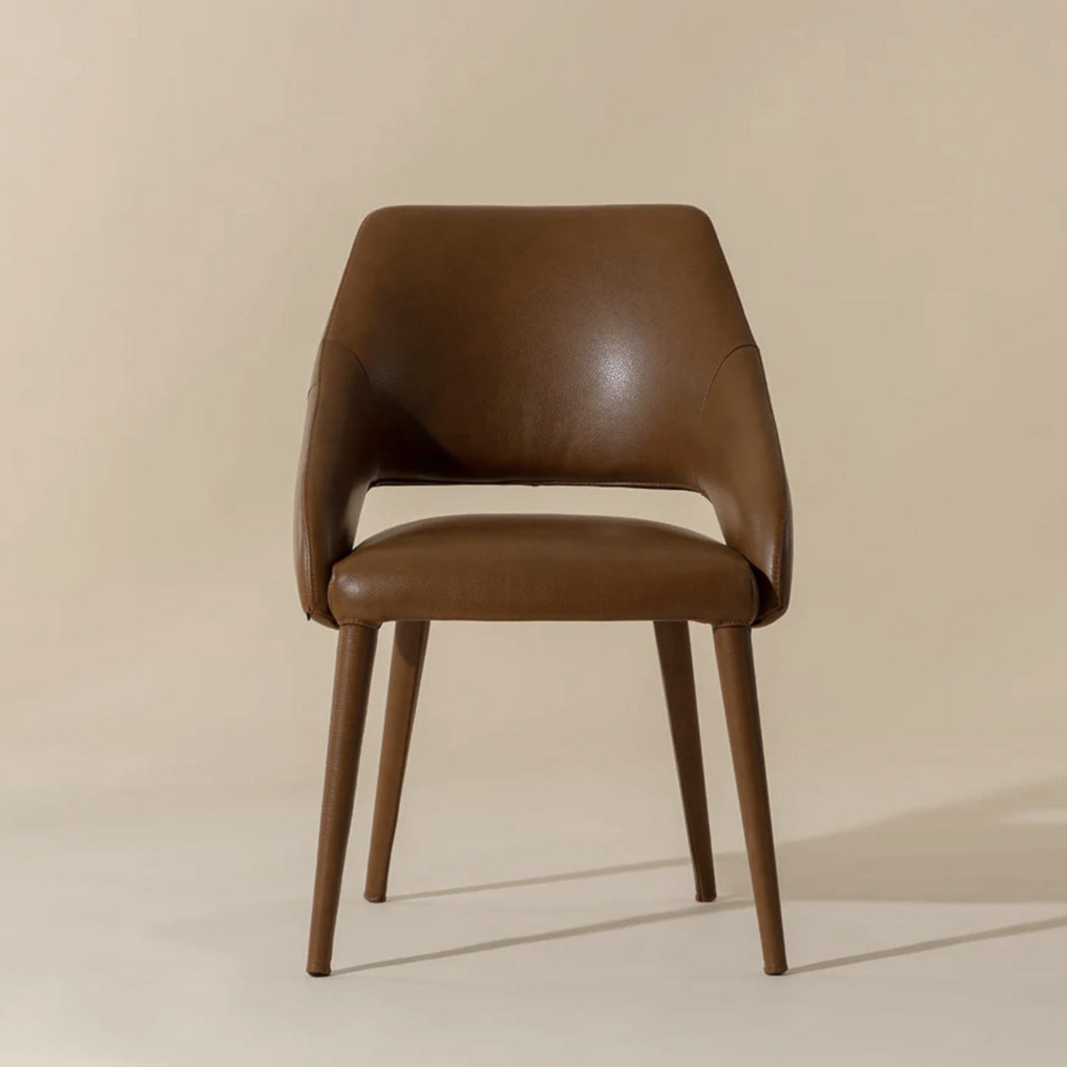 With a modern and monochromatic design, the Galen Dining Armchair will stun in any dining space. Fully upholstered in Missouri cognac leather, its minimal profile features sloped arms and a cutout back rest for everyday comfort. Handle with Care: This design has been crafted with 100% leather. Leather is a natural material; as such, color variations, markings, wrinkles, grooves and light scratches are acceptable and appreciated characteristics. No two pieces are alike.
