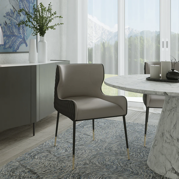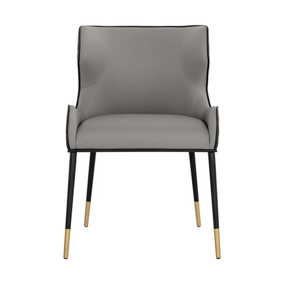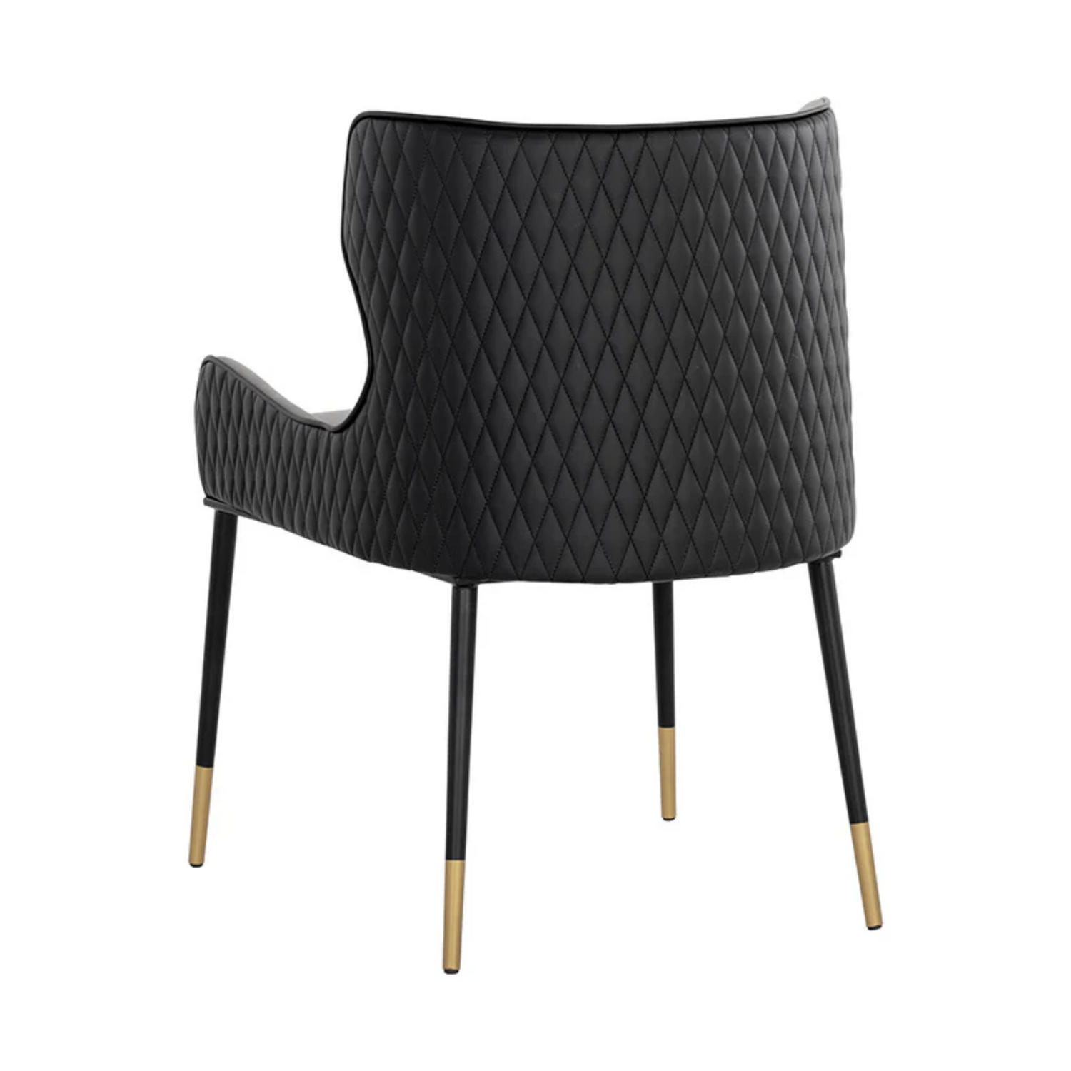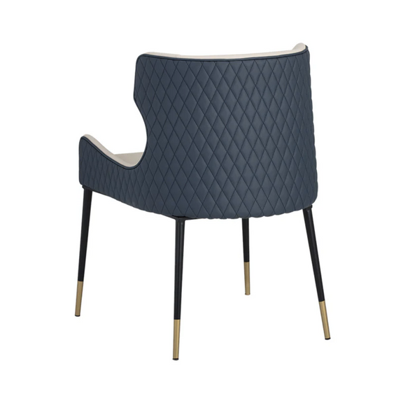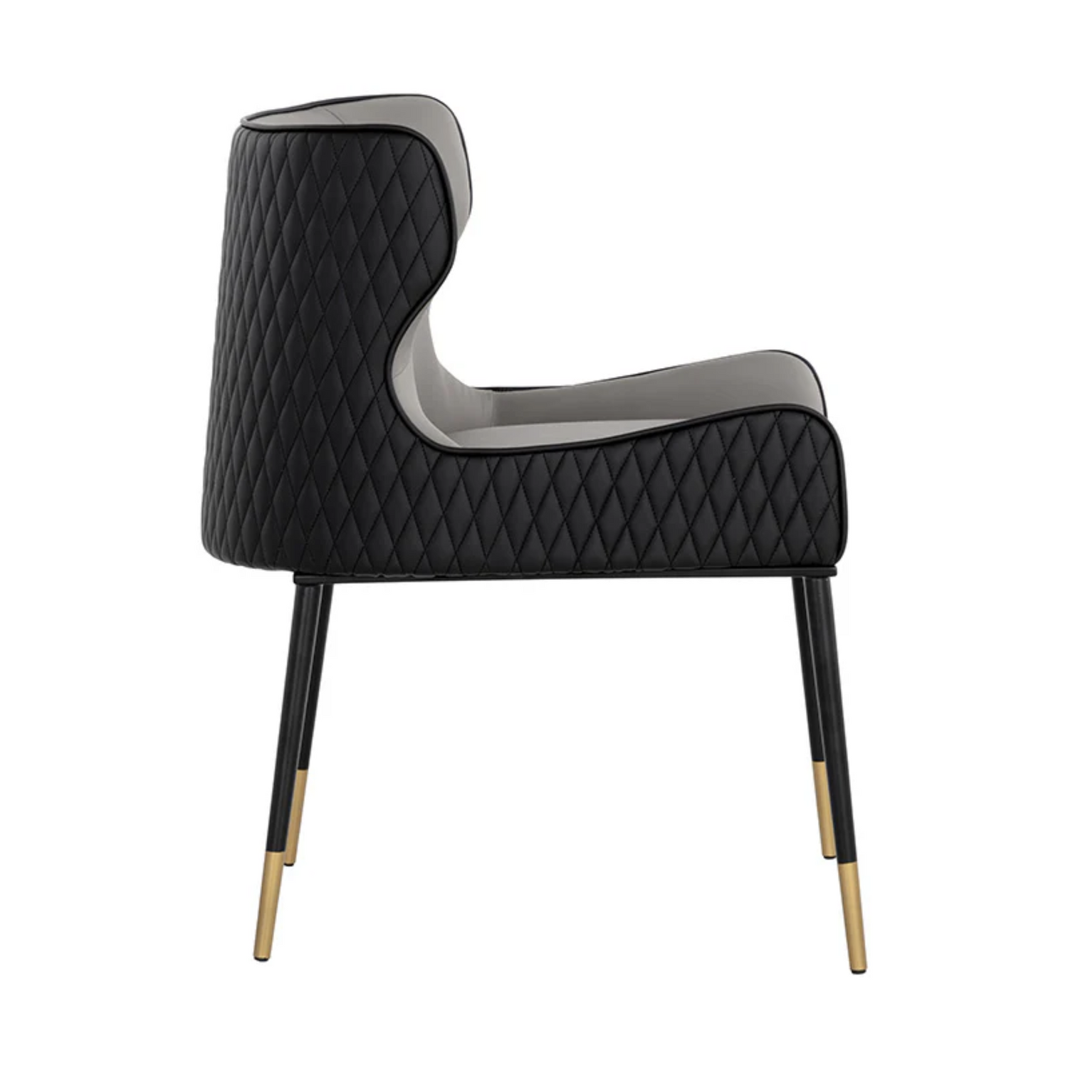A classic dining chair featuring a substantial seat upholstered in contrasting dillon stratus and black faux leather. Diamond stitching on the seatback adds a hint of elegance while black wood legs and brushed gold foot caps complete the look. Handle With Care: This design has been crafted with faux leather. Faux leather is manufactured to reflect the natural characteristics of leather; as such, colour variations, markings, wrinkles, grooves, and light scratches are appreciated characteristics. No two pieces will be alike.