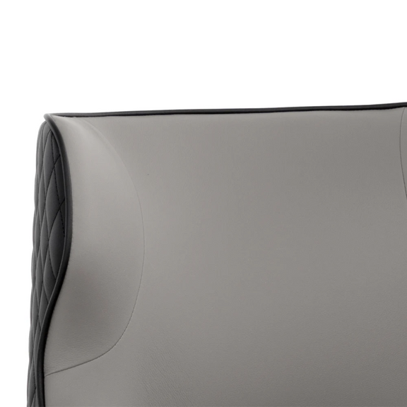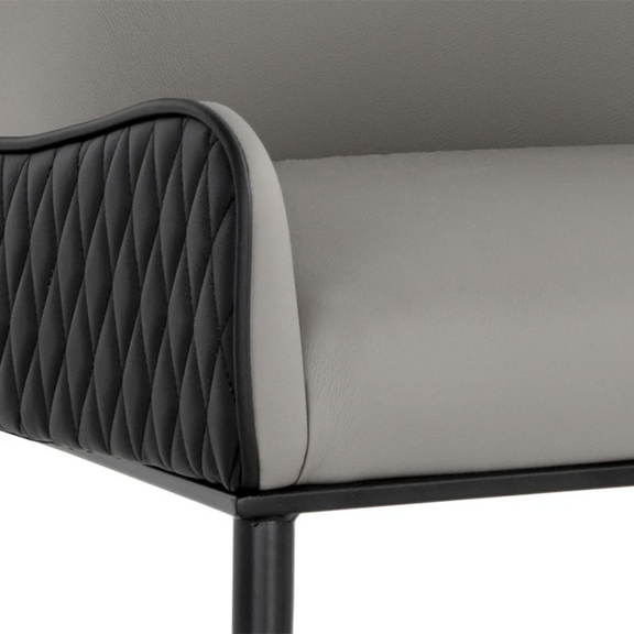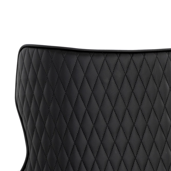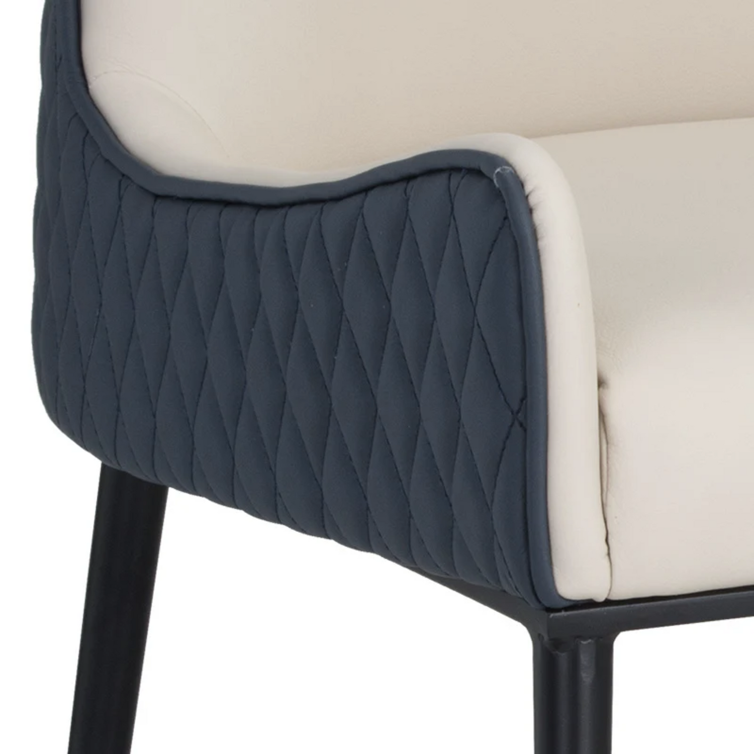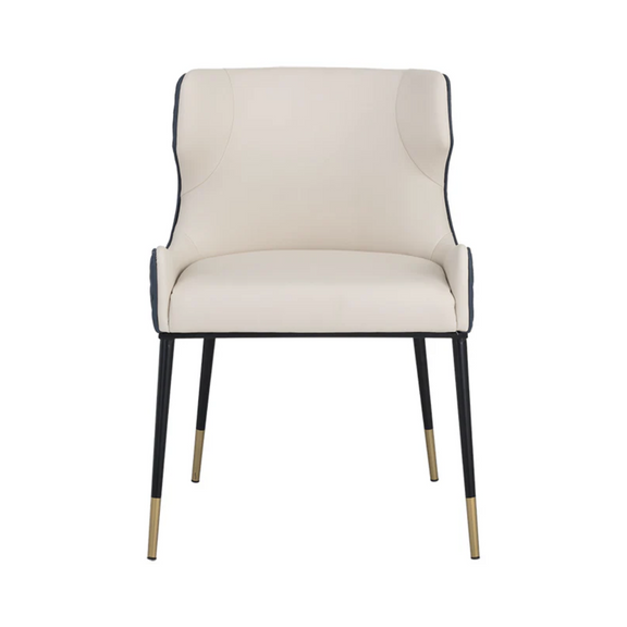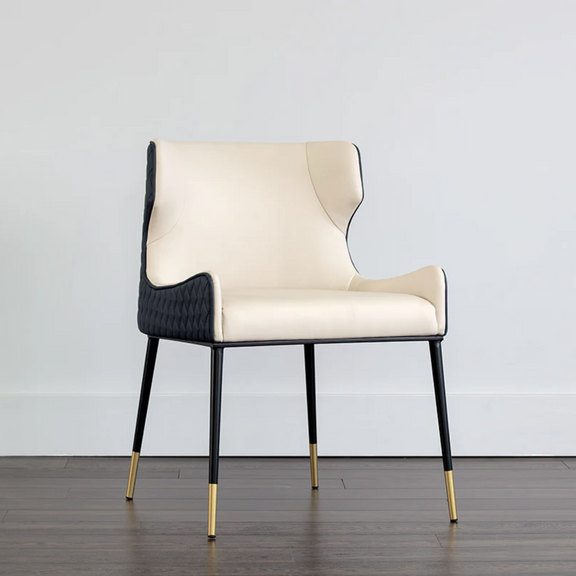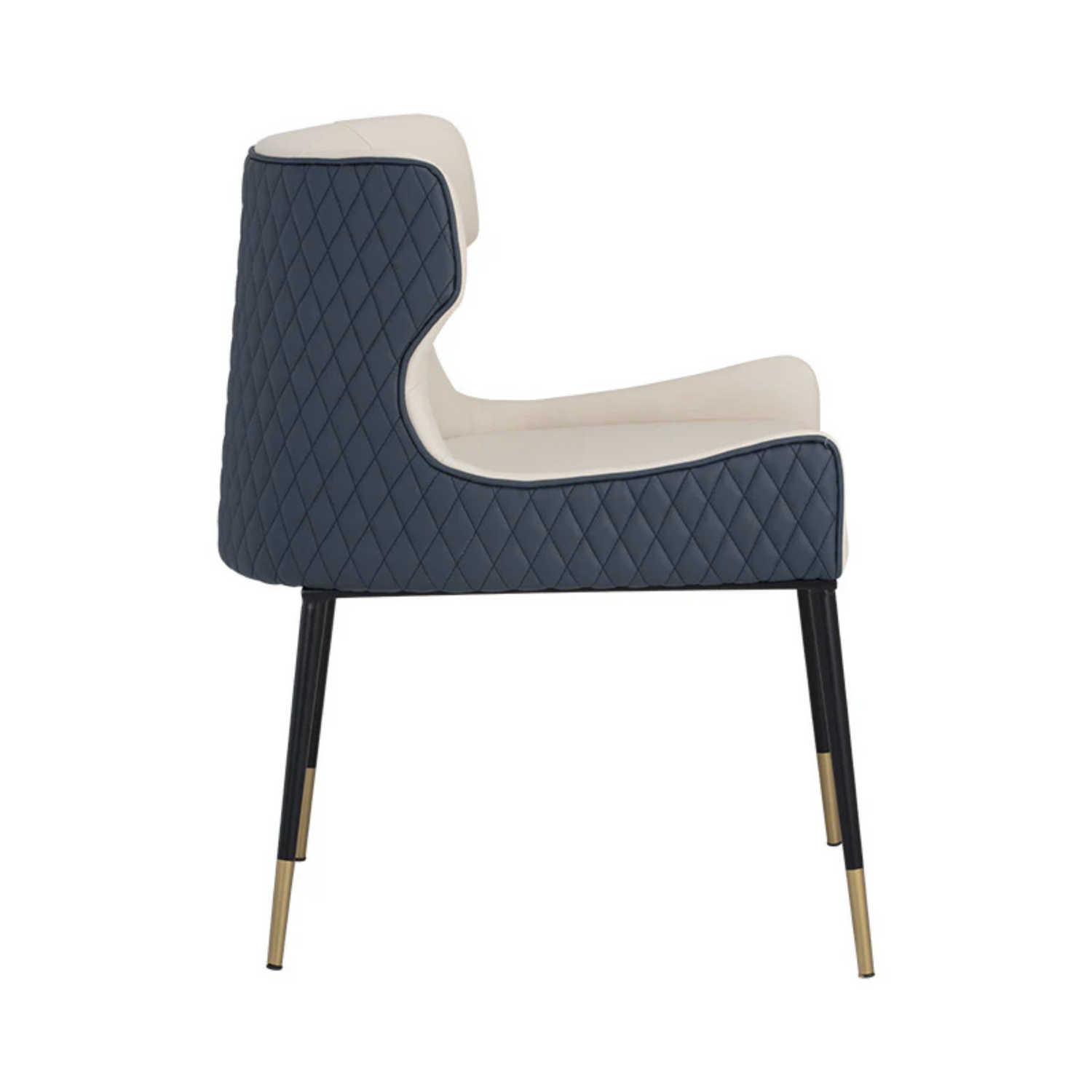 A classic dining chair featuring a substantial seat upholstered in contrasting dillon stratus and black faux leather. Diamond stitching on the seatback adds a hint of elegance while black wood legs and brushed gold foot caps complete the look. Handle With Care: This design has been crafted with faux leather. Faux leather is manufactured to reflect the natural characteristics of leather; as such, colour variations, markings, wrinkles, grooves, and light scratches are appreciated characteristics. No two pieces will be alike.