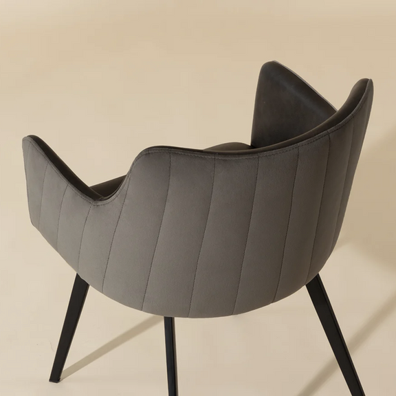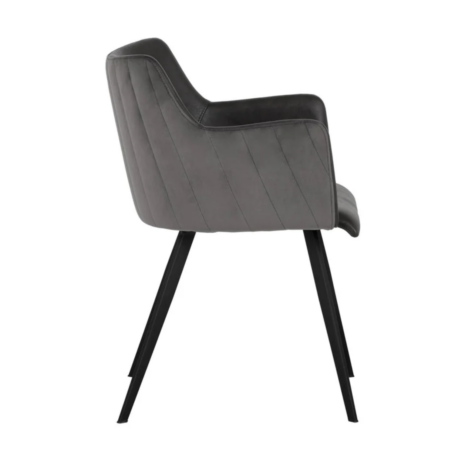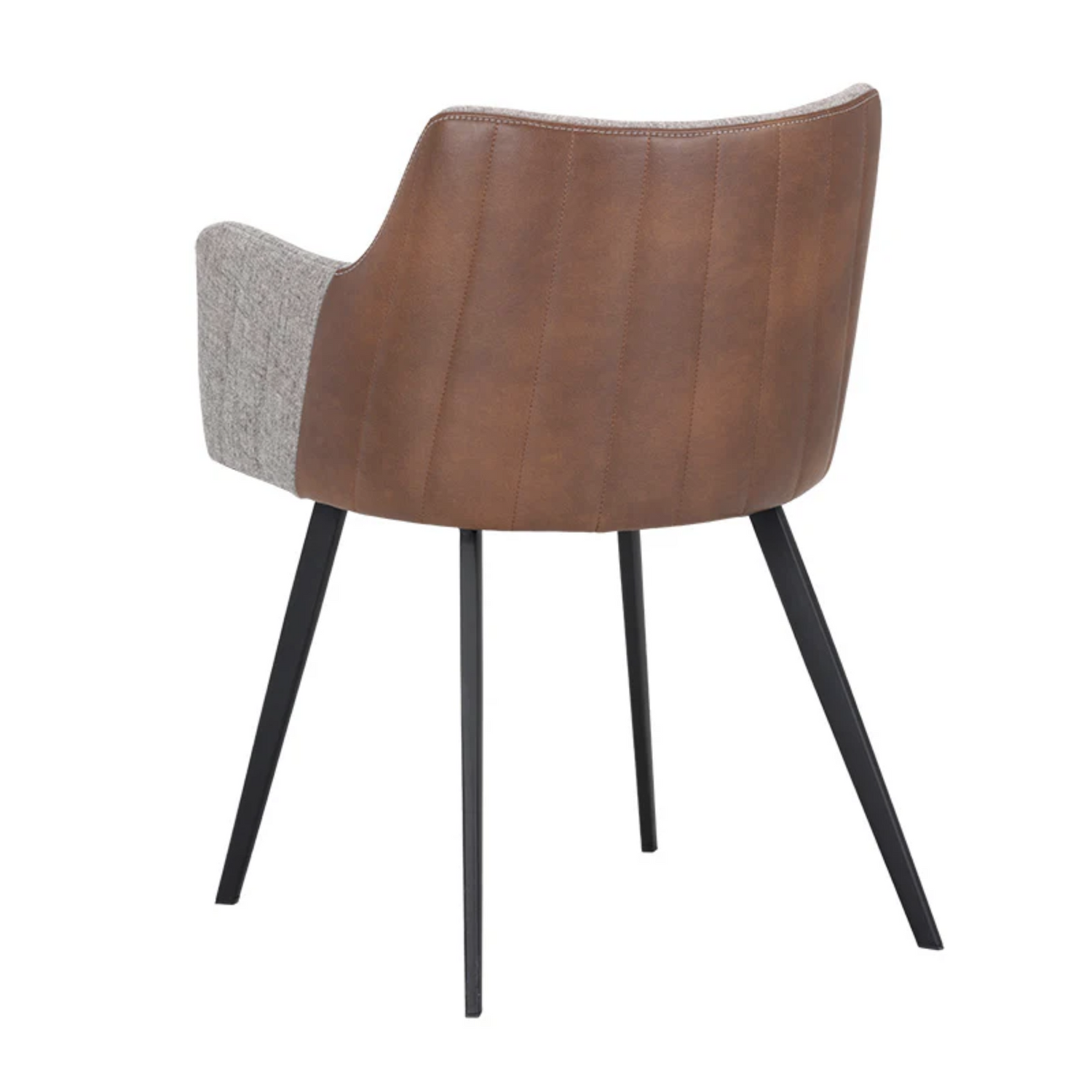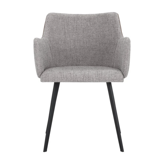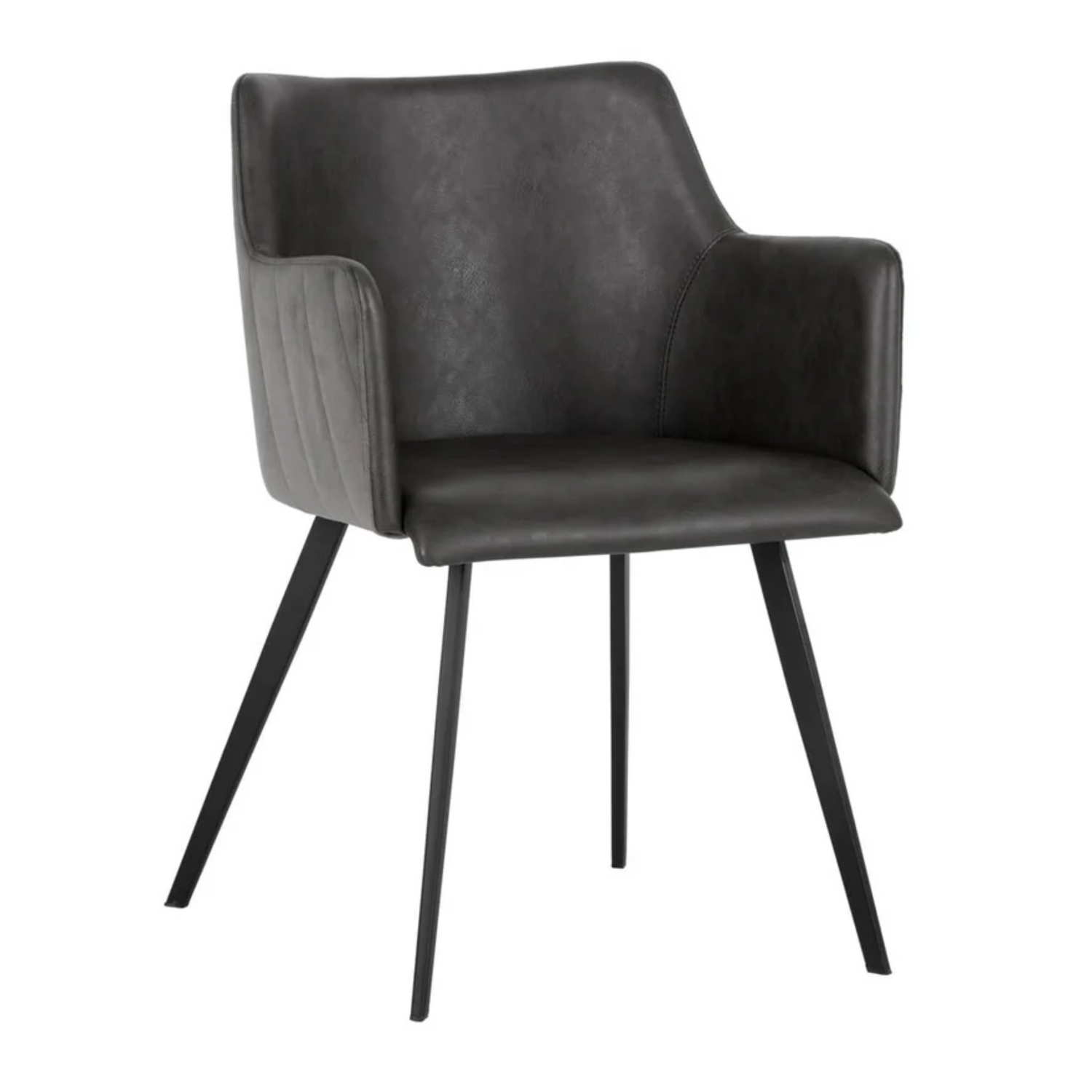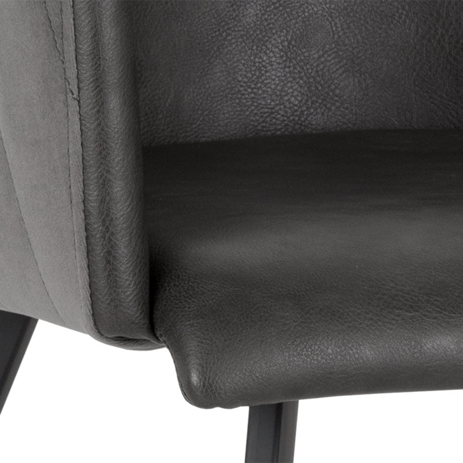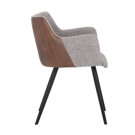 This modern dining armchair will provide comfort and style to any residential or commercial space. Features an interior seat in town grey faux leather and contrasting channel stitched exterior seatback in roman grey fabric. Finished with sturdy black powder-coated iron legs. Handle With Care: This design has been crafted with faux leather. Faux leather is manufactured to reflect the natural characteristics of leather; as such, colour variations, markings, wrinkles, grooves, and light scratches are appreciated characteristics. No two pieces will be alike.