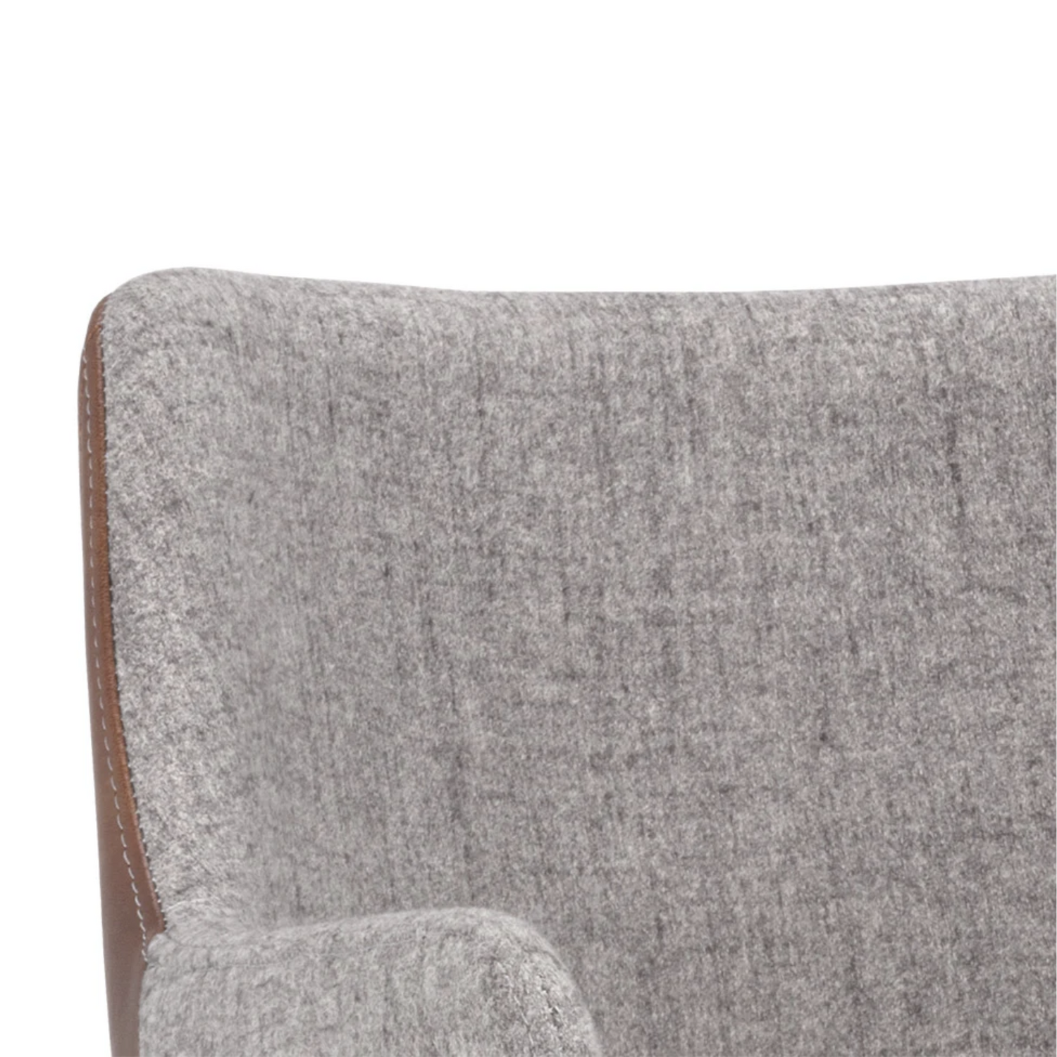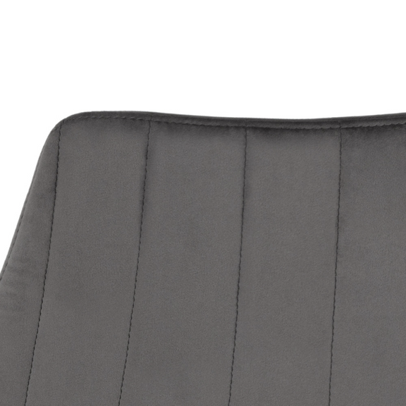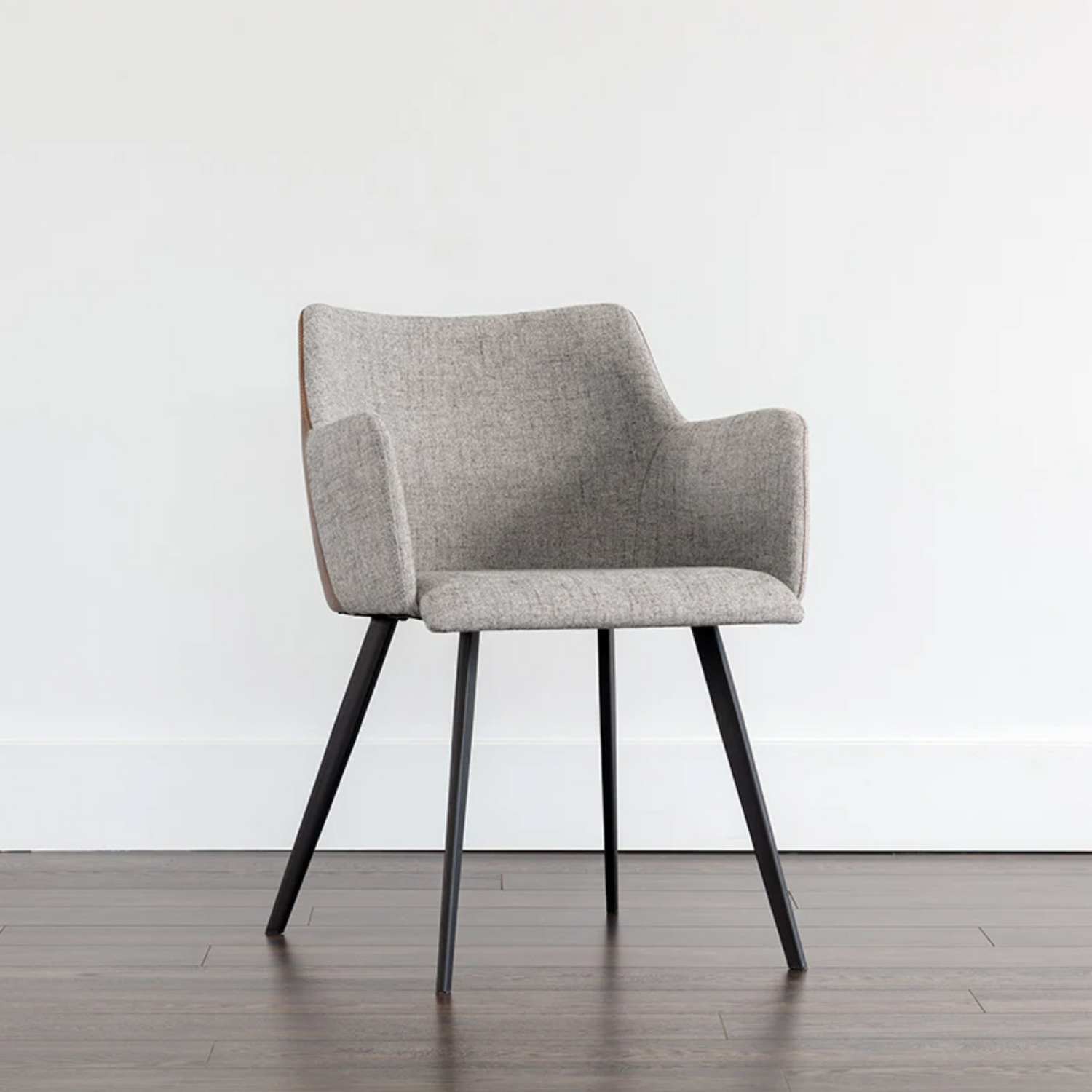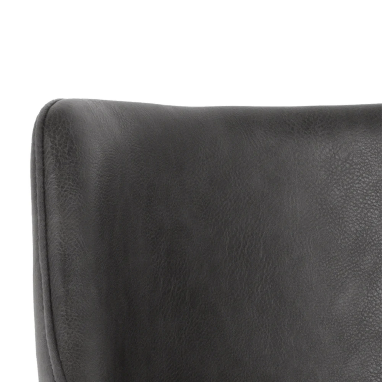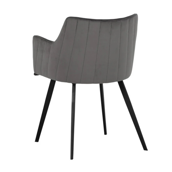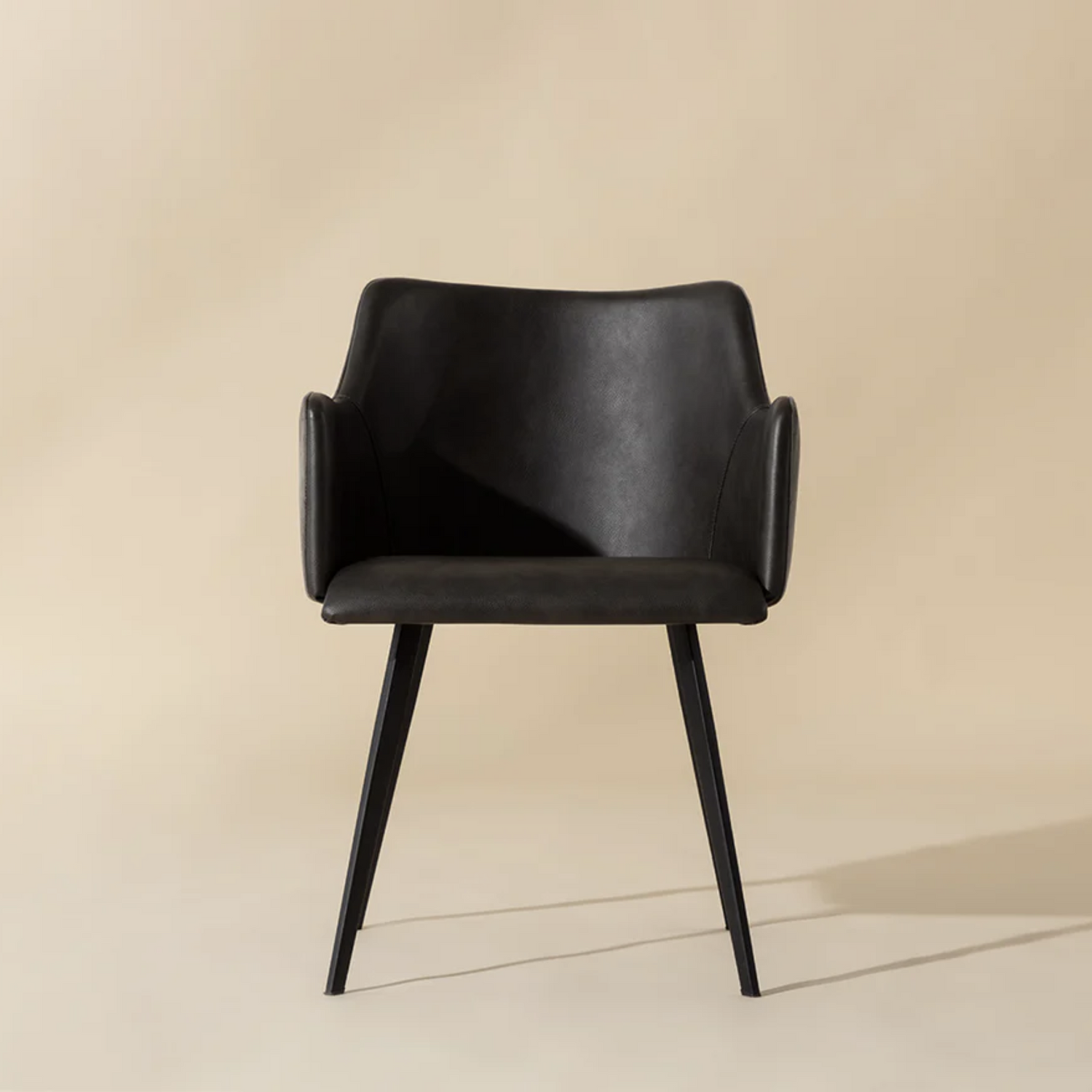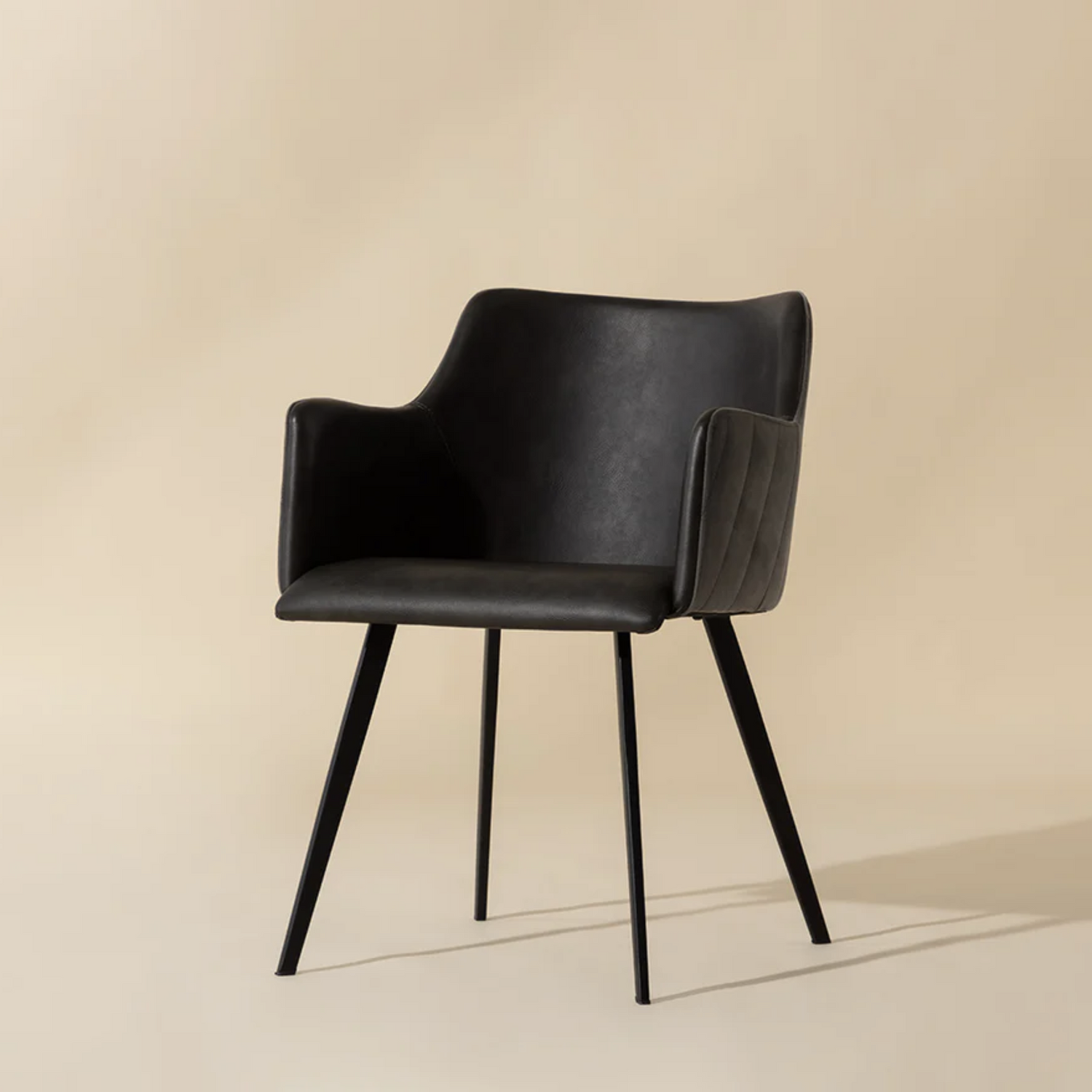 This modern dining armchair will provide comfort and style to any residential or commercial space. Features an interior seat in town grey faux leather and contrasting channel stitched exterior seatback in roman grey fabric. Finished with sturdy black powder-coated iron legs. Handle With Care: This design has been crafted with faux leather. Faux leather is manufactured to reflect the natural characteristics of leather; as such, colour variations, markings, wrinkles, grooves, and light scratches are appreciated characteristics. No two pieces will be alike.