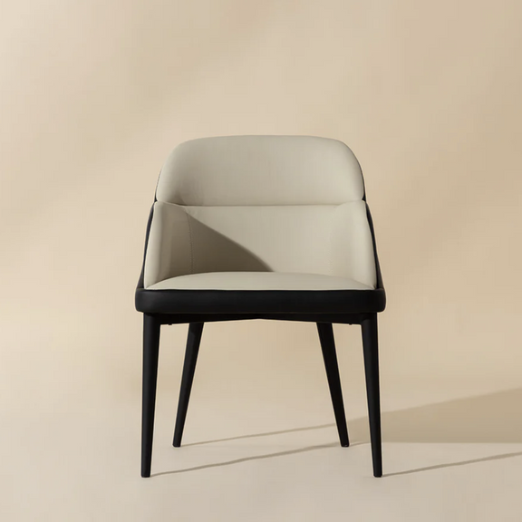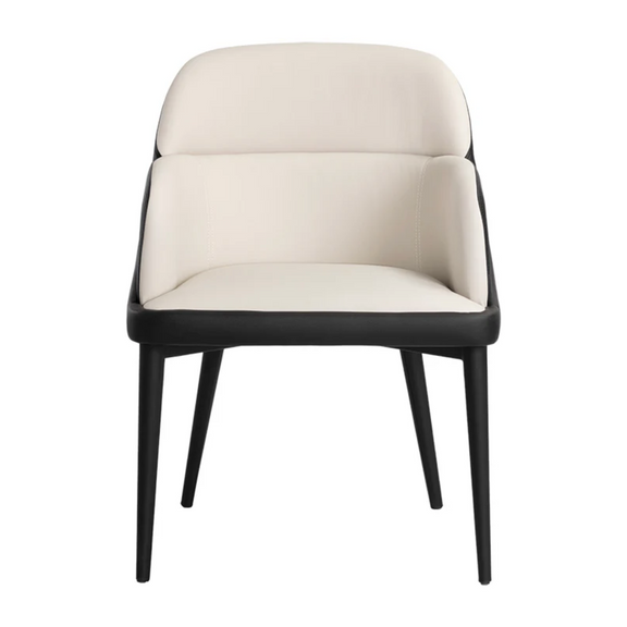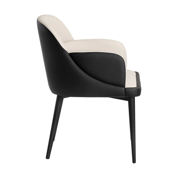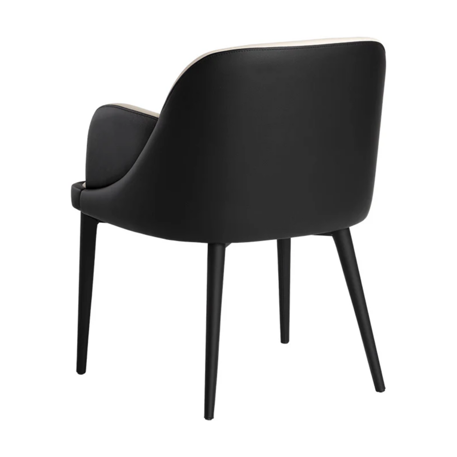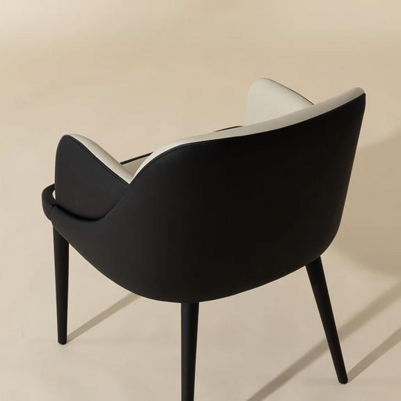 A futuristic dining armchair featuring a modular inspired seat, upholstered in contrasting dillon cream and dillon black faux leather. Handle With Care: This design has been crafted with faux leather. Faux leather is manufactured to reflect the natural characteristics of leather; as such, colour variations, markings, wrinkles, grooves, and light scratches are appreciated characteristics. No two pieces will be alike.