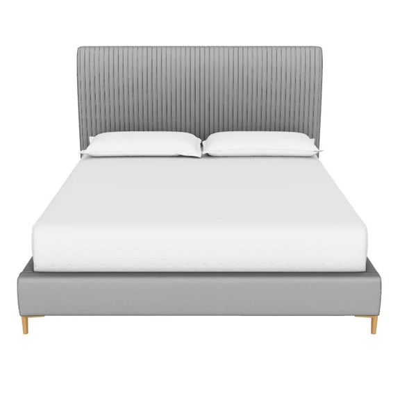 Add a touch of modern style to any bedroom space with this comfortable bed. Upholstered in casablanca storm performance fabric, and features fine vertical tufting on the headboard. Completed with stainless steel gold legs. No box spring is required and slats are included. Performance fabric is moisture repellent, durable and easy to clean.