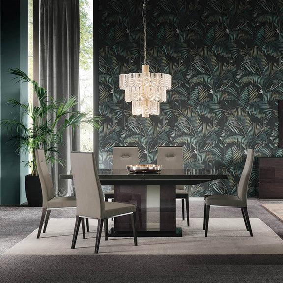 The Dark velvet finish and mirrored inserts make this collection unique. It is made up of table, chairs, sideboard, display cabinets and bookcase.
