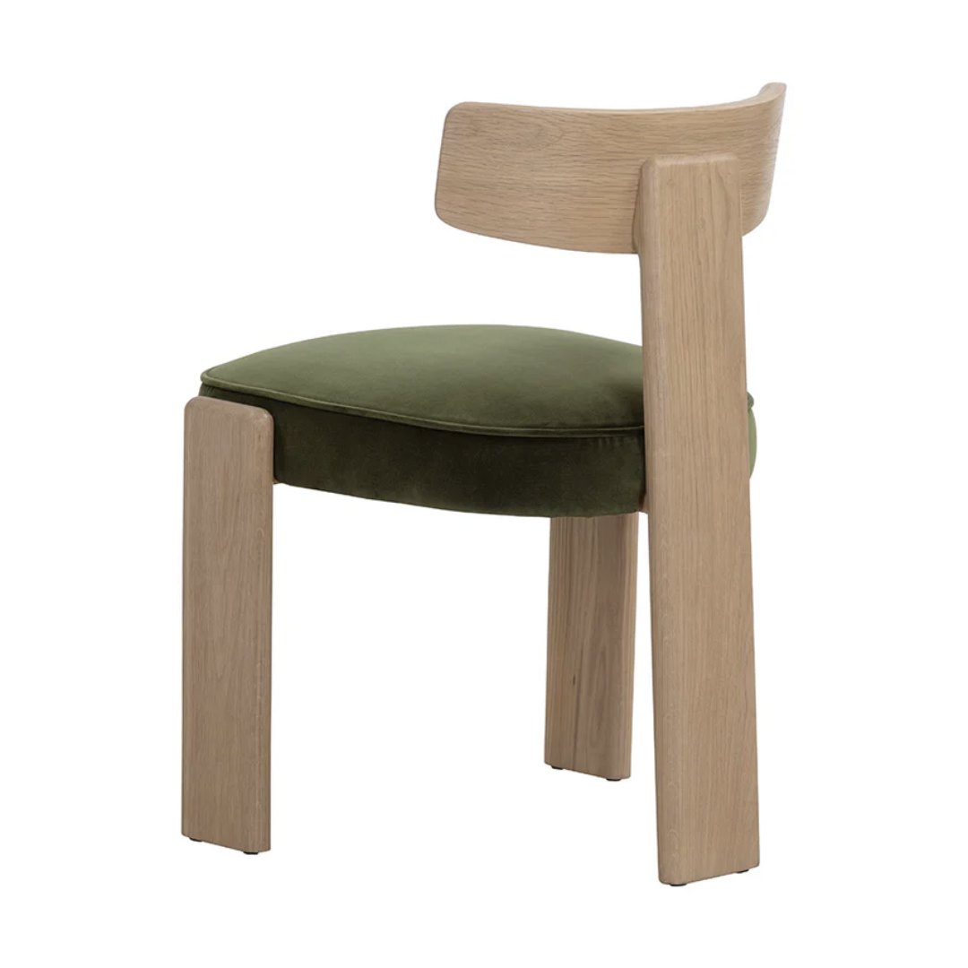 The Horton Dining Chair highlights the beauty of simplicity in contemporary design. A sculpted three-legged frame with a curved back constructed from rustic oak wood embraces the comfort of a beautiful seat upholstered in our forest green fabric. As wood is an organic, porous material, these pieces will contain natural variation of texture and may also exhibit fine indentations and cracks. Wood pieces will also display a disparity of color and grain, and visible knots and burls that add to the character of each piece.