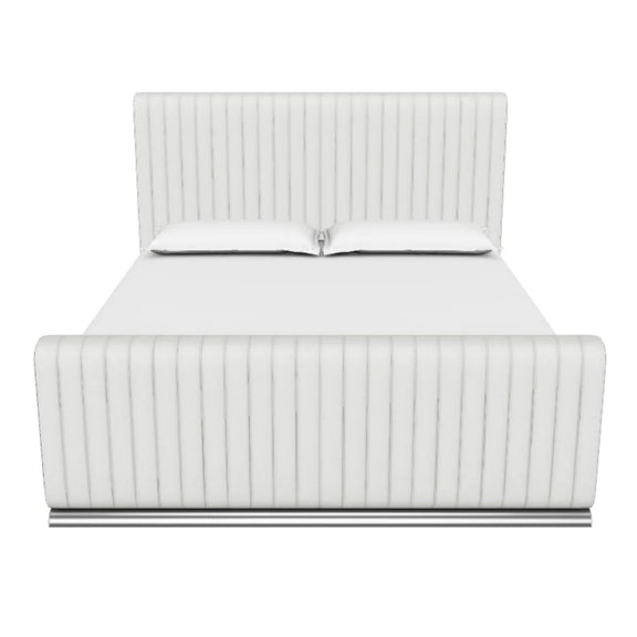 This elegant and contemporary platform bed features a beautiful channel tufted headboard and footboard. Stocked in our stunning hemingway marble fabric with a polished stainless steel frame. No box spring is required and folding slats are included.