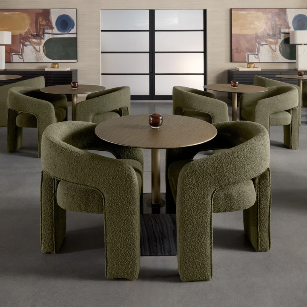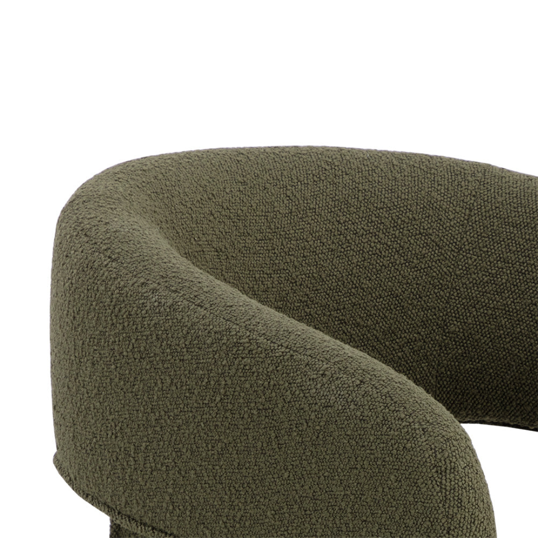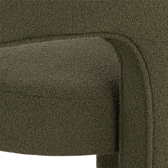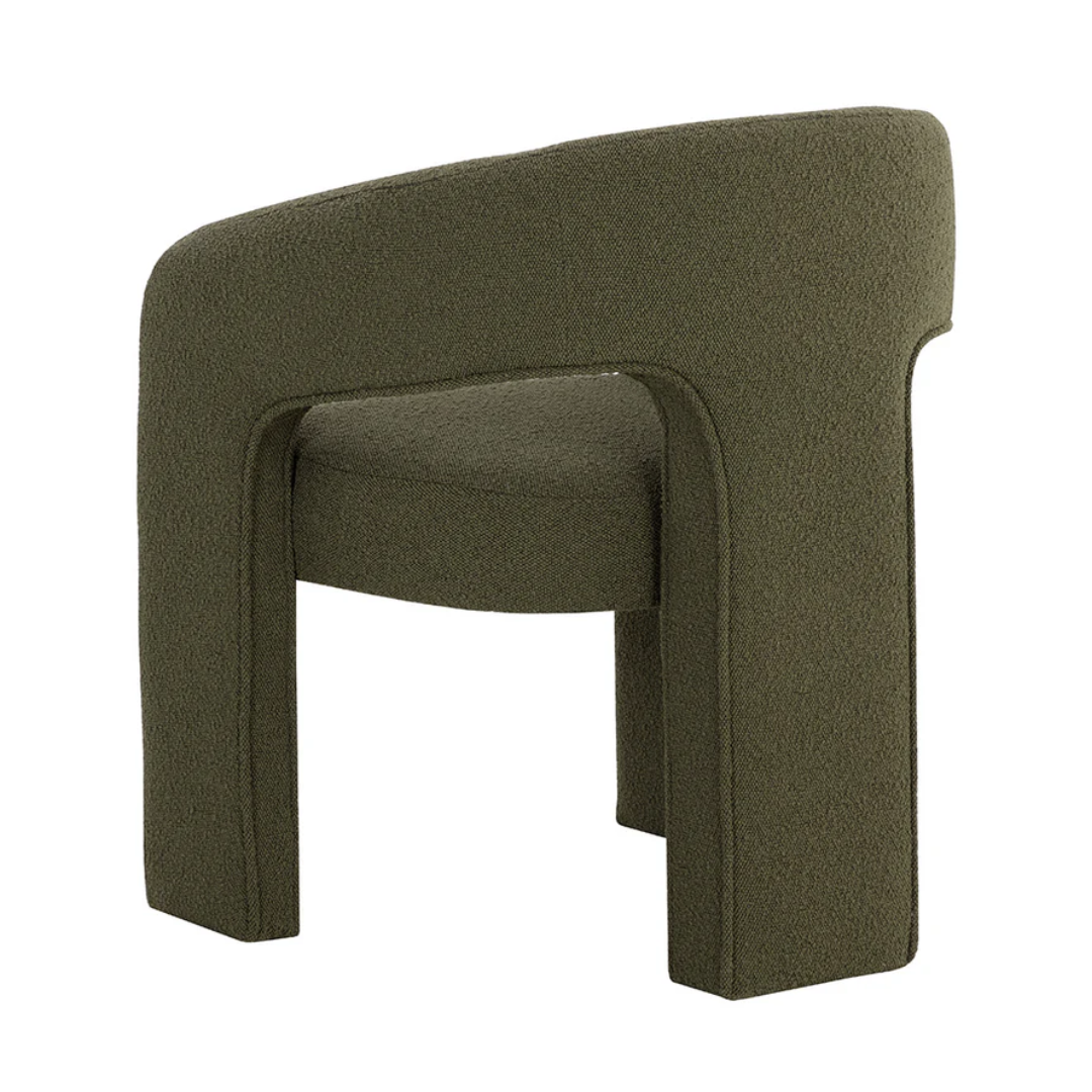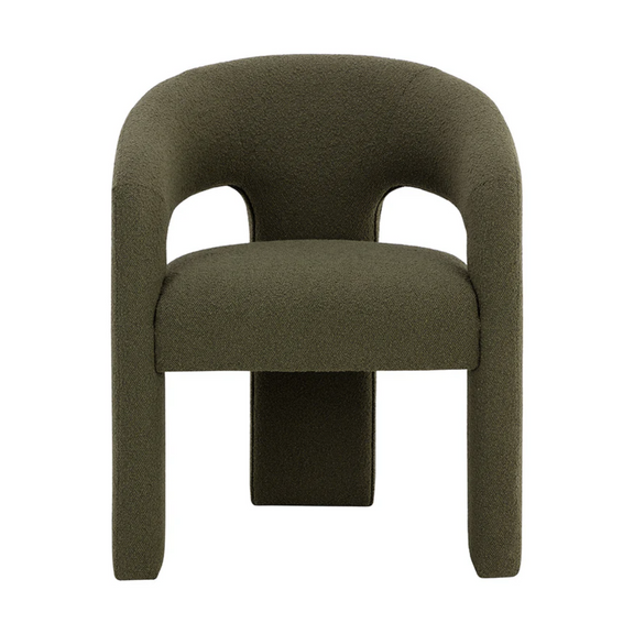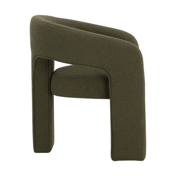Clean lines and contoured arches add style and structure to this contemporary dining chair. Features a curved backrest and open back for optimal comfort. Eye-catching from all angles. Fully upholstered in Copenhagen olive fabric.