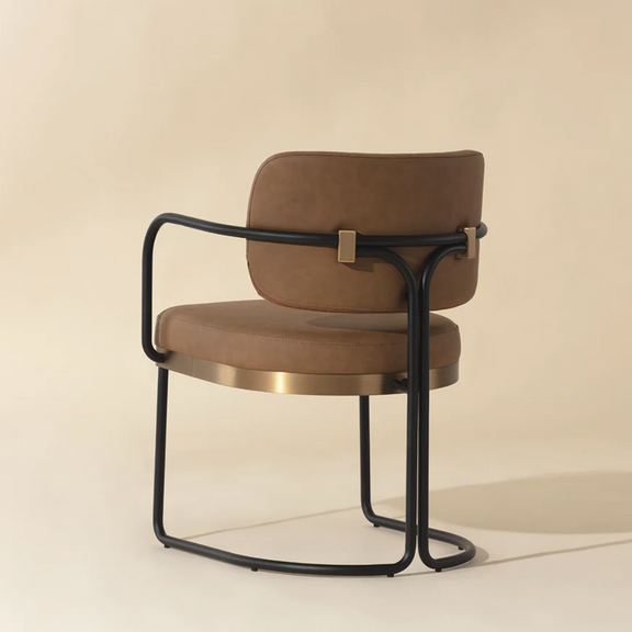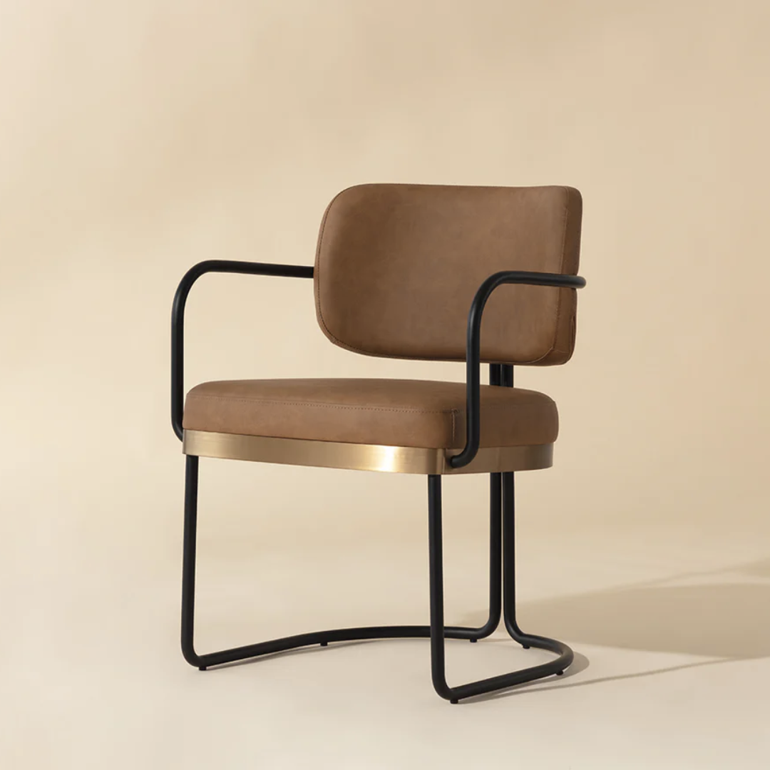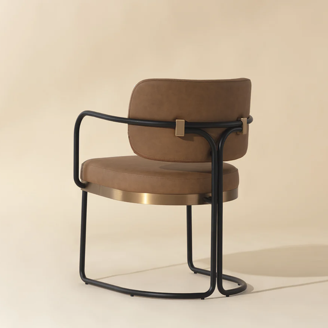 The Jalen Dining Armchair is poised to be a guest favourite thanks to its free flowing curves and gold stainless steel accents. Made from powder-coated iron with a supportive seat and back upholstered in high performance faux leather, this armchair will fit into any residential or commercial setting.